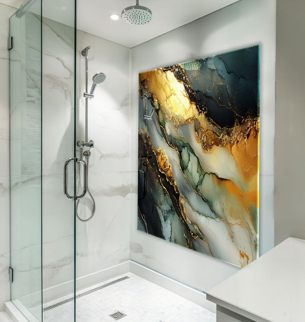 Elevate your culinary space with Golden Veins, a stunning abstract glass kitchen backsplash that radiates elegance. This design features sweeping layers of emerald, charcoal, and ivory tones, enriched with brilliant metallic gold detailing. The fluid motion of the marbling evokes natural stone, while the shimmering accents bring in a luxurious, modern flair.