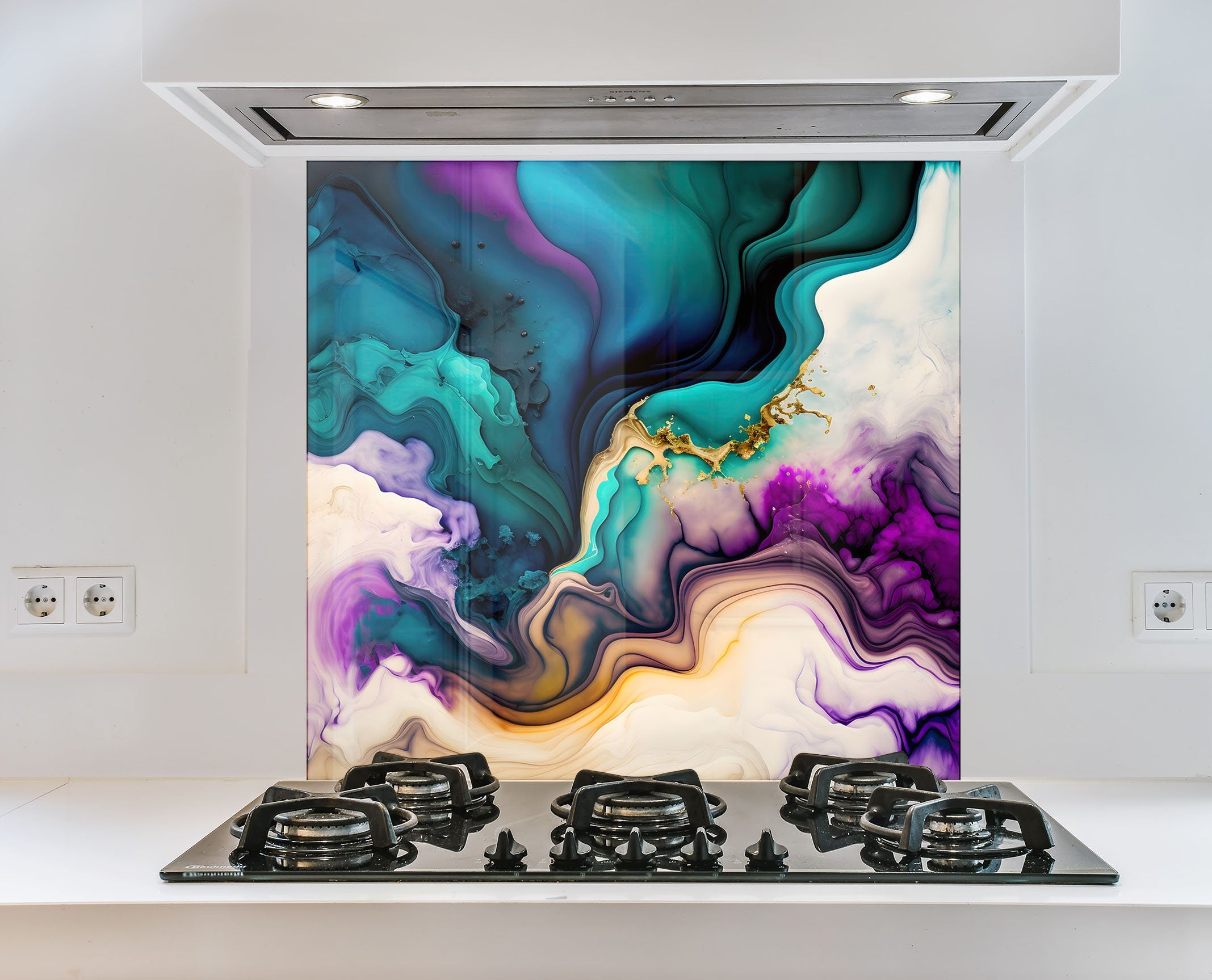 Transform your kitchen with the stunning Vibrant Fluid Art - Glass Kitchen Backsplash. Featuring 8K high-quality UV printing, this design showcases a bold mix of teal, purple, and gold swirls, bringing dynamic color and artistic flair to your space. The 10 times reinforced tempered glass (4mm) construction ensures superior durability, heat resistance, and a sleek, glossy finish that is easy to clean and maintain, making it the perfect choice for modern kitchens.