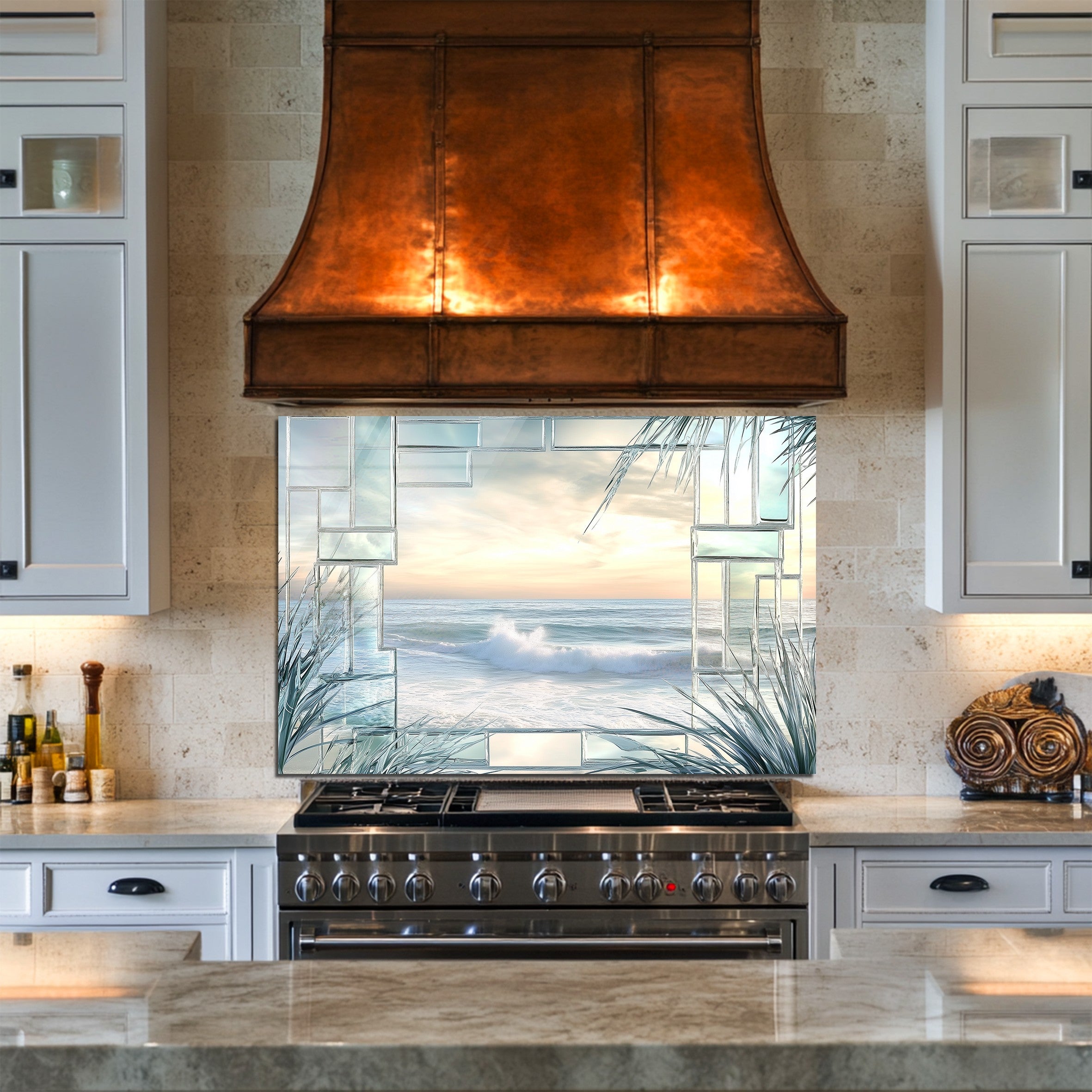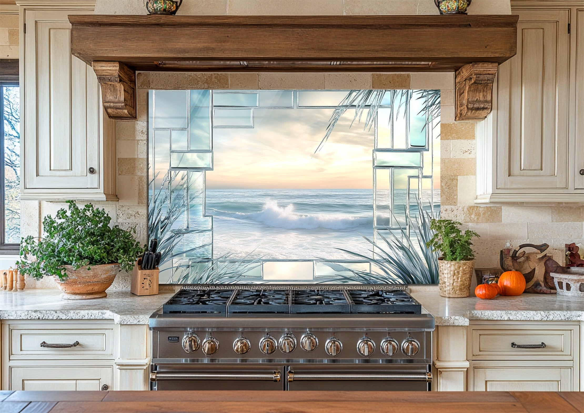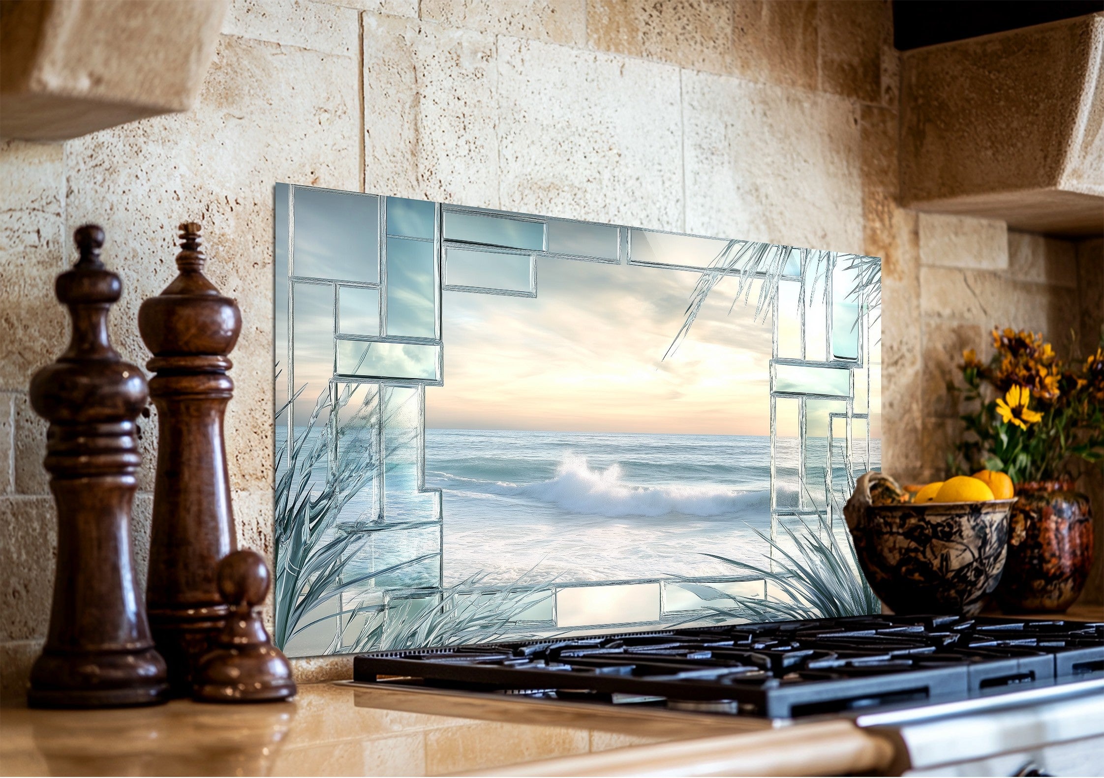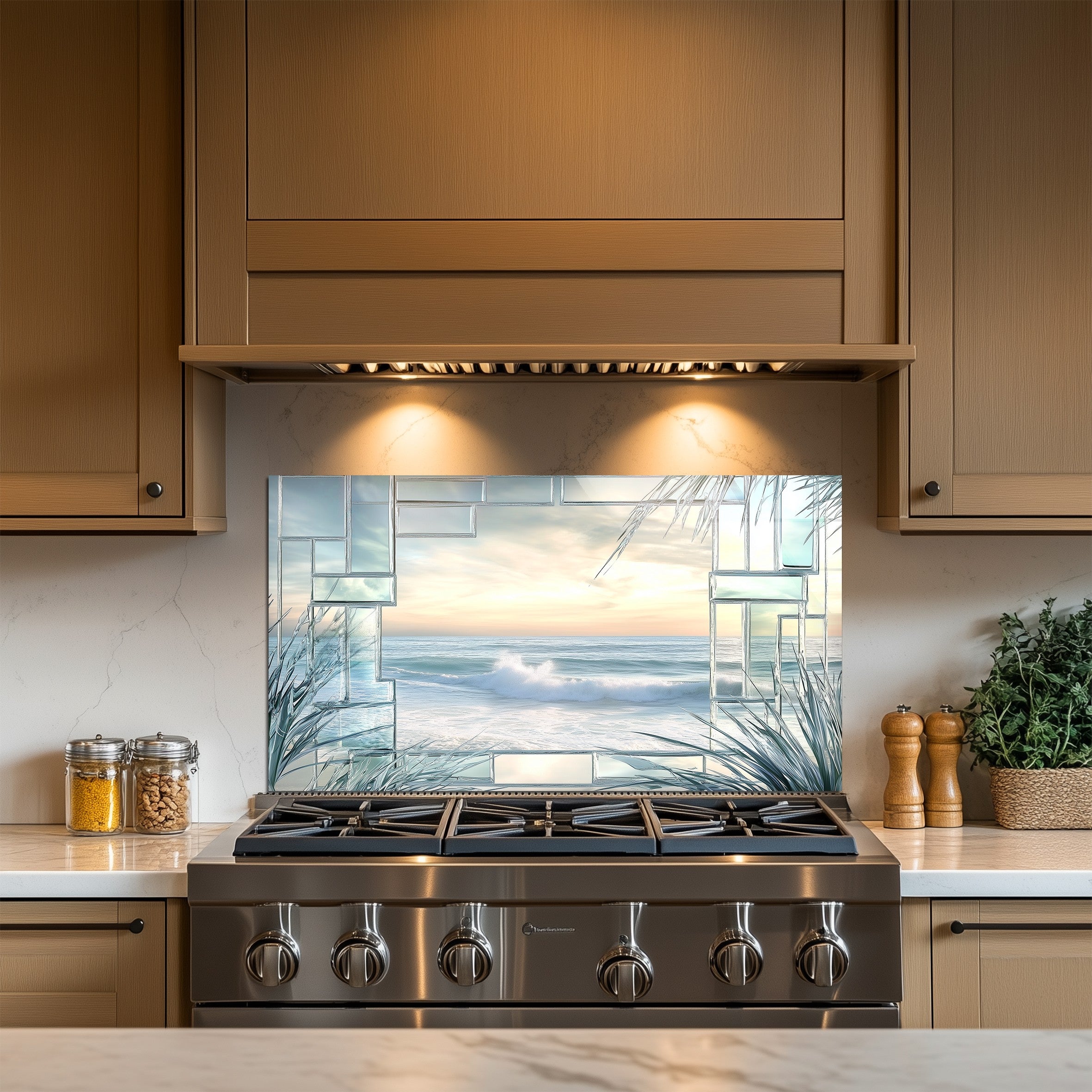 Transform your kitchen into a serene seaside retreat with Coastal Window Escape – Ocean View Glass Kitchen Backsplash Panel. This stunning design features a tranquil ocean horizon framed by geometric glass-like borders and delicate coastal grasses, creating the illusion of a window opening to the sea. The soft pastel sky, gentle waves, and airy composition bring calmness, freshness, and light into your kitchen space.