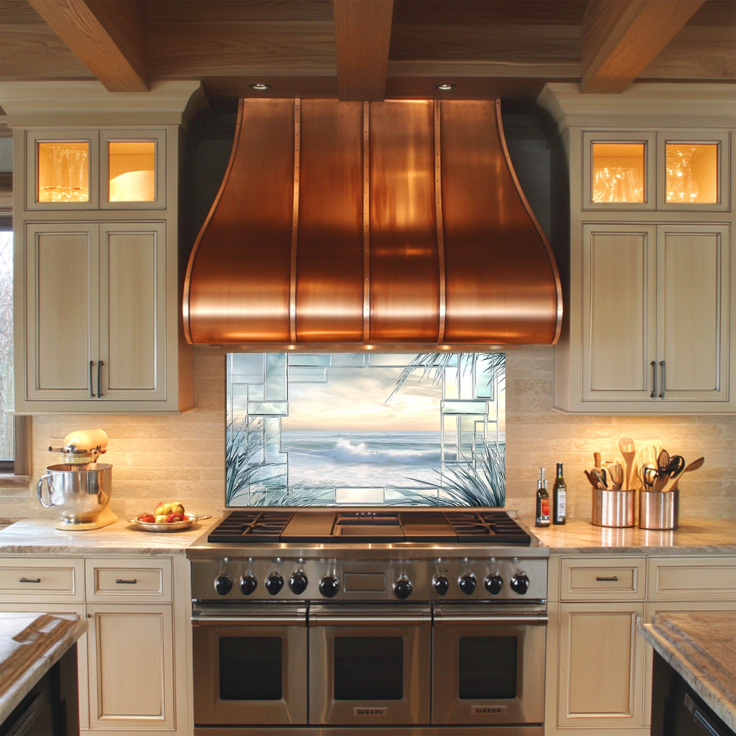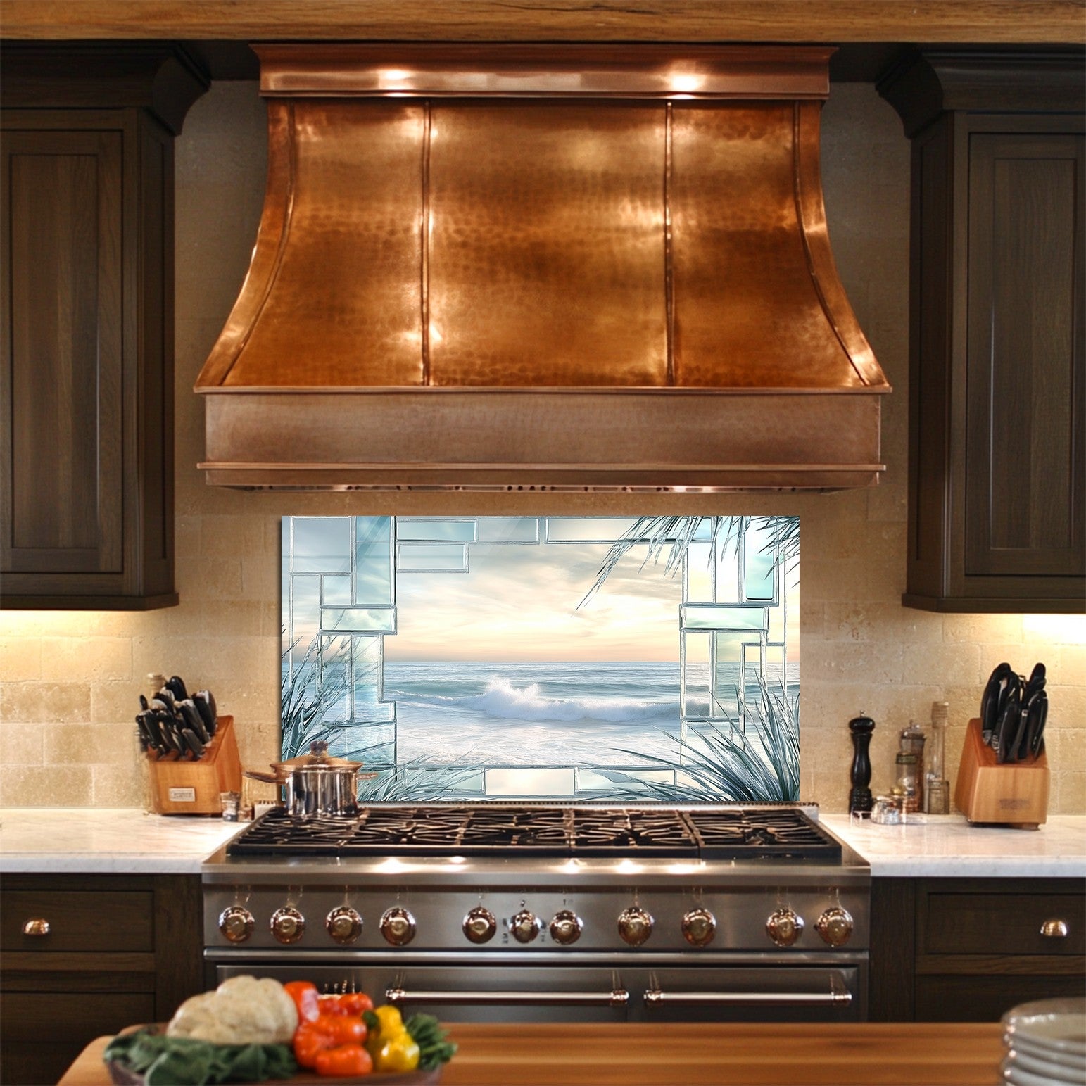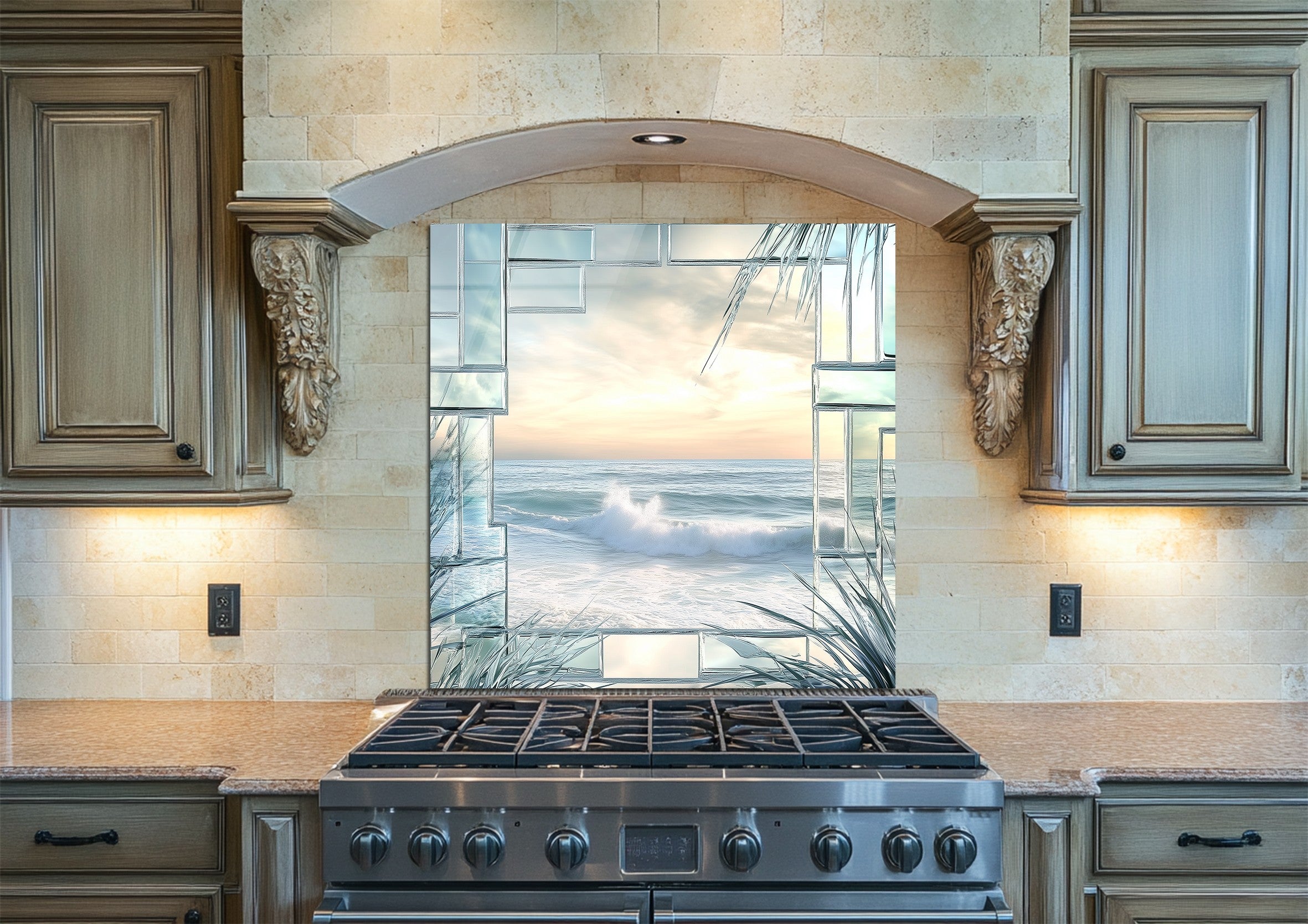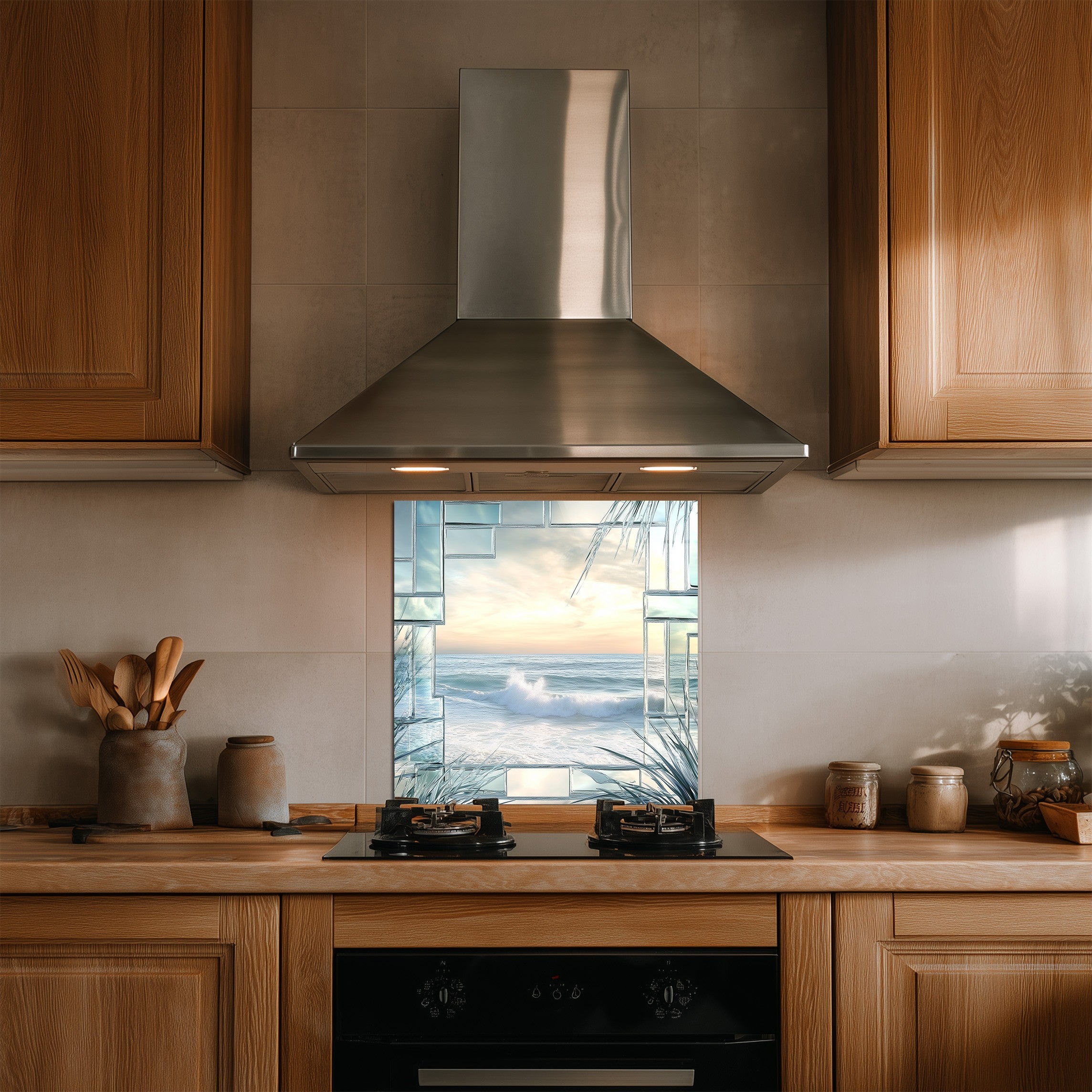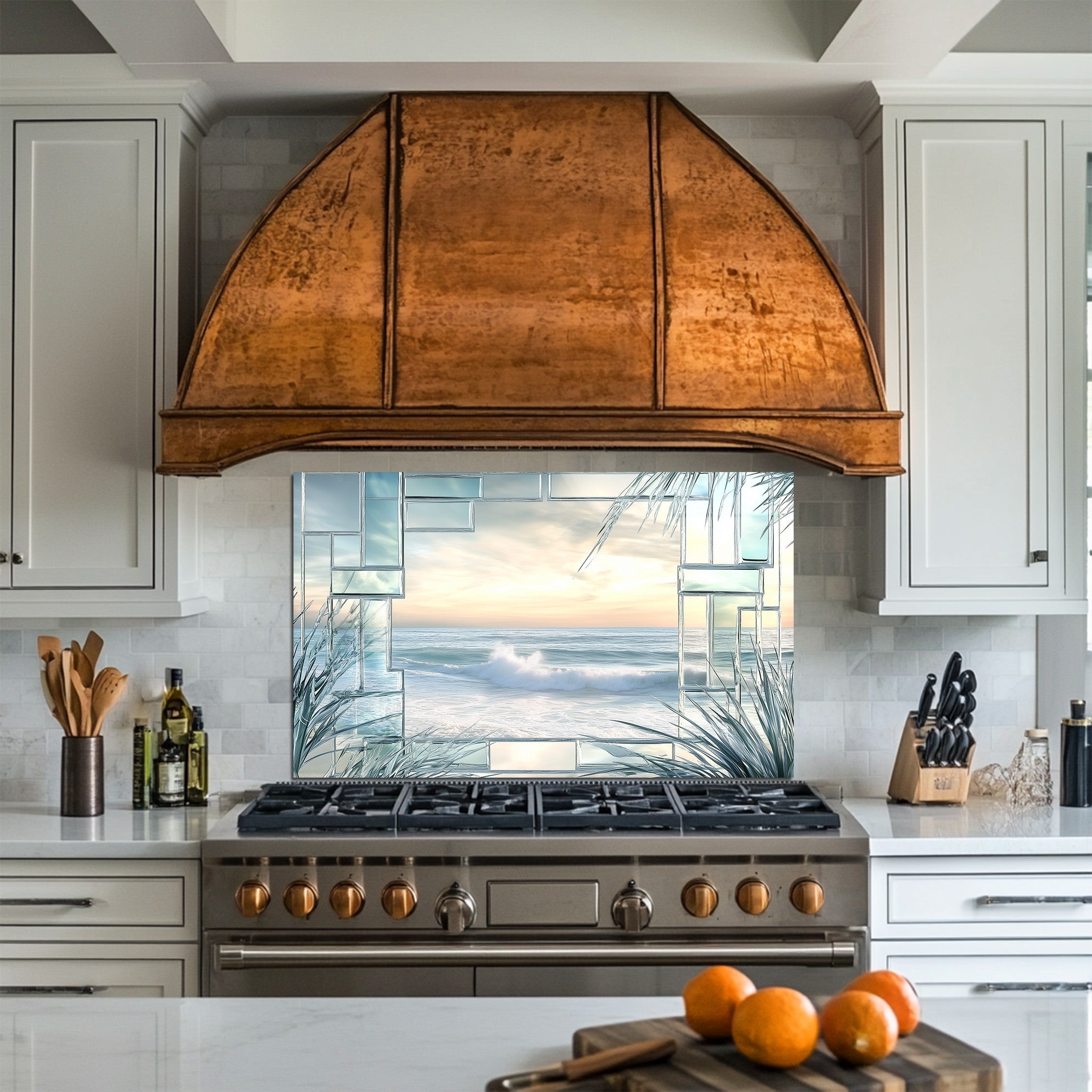 Transform your kitchen into a serene seaside retreat with Coastal Window Escape – Ocean View Glass Kitchen Backsplash Panel. This stunning design features a tranquil ocean horizon framed by geometric glass-like borders and delicate coastal grasses, creating the illusion of a window opening to the sea. The soft pastel sky, gentle waves, and airy composition bring calmness, freshness, and light into your kitchen space.