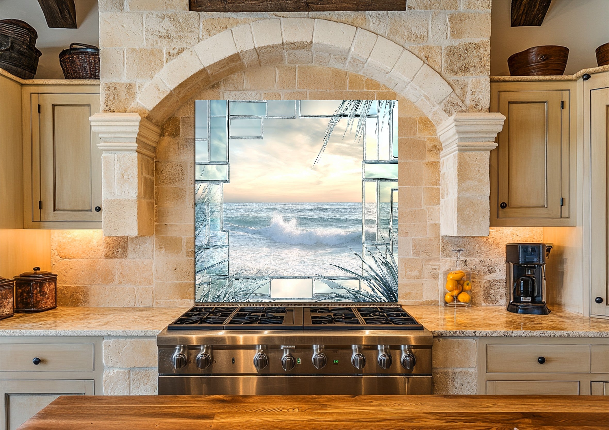 Coastal Window Escape – Ocean View Glass Kitchen Backsplash Panel