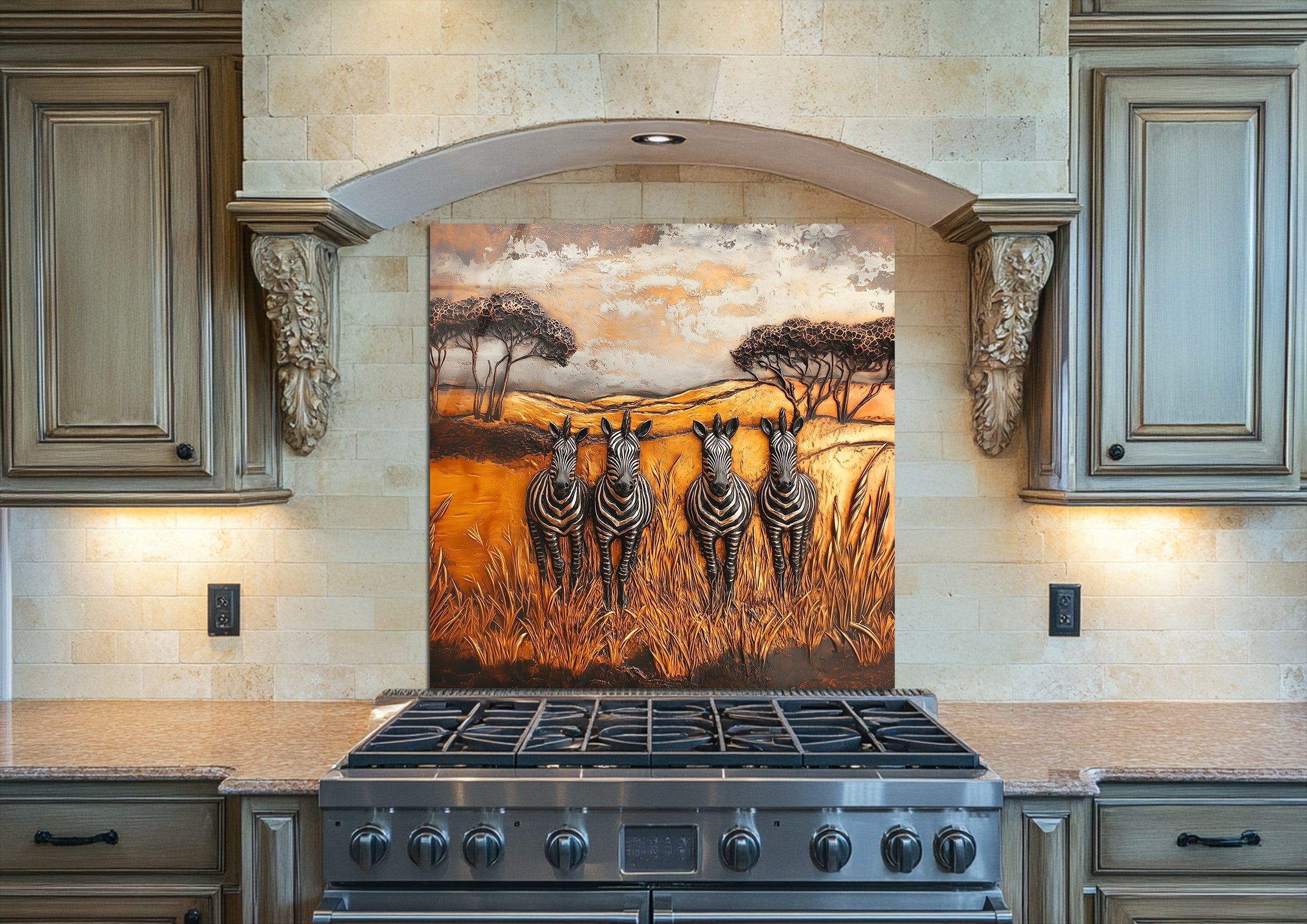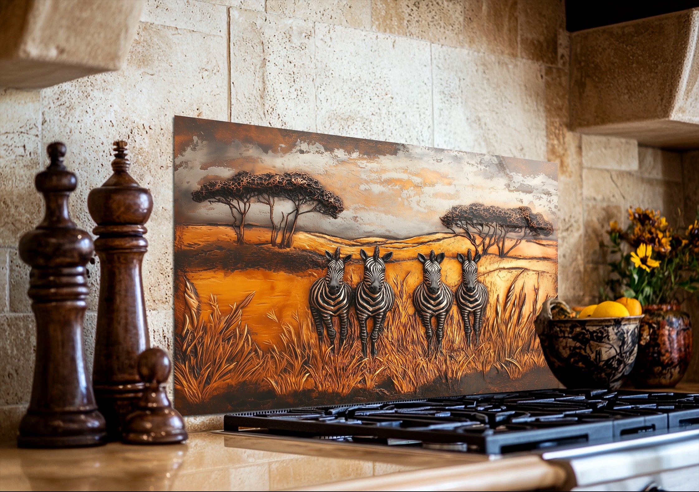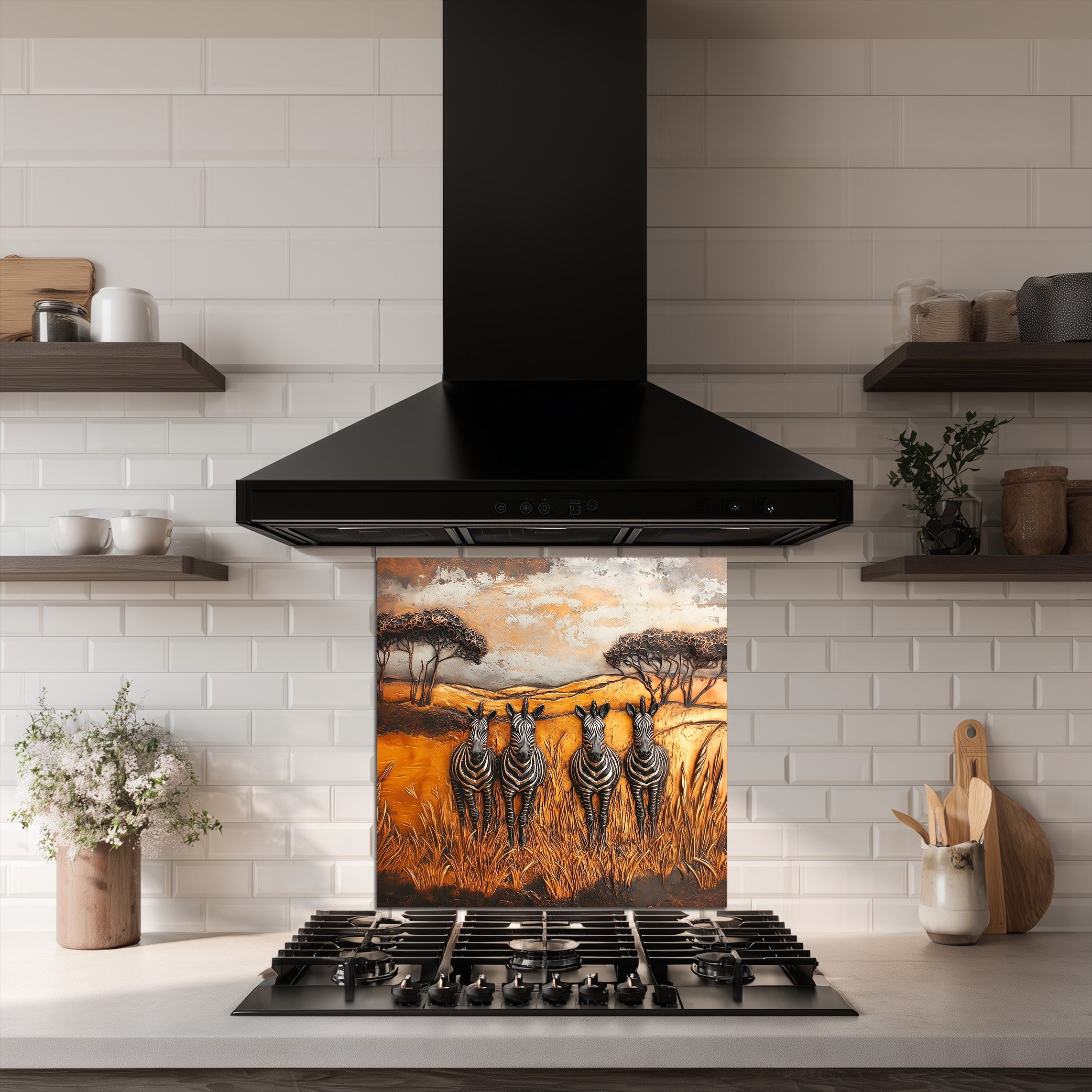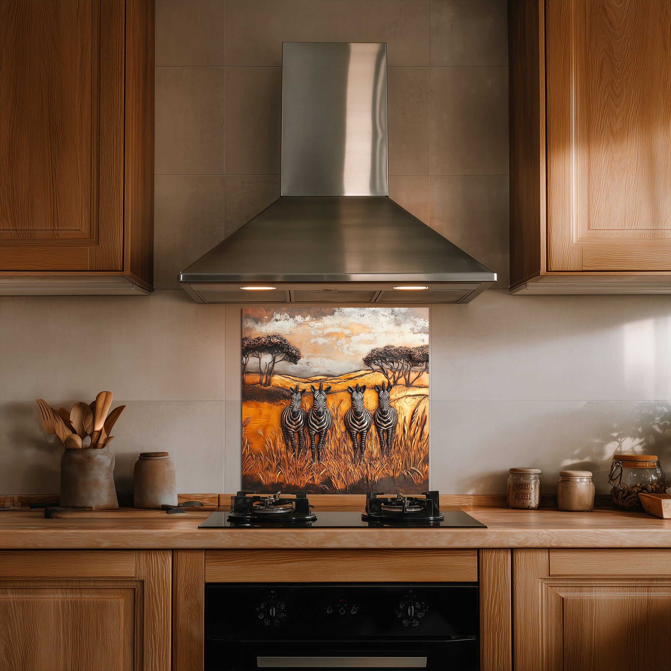 Inspired by African wilderness aesthetics and timeless wildlife art, this glass kitchen backsplash panel transforms your kitchen into a story-driven focal point. Under natural or artificial lighting, the tempered glass surface enhances color richness and texture, reflecting light softly to create a warm, inviting atmosphere ideal for kitchens designed to be lived in and shared.