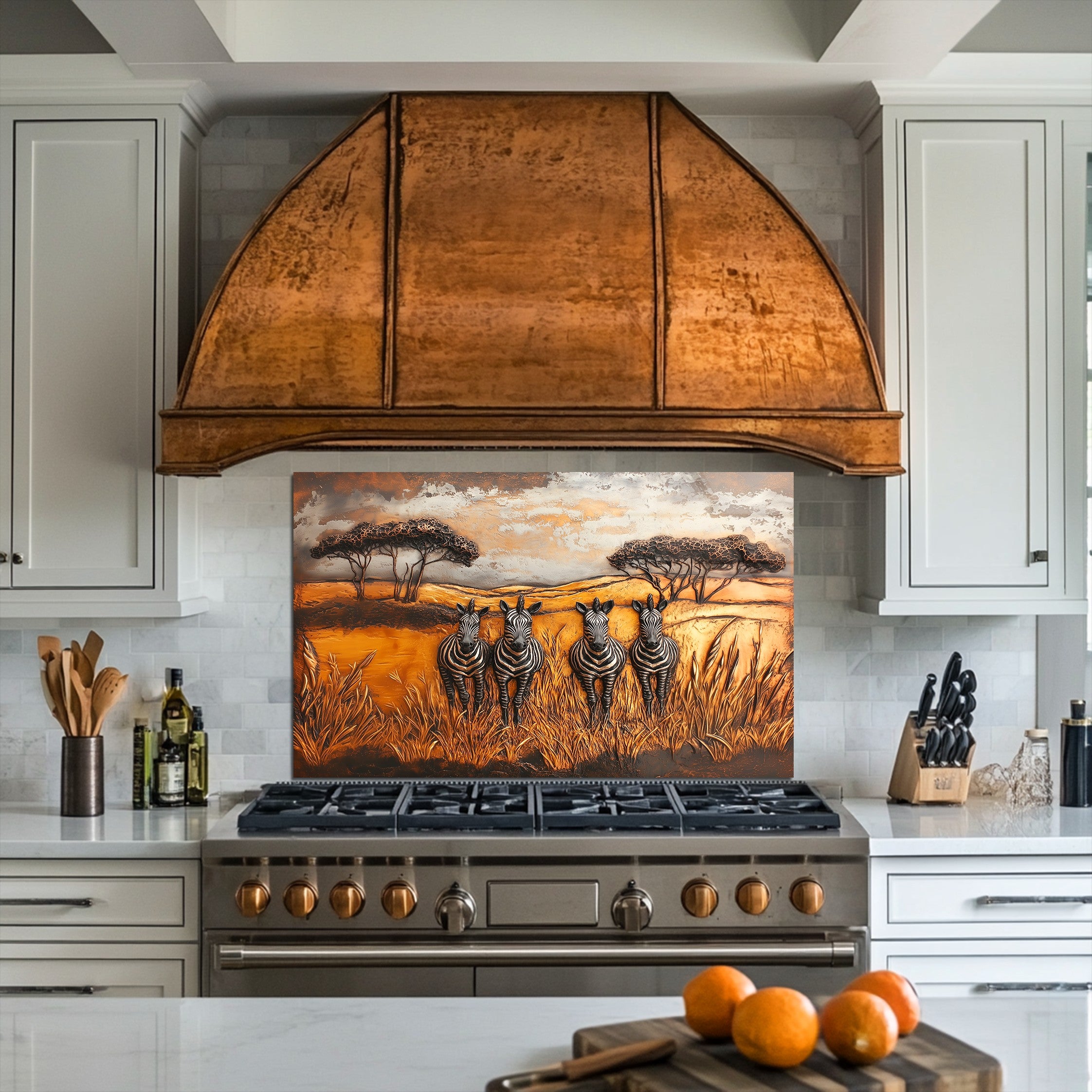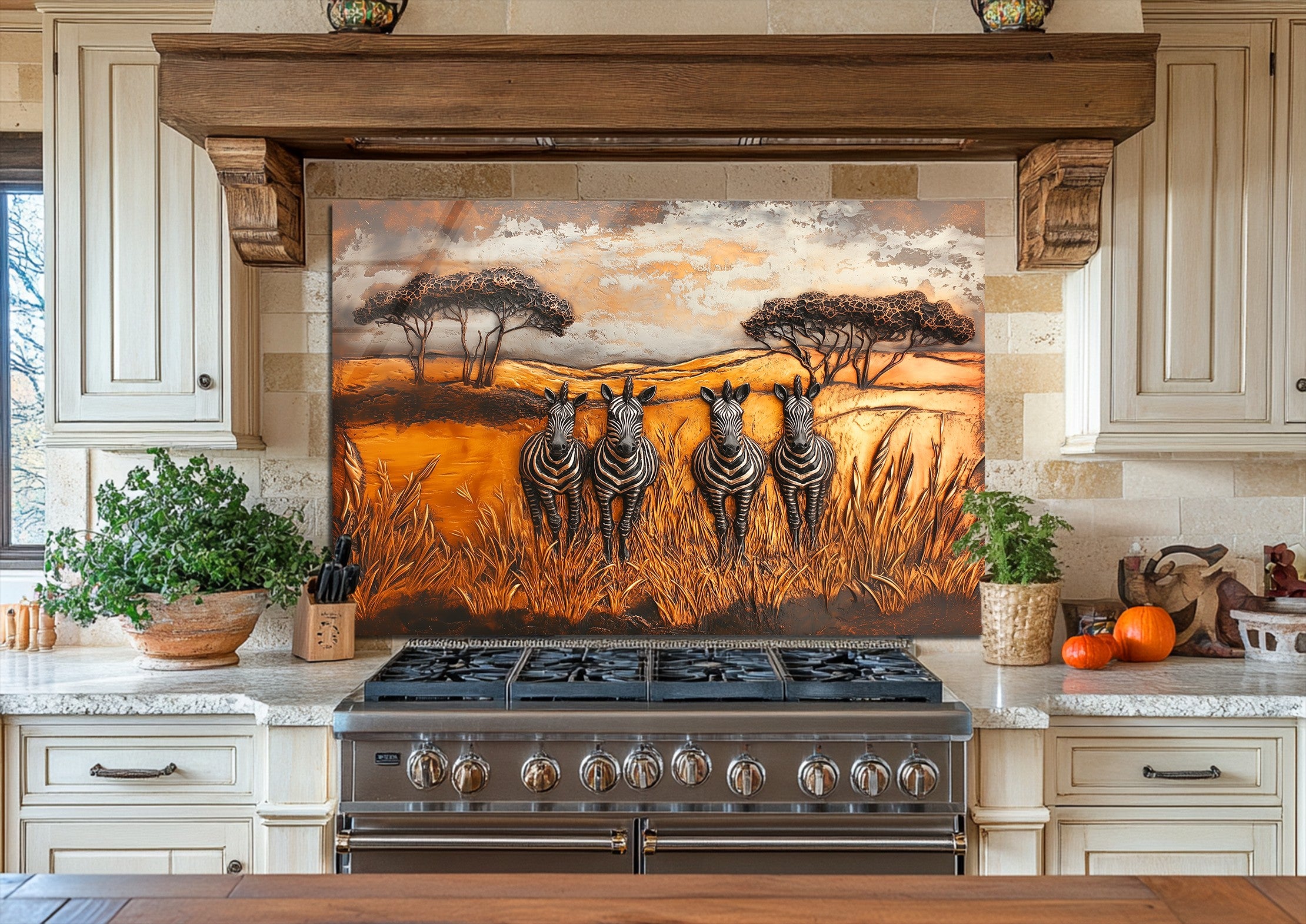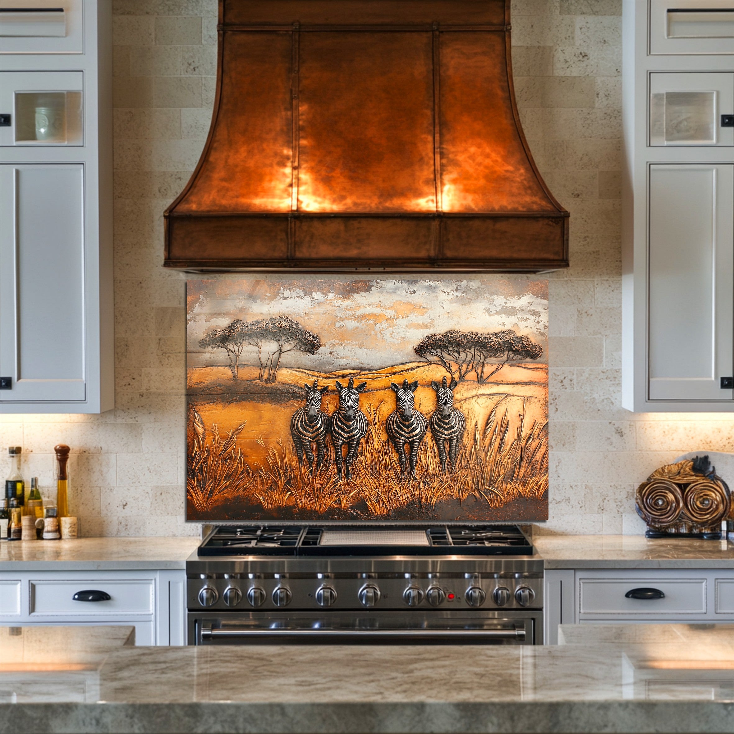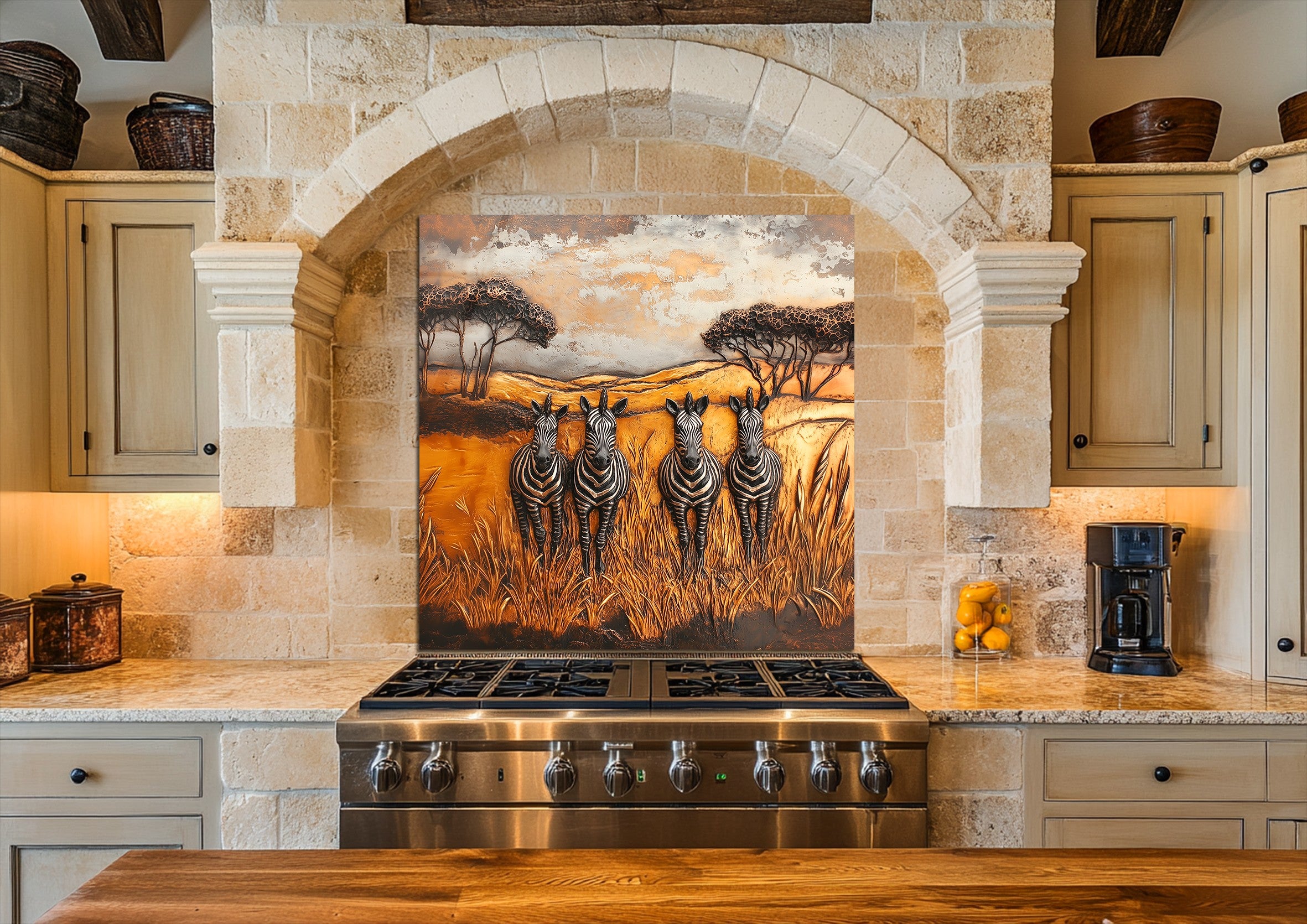 Inspired by African wilderness aesthetics and timeless wildlife art, this glass kitchen backsplash panel transforms your kitchen into a story-driven focal point. Under natural or artificial lighting, the tempered glass surface enhances color richness and texture, reflecting light softly to create a warm, inviting atmosphere ideal for kitchens designed to be lived in and shared.