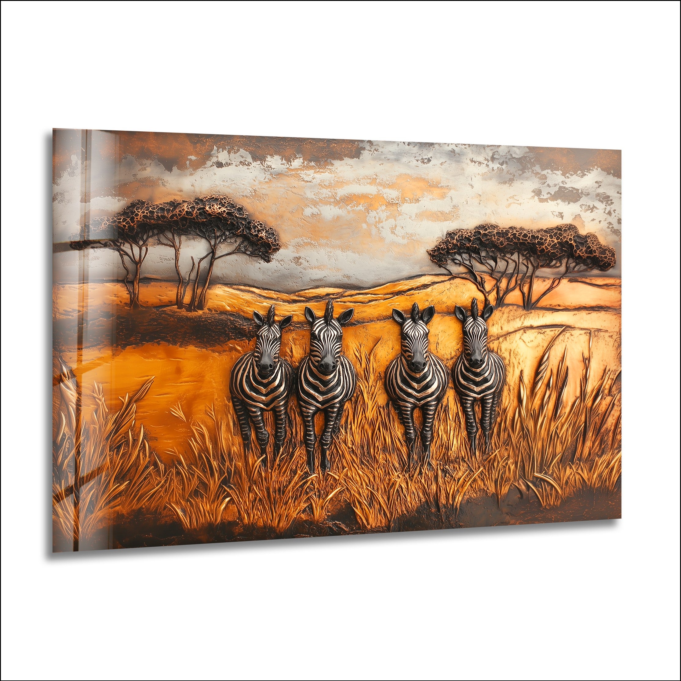 The warm amber, bronze, and earthy ochre tones blend seamlessly with the bold black-and-white stripes of the zebras, producing a striking visual contrast that immediately draws the eye. The balanced composition evokes harmony, unity, and the quiet strength of wildlife moving together across open landscapes. Every detail—from the textured grasses to the soft horizon—adds depth and motion without overwhelming the space.