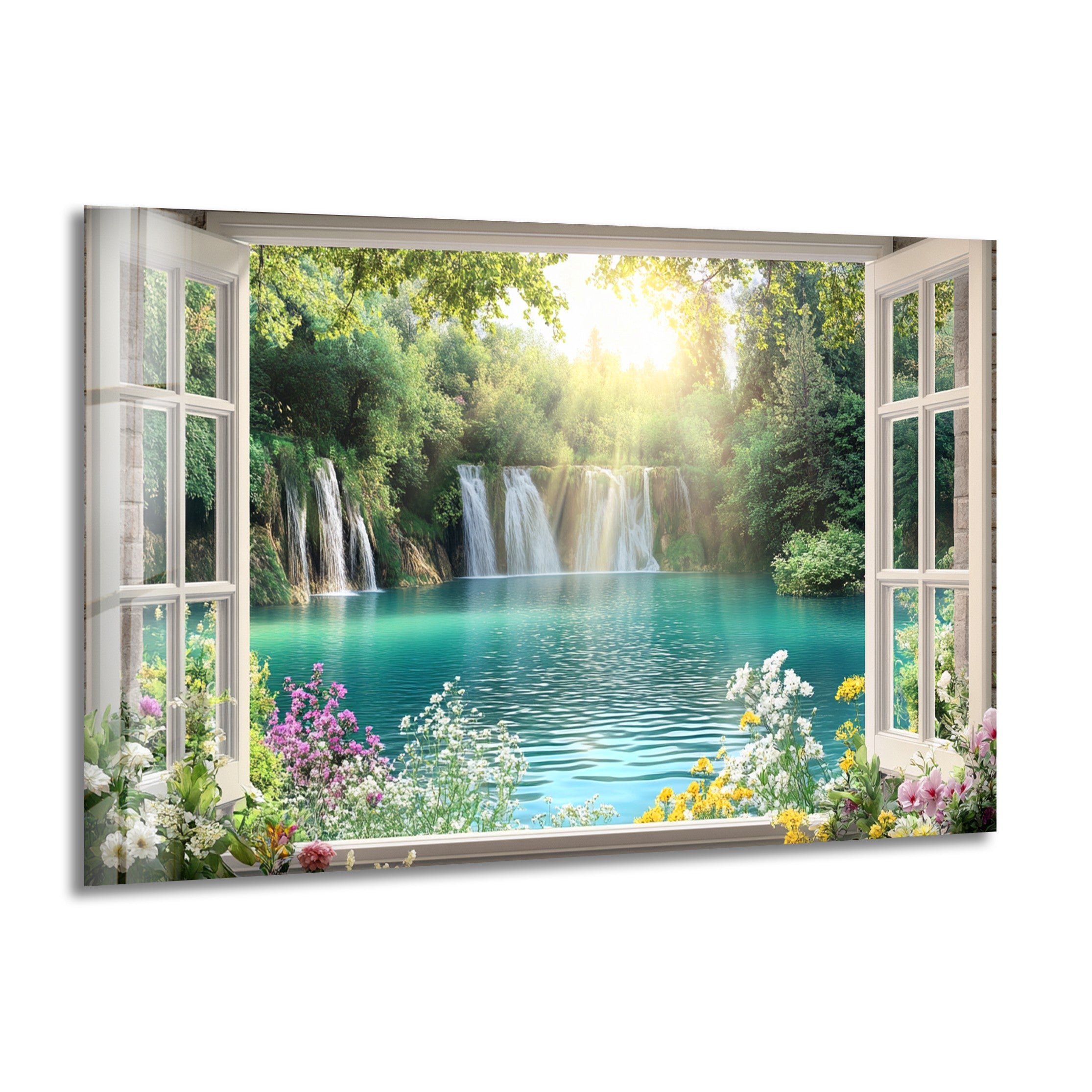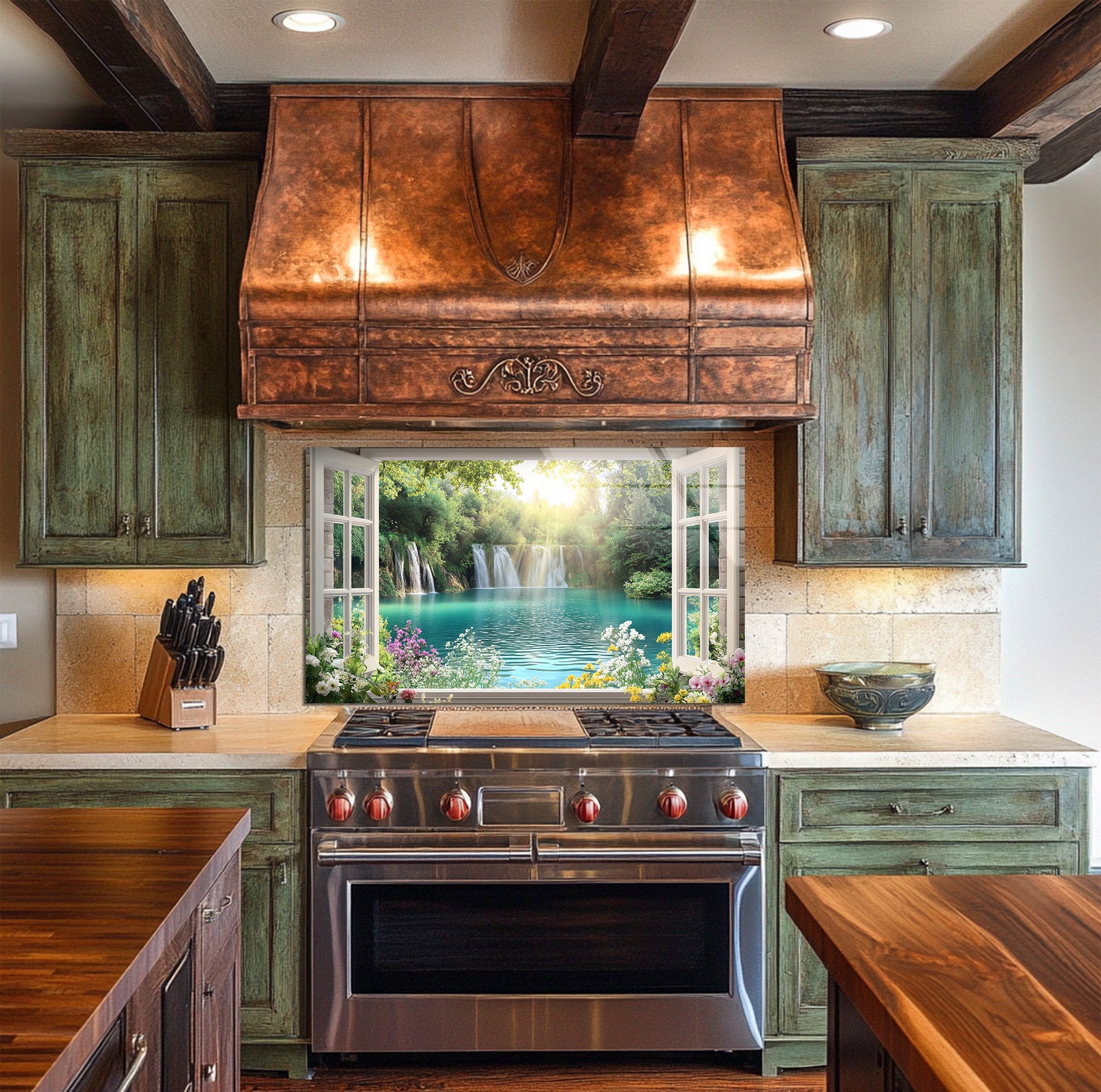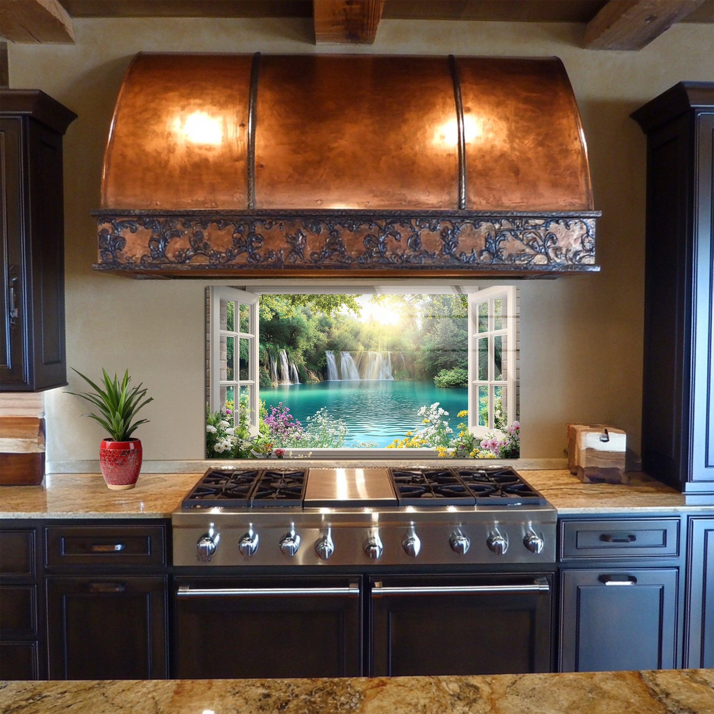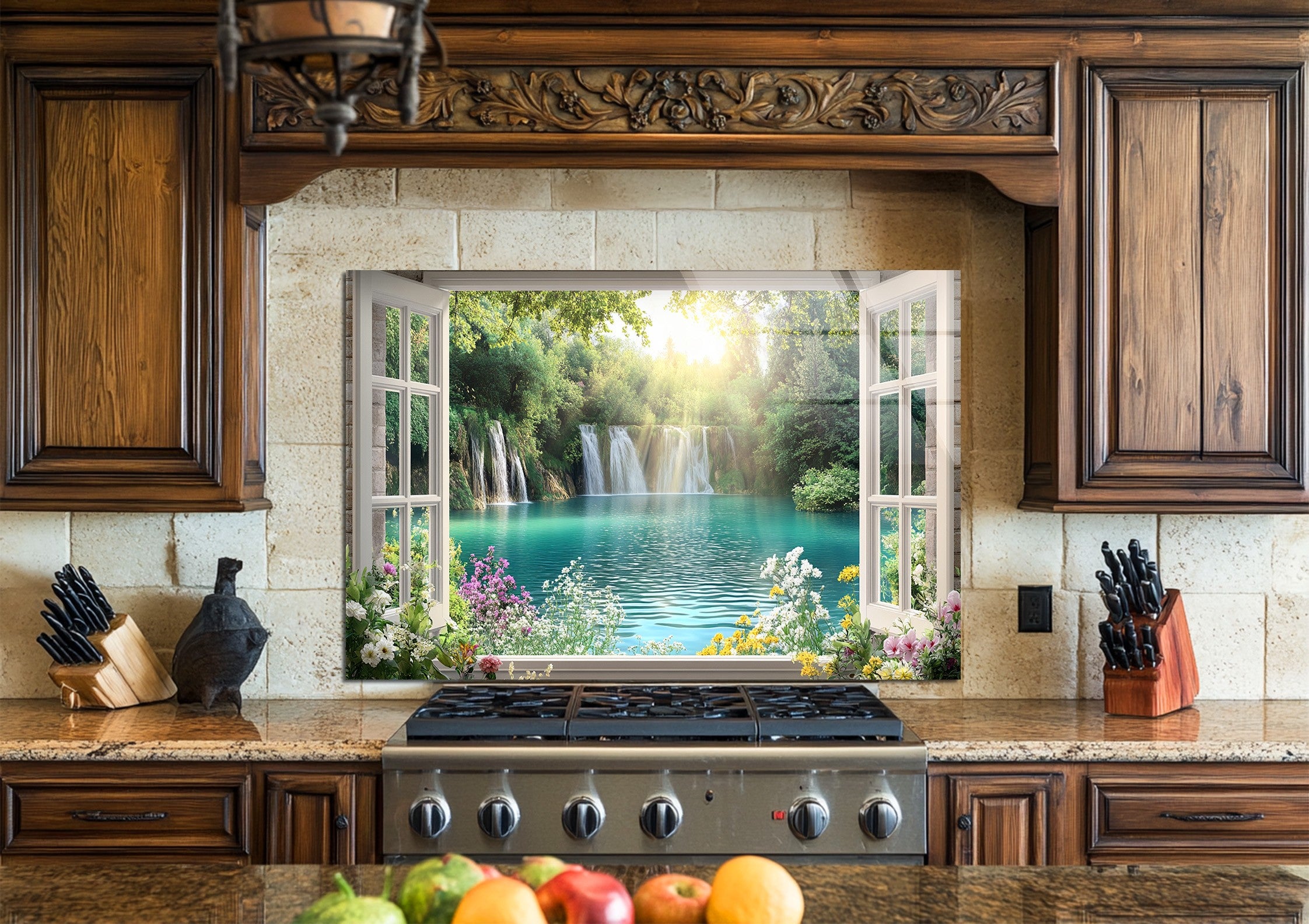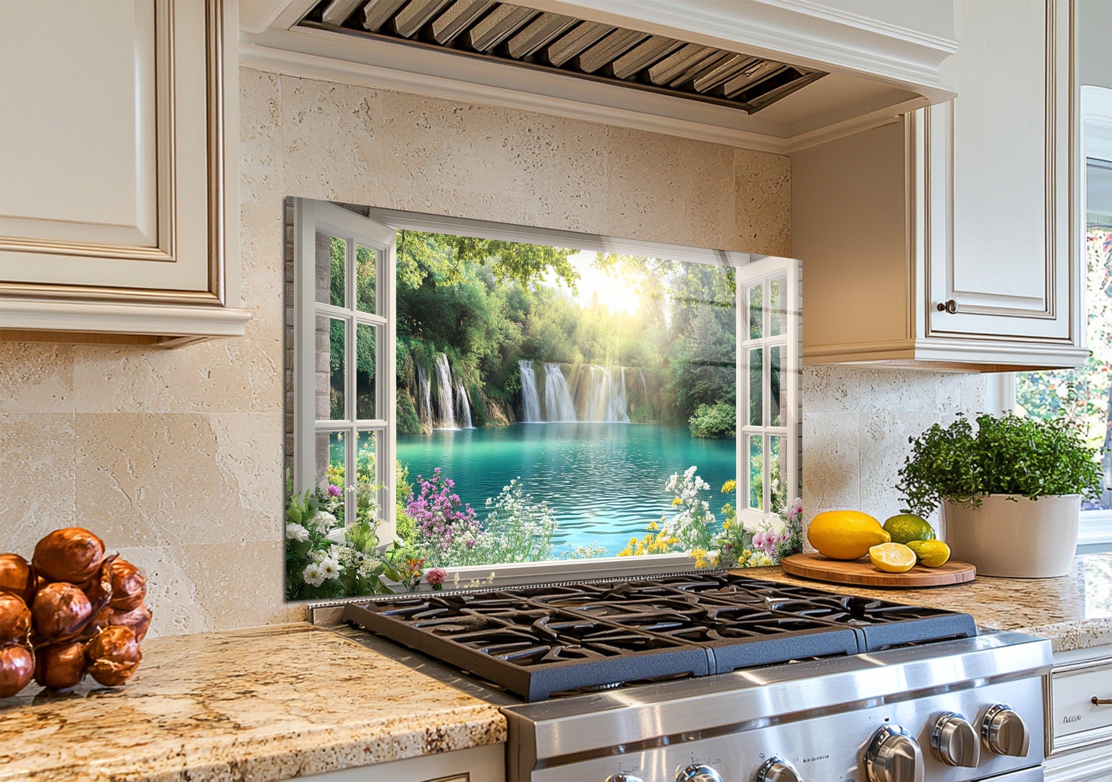 Bring a peaceful and refreshing outdoor atmosphere into your kitchen with Serene Waterfall Window View – Nature Landscape Glass Kitchen Backsplash. This stunning design features an open window framing a tranquil turquoise lake and cascading waterfalls surrounded by lush greenery and blooming flowers. Soft sunlight filtering through the trees creates a dreamy, relaxing landscape that adds depth, light, and a natural escape feeling to your kitchen.