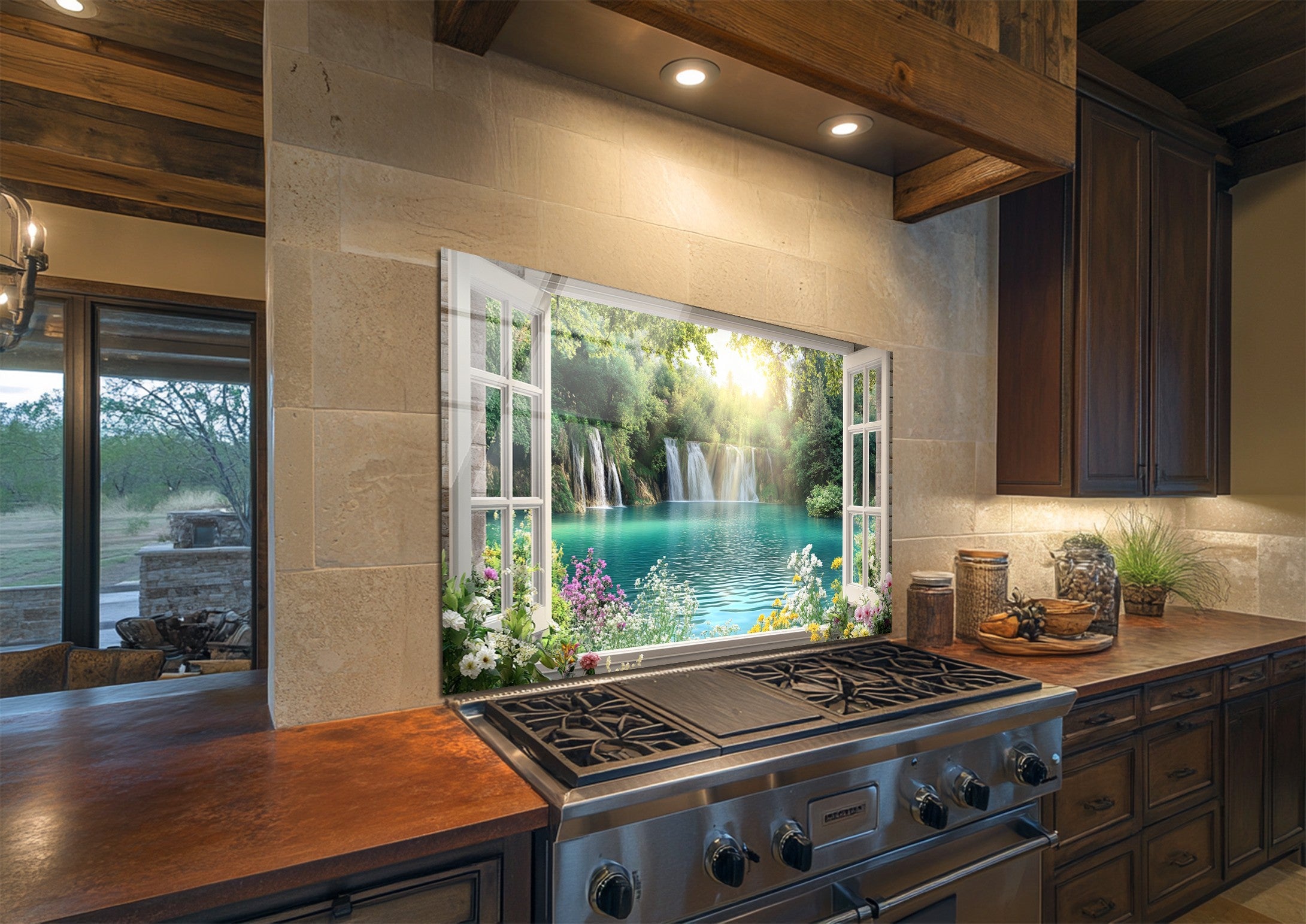 Serene Waterfall Window View – Nature Landscape Glass Kitchen Backsplash