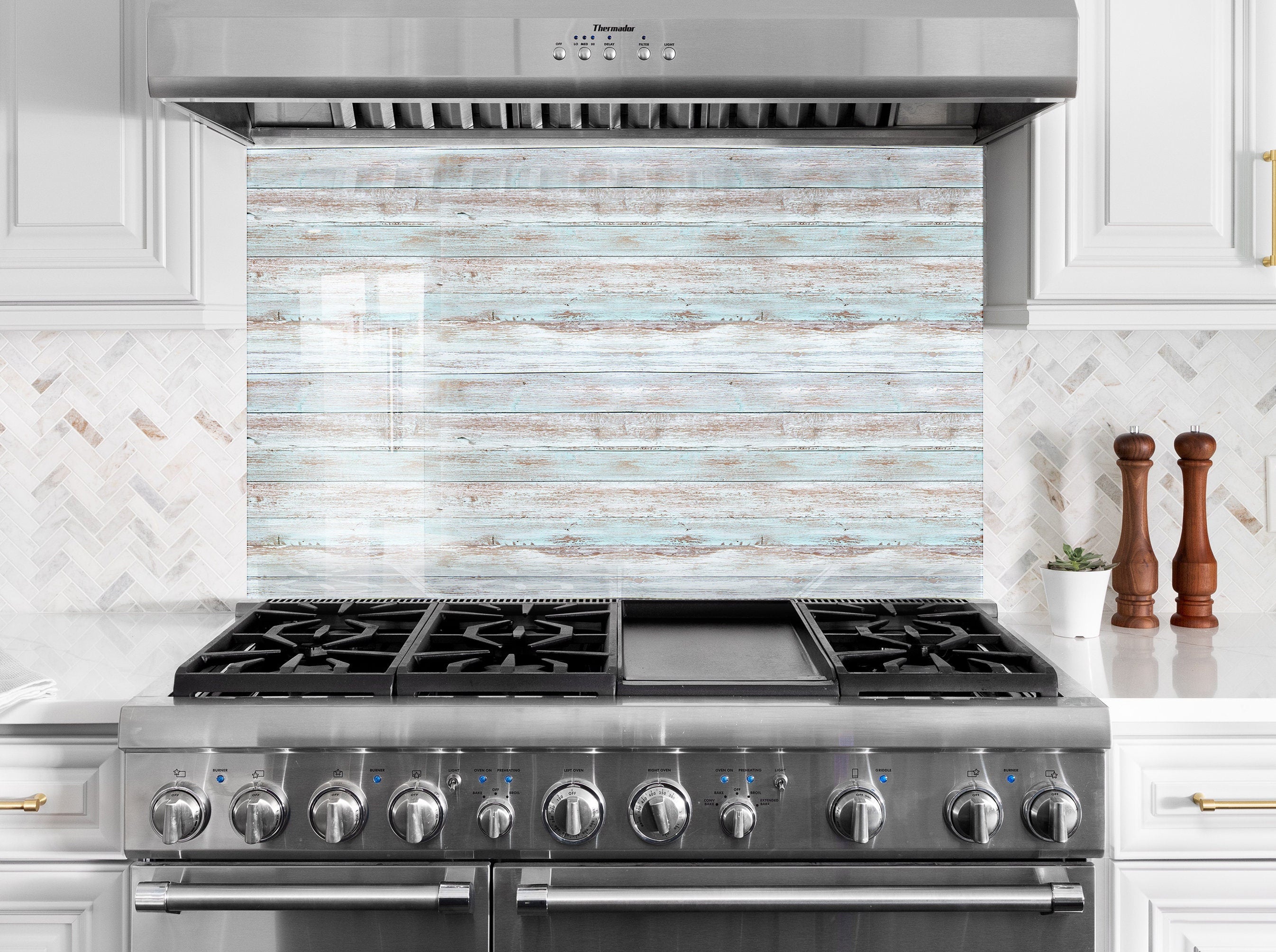 Bring the serene charm of the ocean into your kitchen with this Coastal Blue Weathered Wood Kitchen Backsplash. Featuring a distressed driftwood plank design, this tempered glass backsplash adds a calming, vintage coastal vibe while providing maximum protection against stains, grease, and heat.