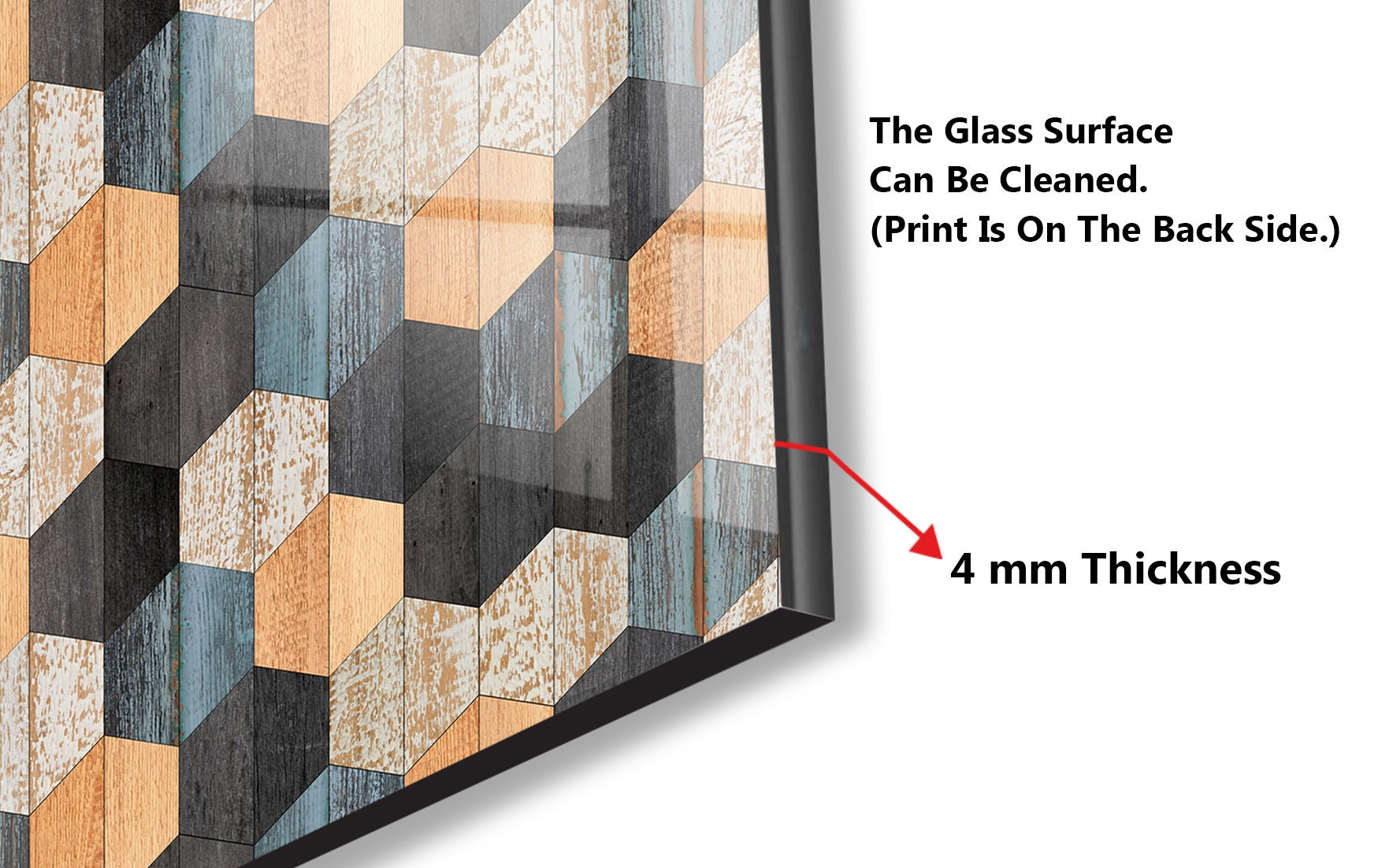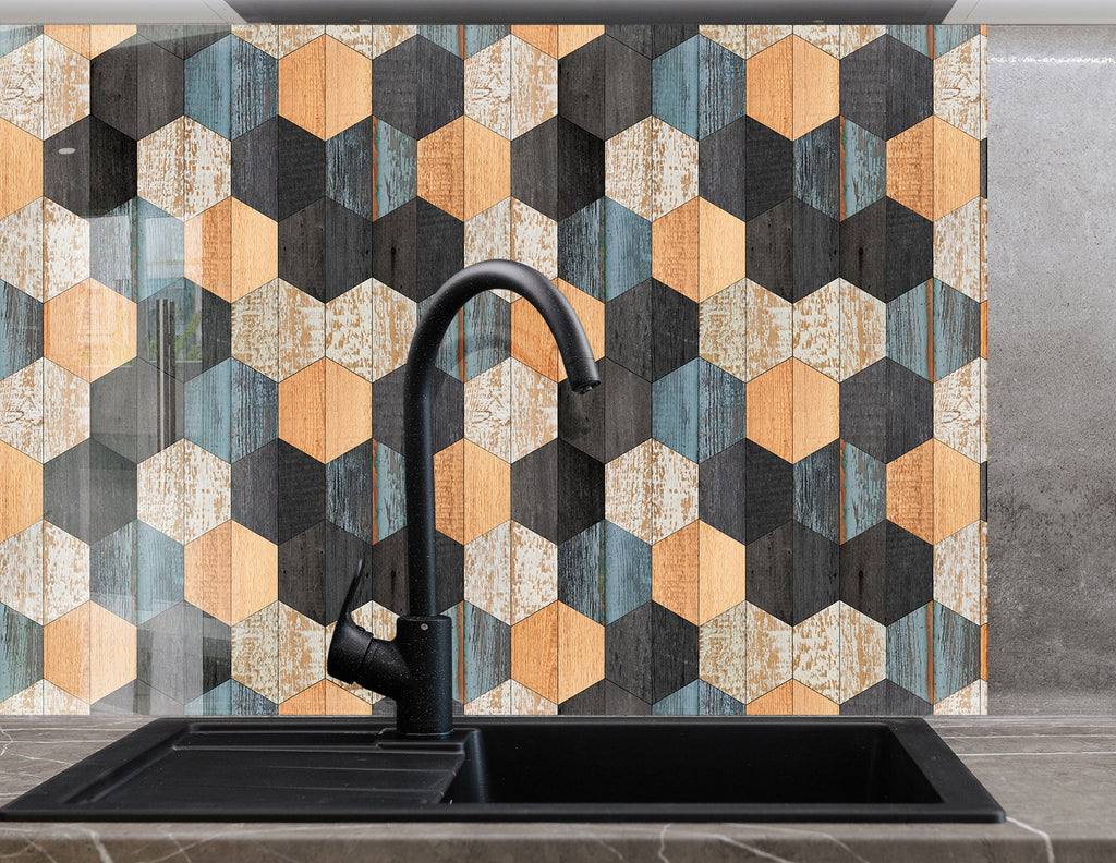 Transform your cooking space with this eye-catching Geometric Hexagon Kitchen Backsplash. Designed to blend modern style with rustic charm, this backsplash features a 3D illusion of wooden hexagons in warm tones of blue, black, and natural wood.