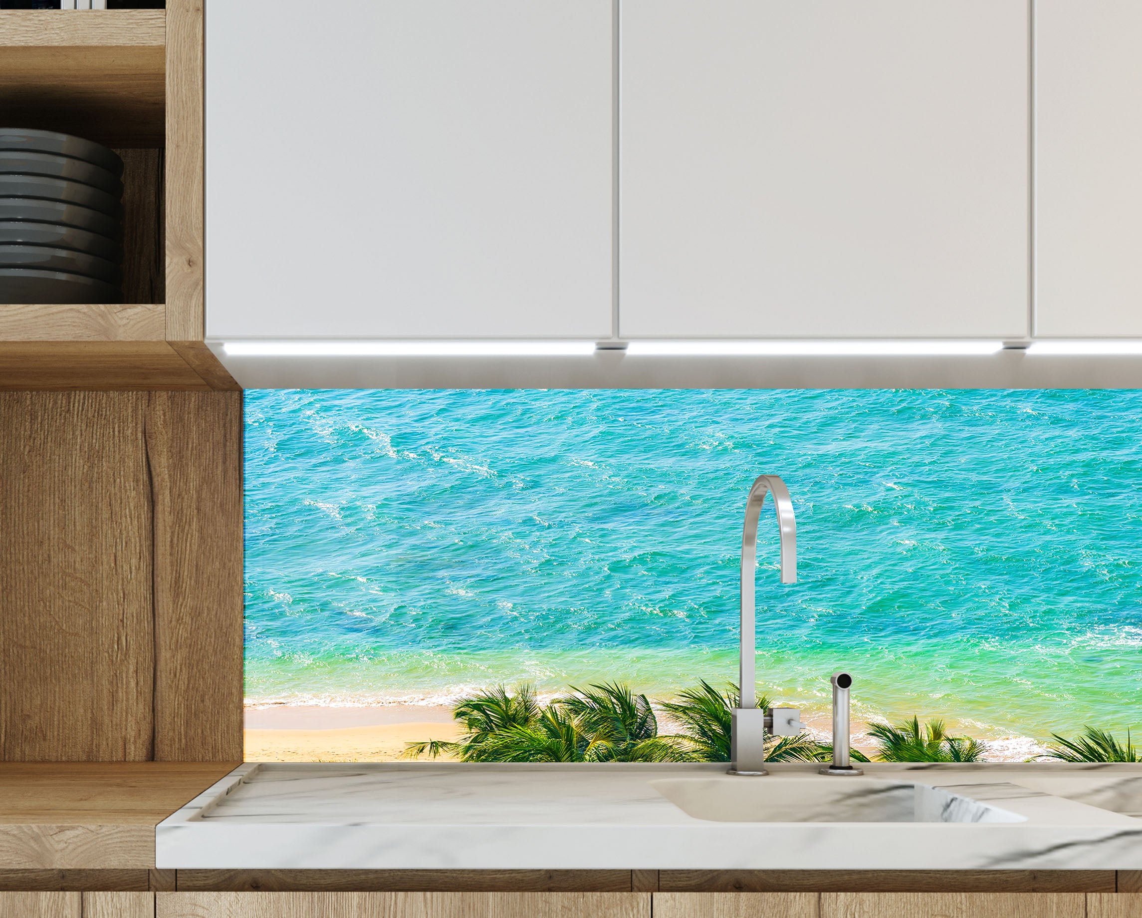 Transform your kitchen into a coastal paradise with the Aerial Tropical Ocean View Wall Art – Tempered Glass Kitchen Backsplash. Featuring a breathtaking aerial view of turquoise waters, golden sand, and lush green palm trees, this luxury tempered glass backsplash adds a fresh and tropical vibe to your space. Designed to be heat-resistant, waterproof, and easy to clean, this backsplash perfectly blends elegance and functionality, making it an ideal addition to any modern kitchen.
