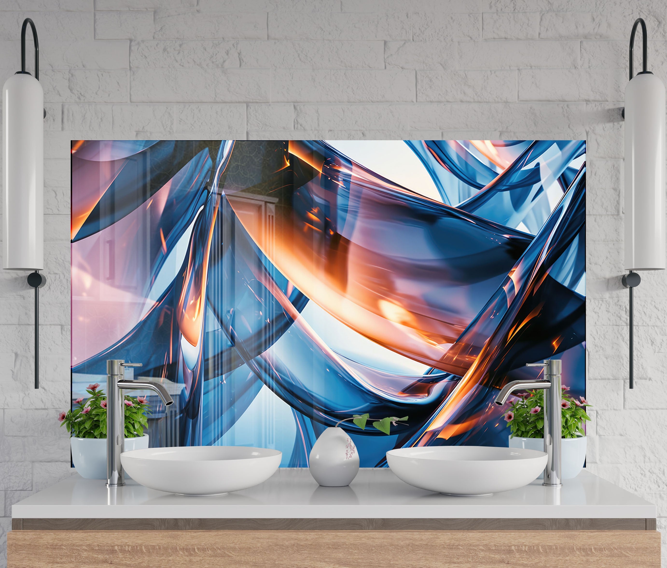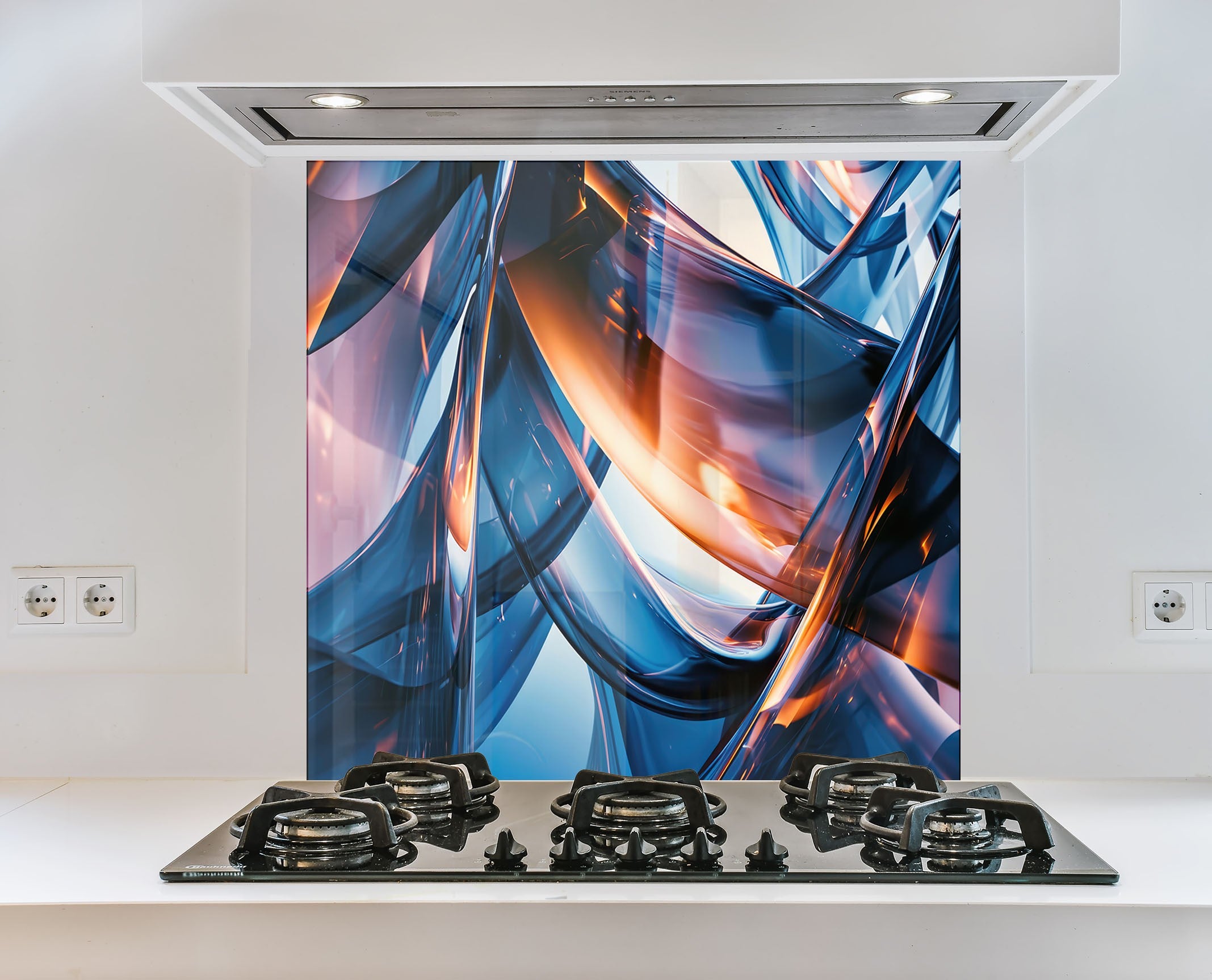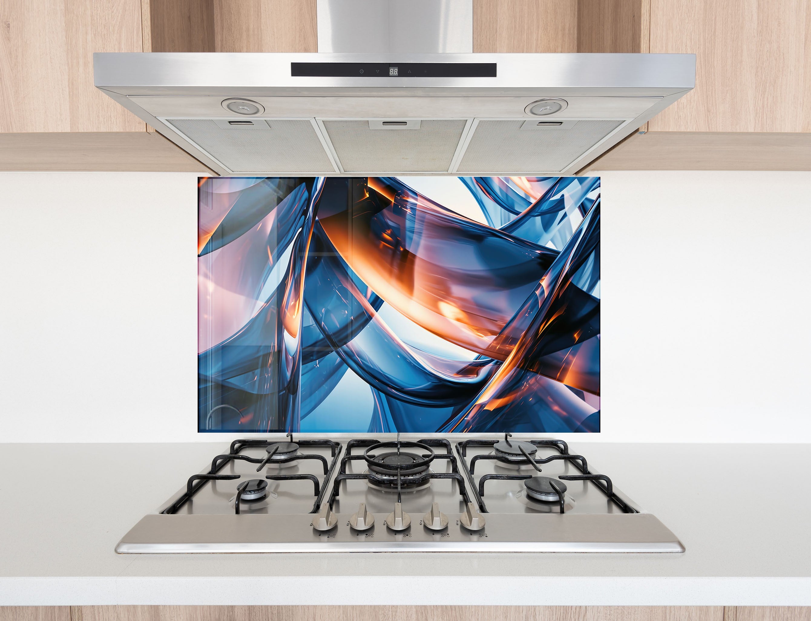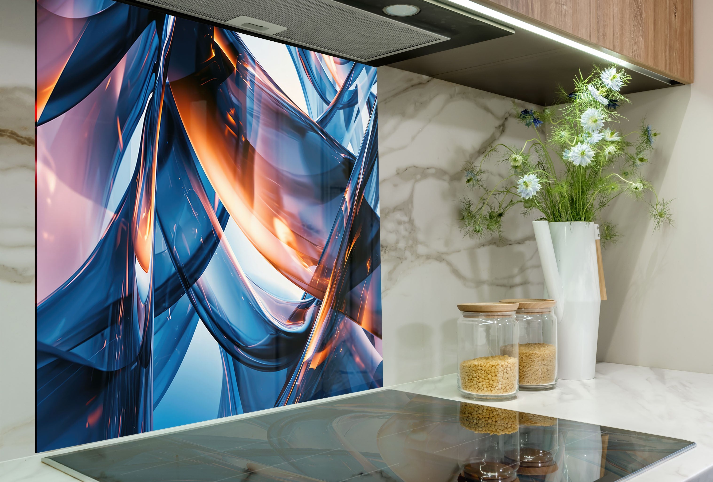 Bring a touch of sophistication to your kitchen with the Abstract Elegance Glass Kitchen Backsplash. Featuring a stunning design of intertwined blues and amber tones, this modern backsplash exudes a bold and dynamic feel. The smooth, flowing lines of abstract glass create a visually striking focal point, blending seamlessly with contemporary interiors.