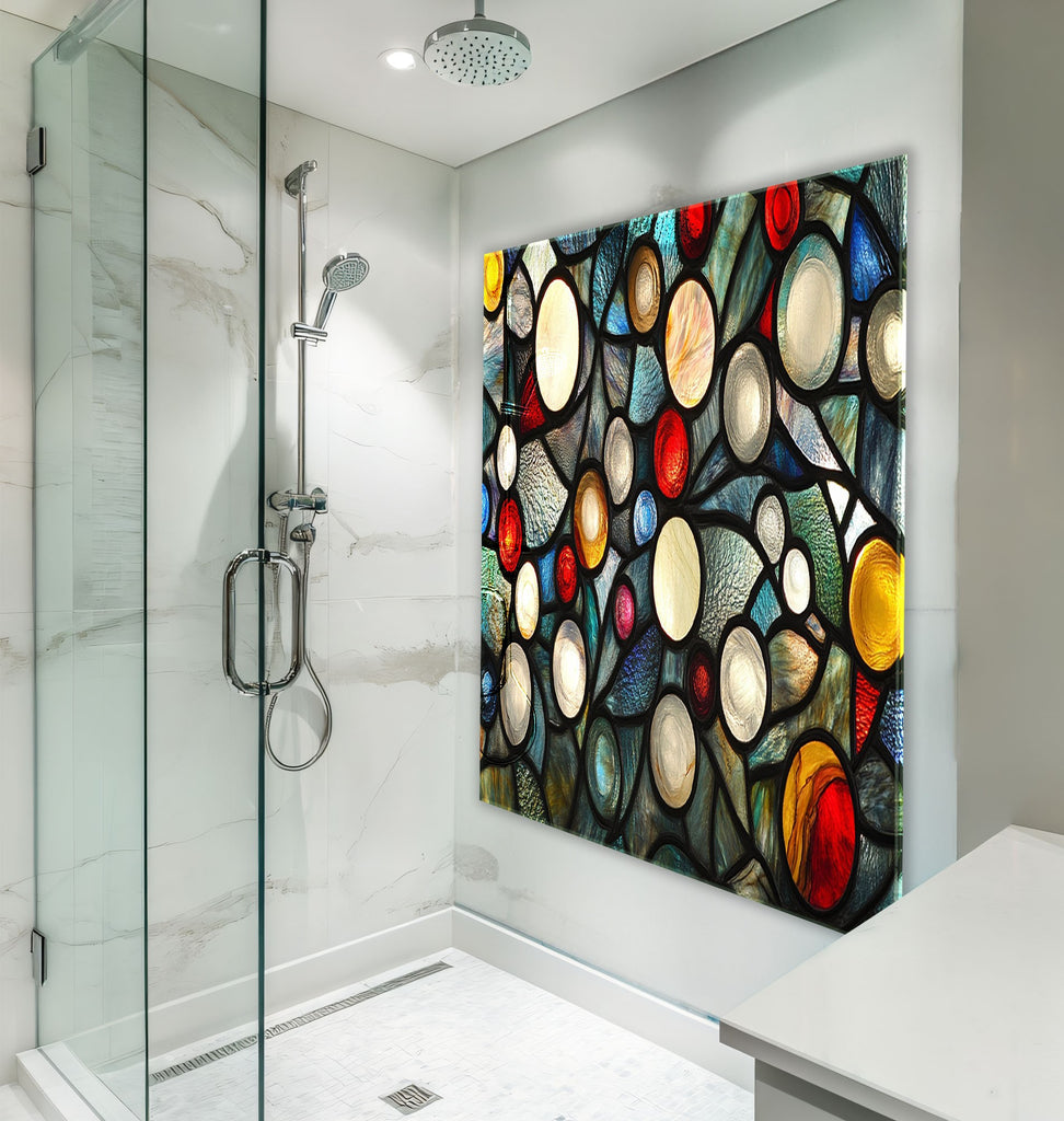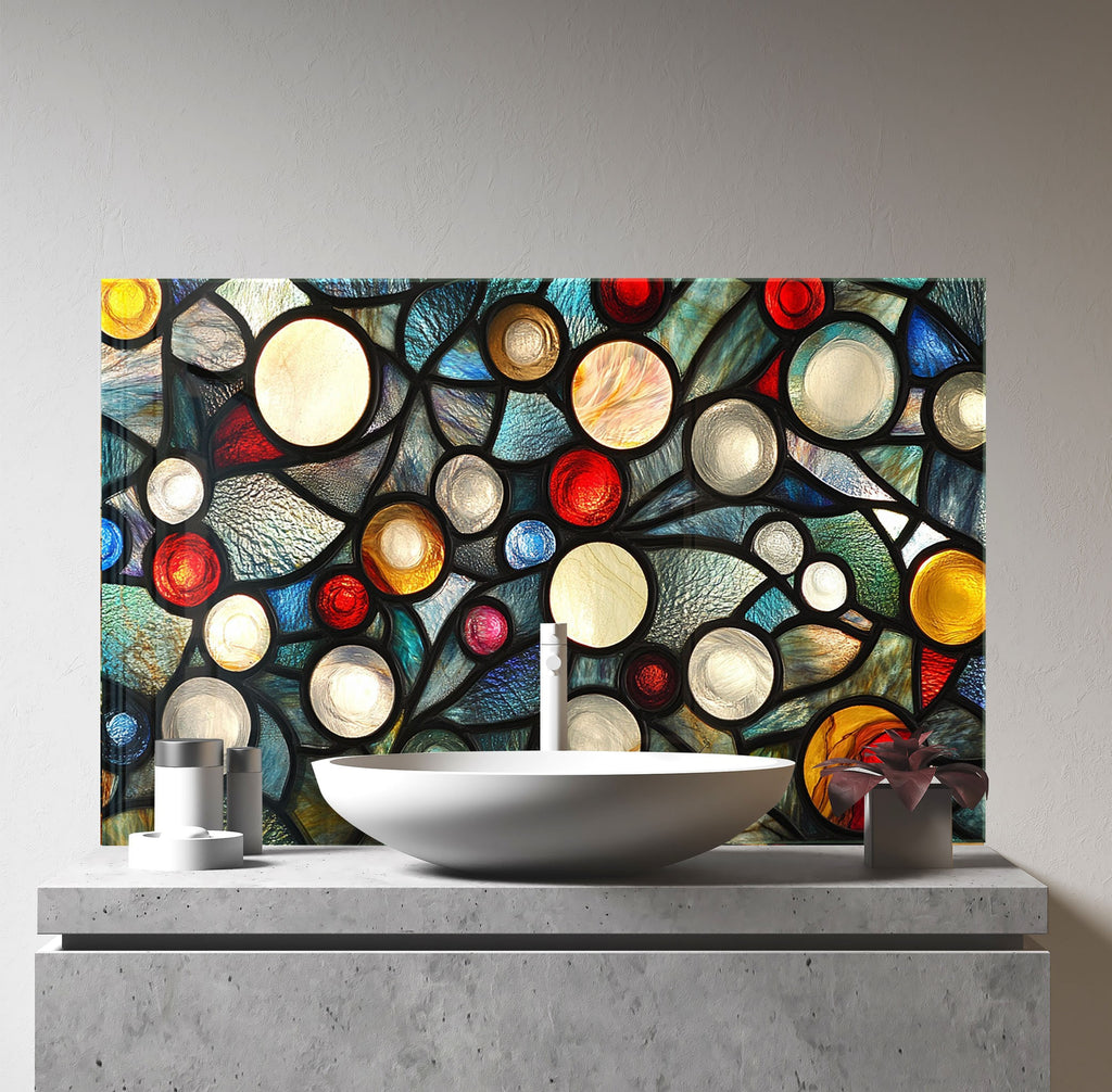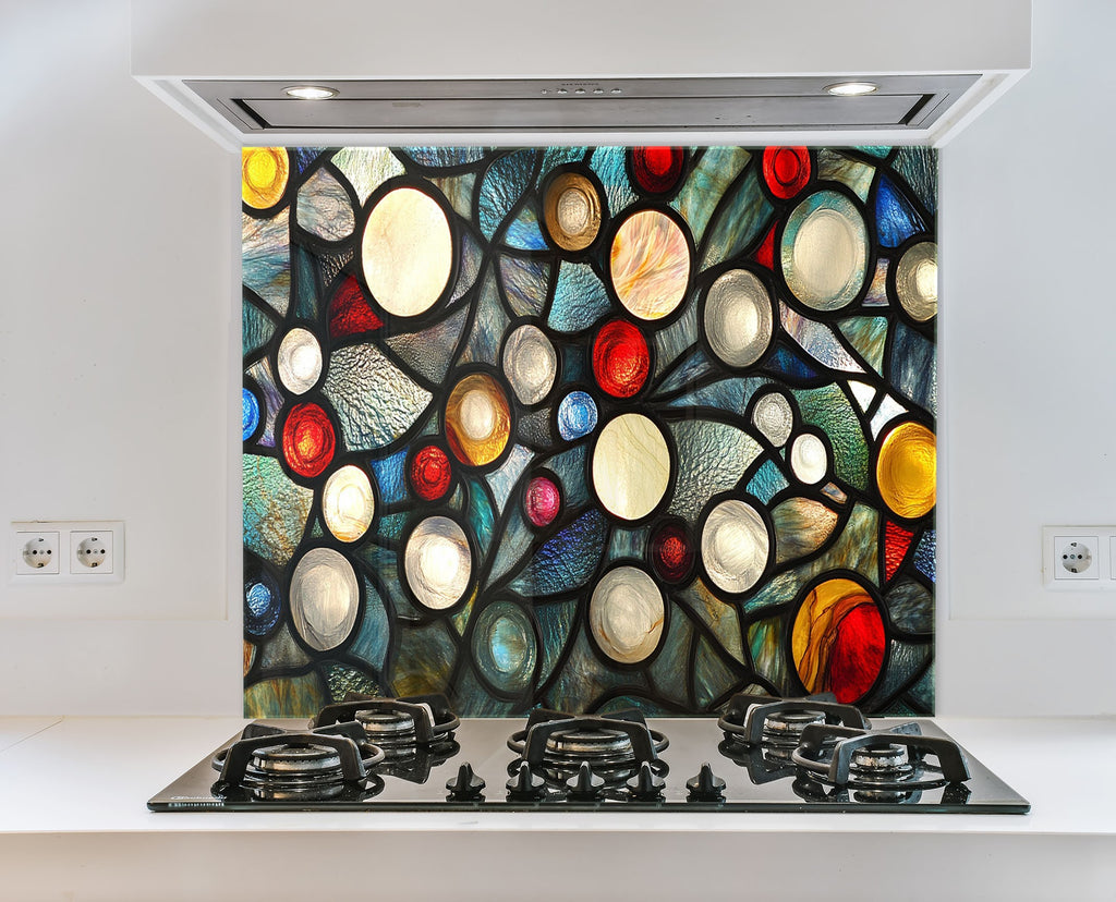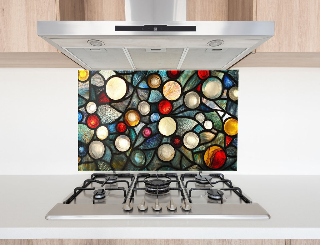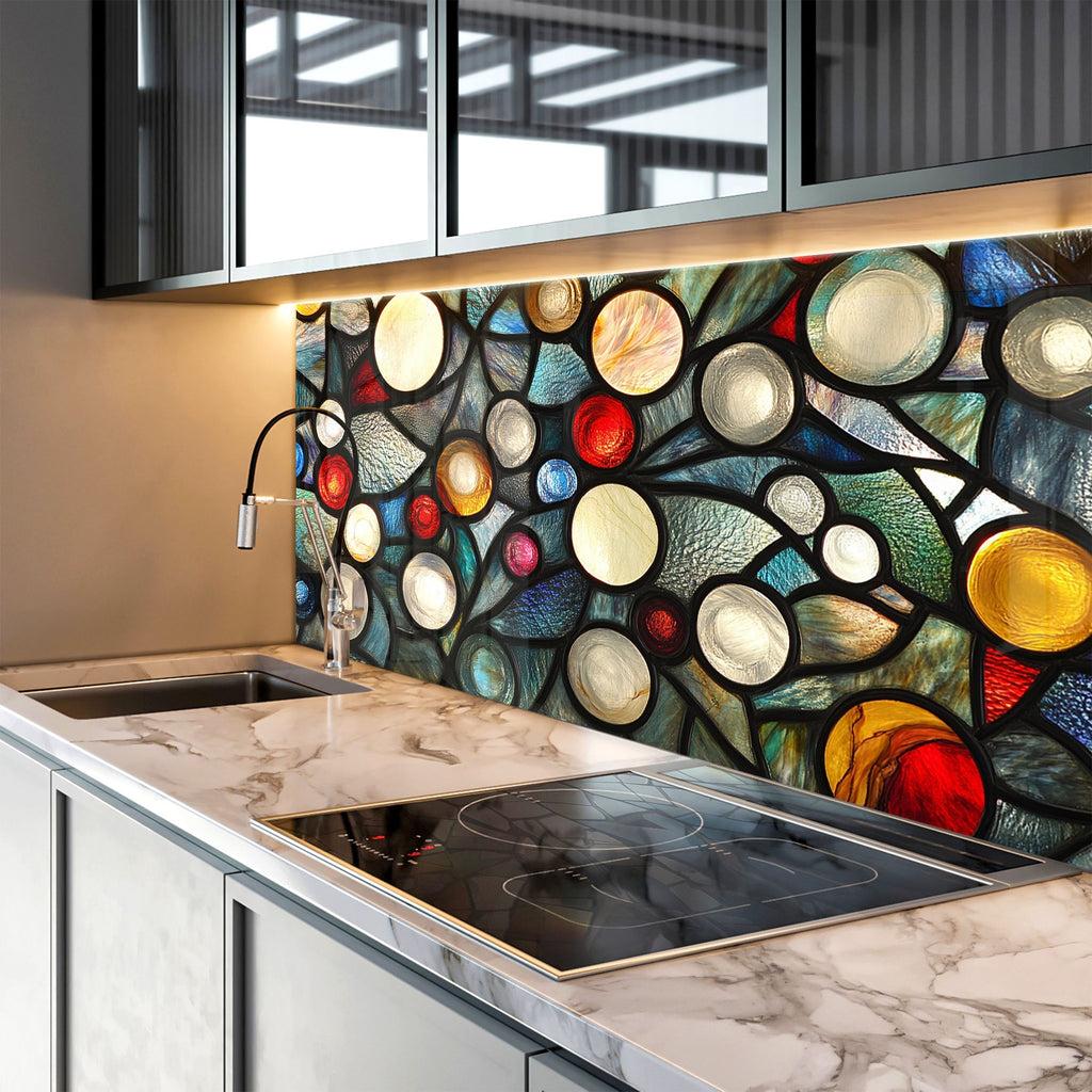 Ignite your kitchen with the vibrant energy of the Celestial Orbs Glass Kitchen Backsplash. This abstract composition features luminous circular forms in a stained glass-style arrangement, bursting with colors like ruby red, sapphire blue, amber, ivory, and teal. The bold black outlines add drama and modern flair, making it a striking focal point for contemporary, eclectic, or artistic kitchens.