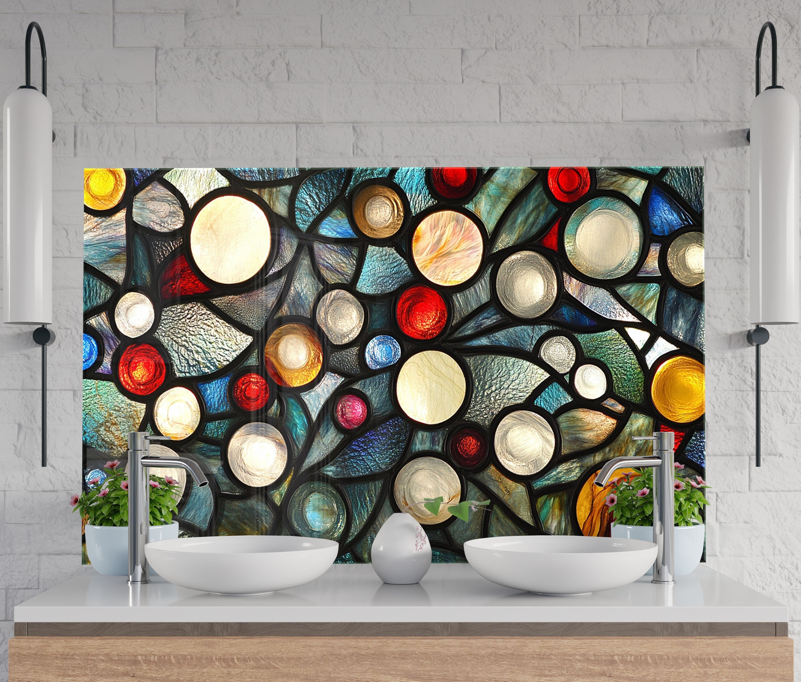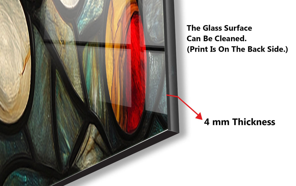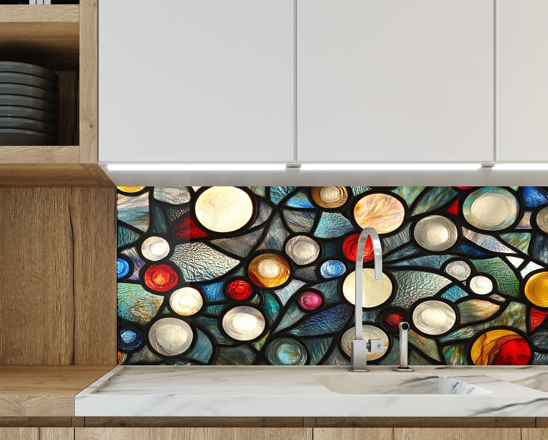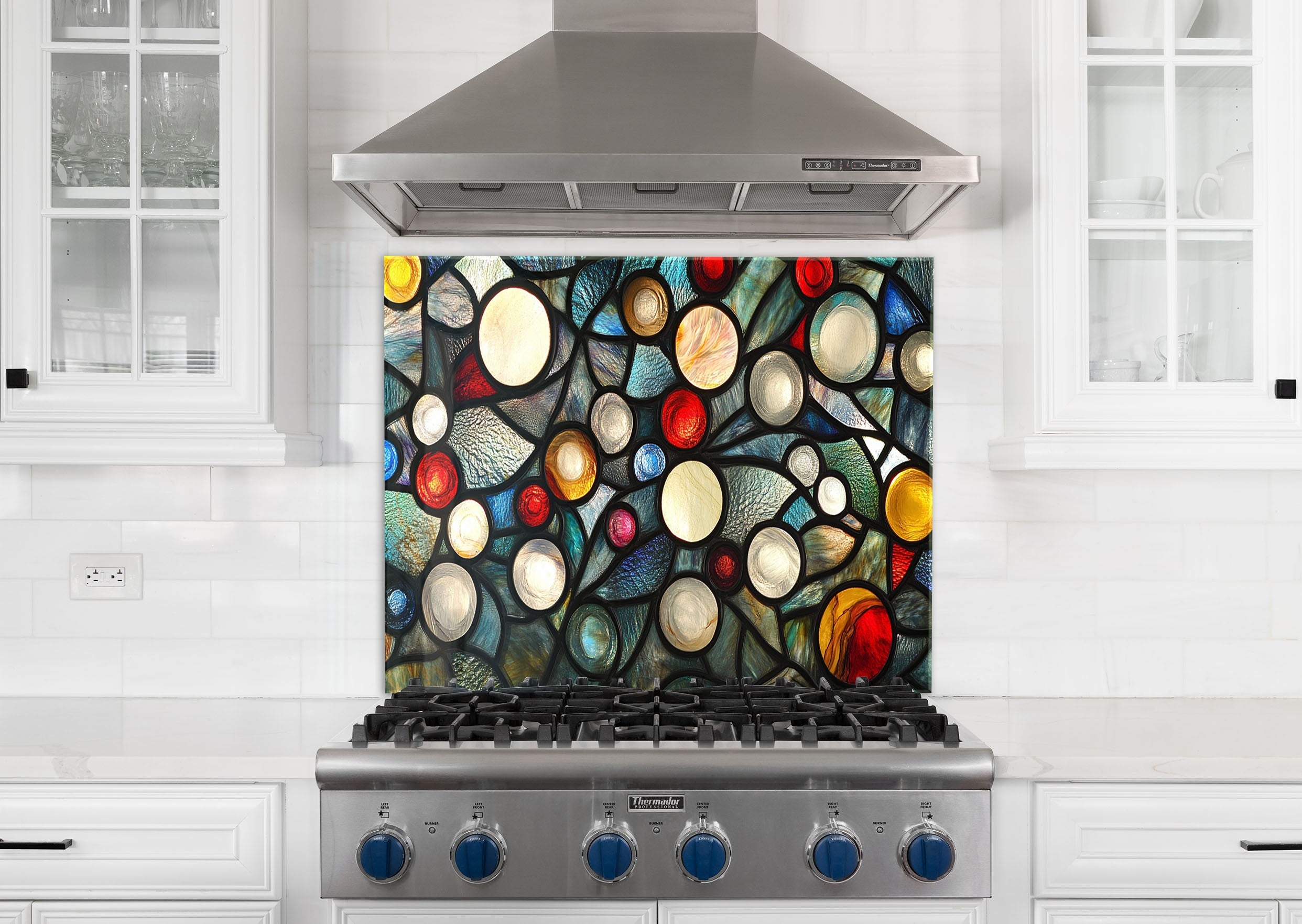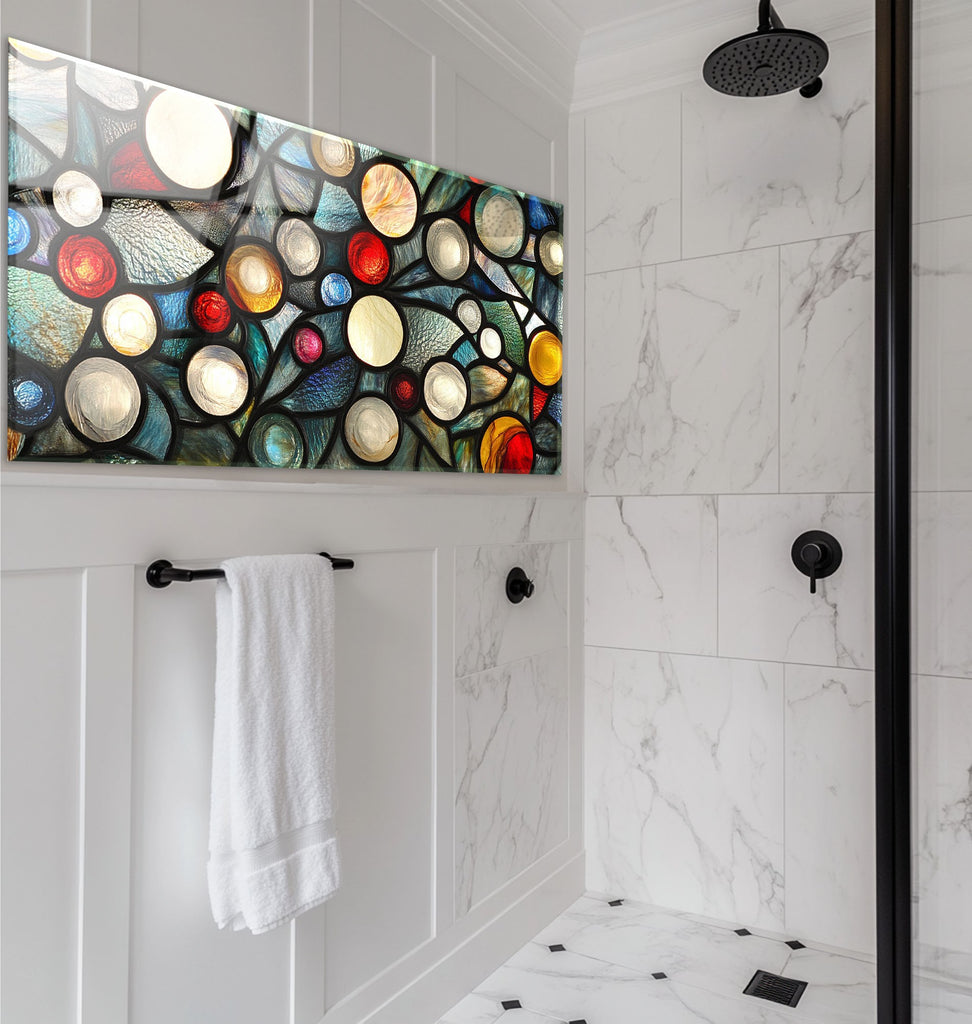 Ignite your kitchen with the vibrant energy of the Celestial Orbs Glass Kitchen Backsplash. This abstract composition features luminous circular forms in a stained glass-style arrangement, bursting with colors like ruby red, sapphire blue, amber, ivory, and teal. The bold black outlines add drama and modern flair, making it a striking focal point for contemporary, eclectic, or artistic kitchens.