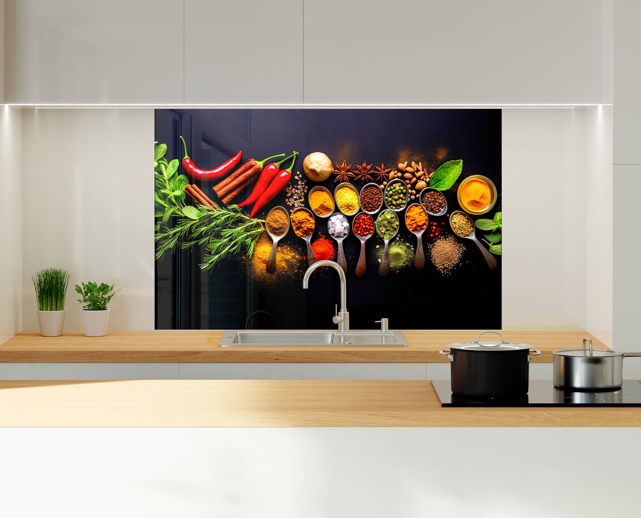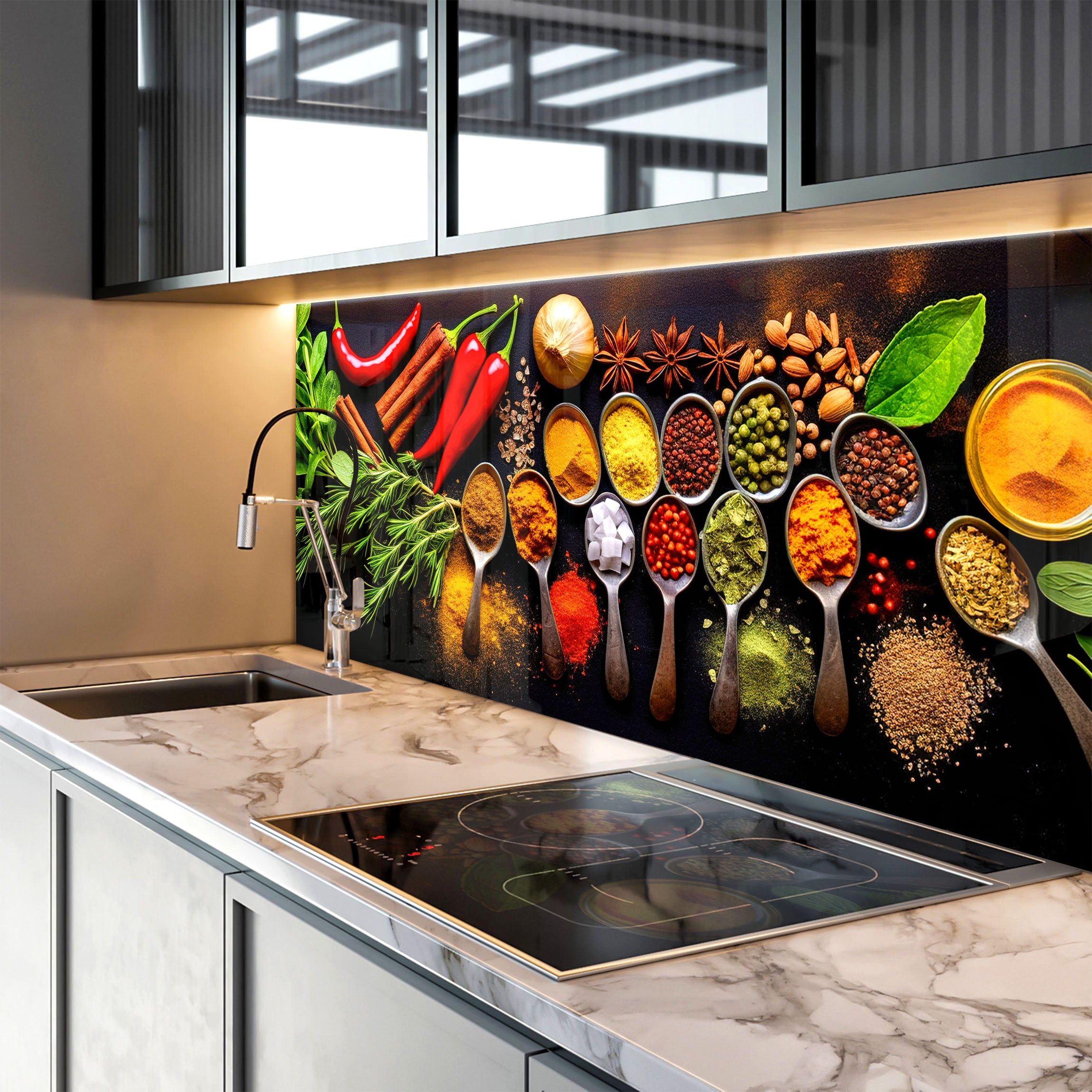 Turn your kitchen into a culinary art gallery with the Midnight Spice Collection Glass Kitchen Backsplash – a blend of bold design and everyday practicality. Order yours today! 🌶️🔥✨