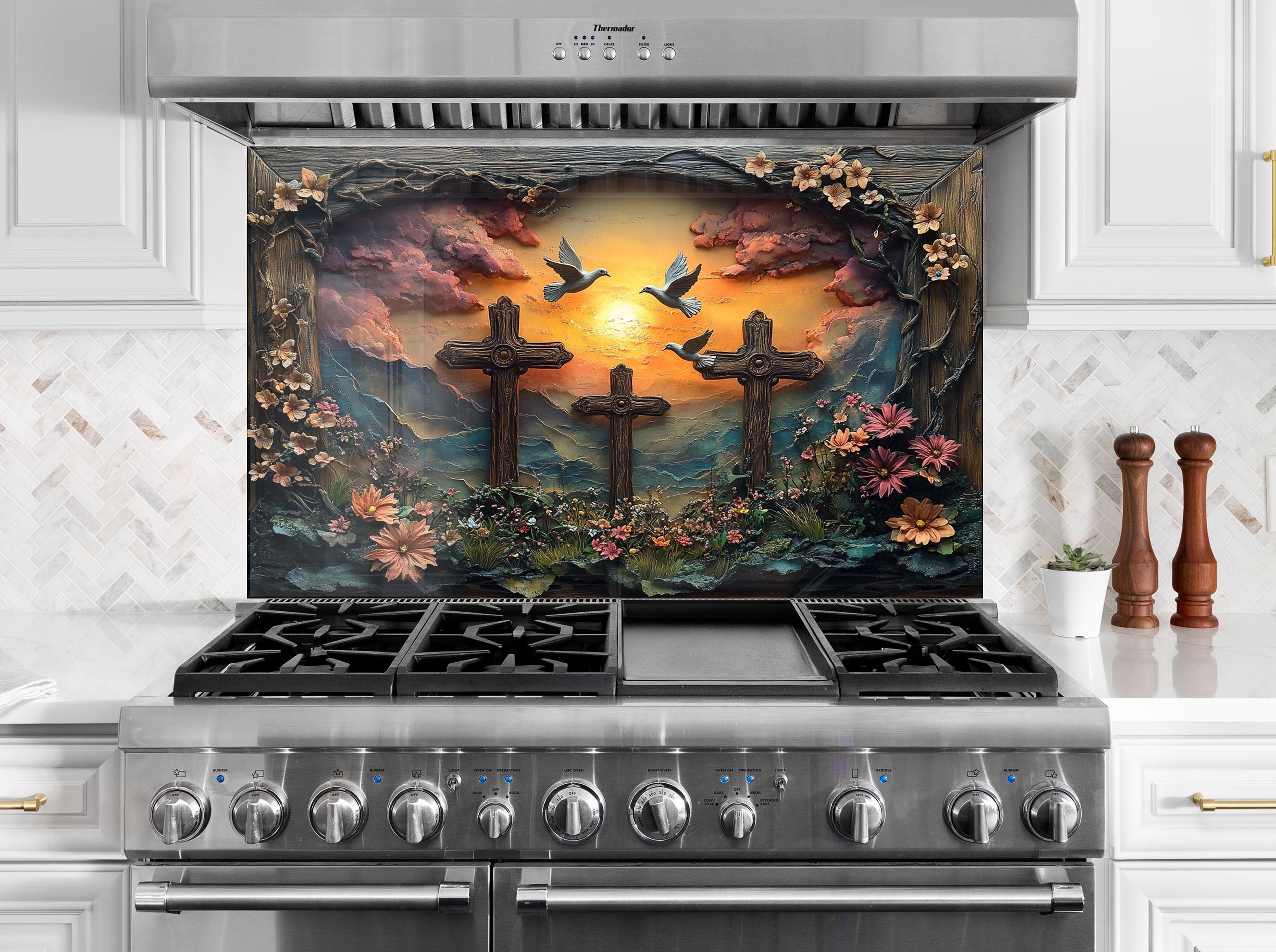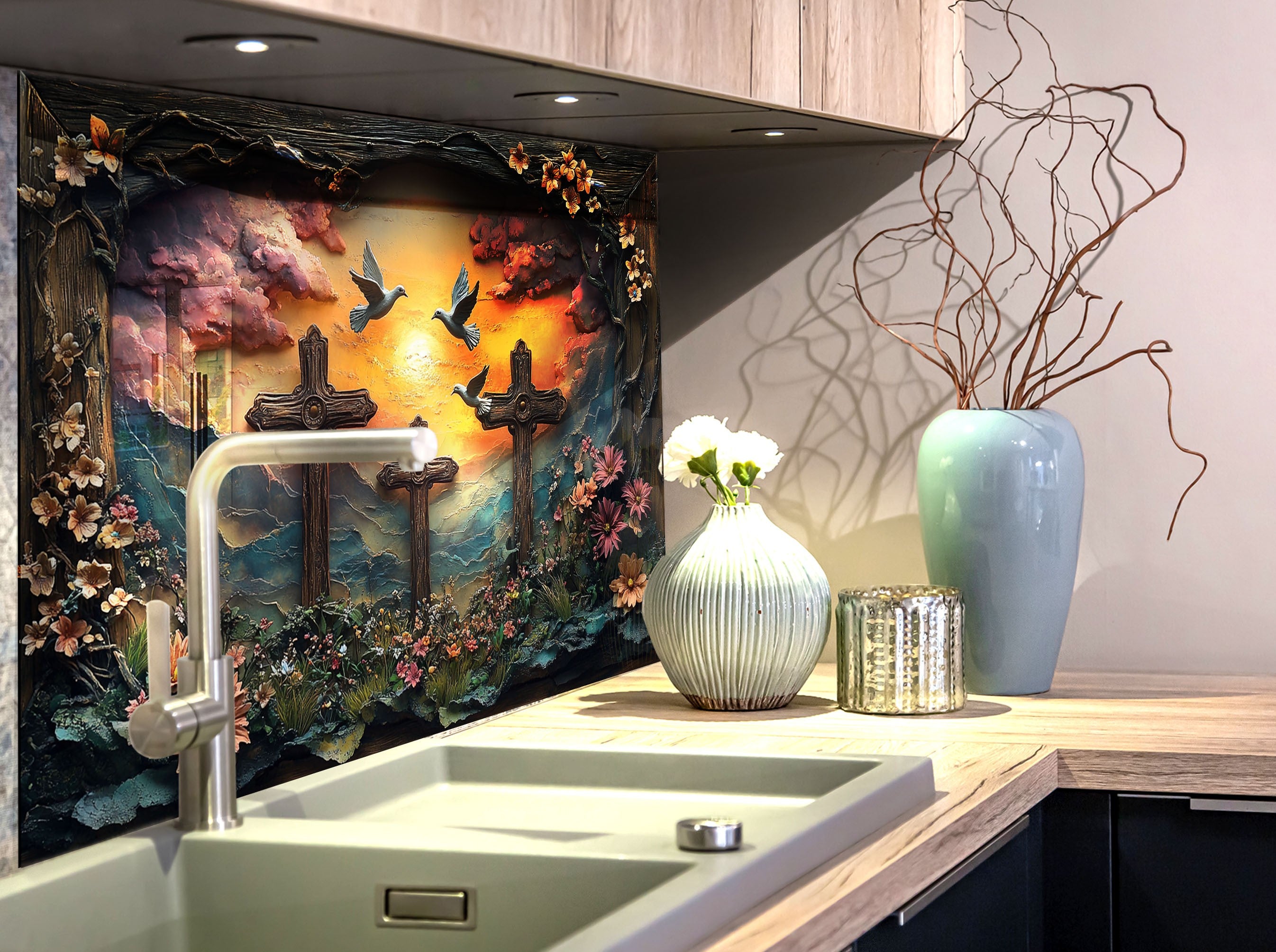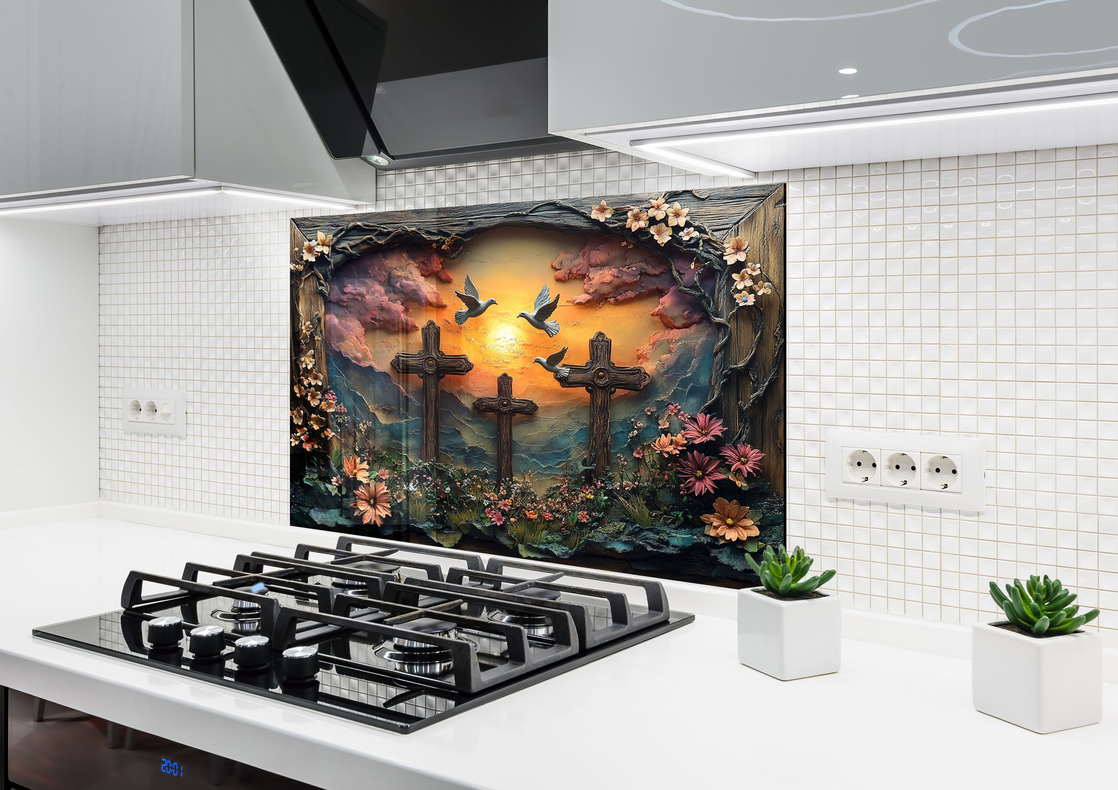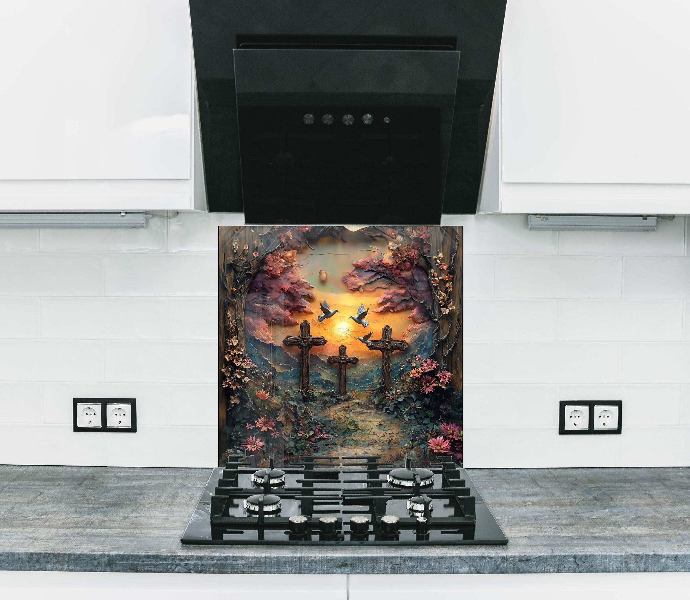 Transform your kitchen into a space of faith and inspiration with the Faithful Sunrise Three Crosses Glass Kitchen Backsplash. This breathtaking design captures three wooden crosses on a hill, surrounded by vibrant flowers, a golden sunrise, and peaceful doves symbolizing hope and redemption. The intricate 3D effect and high-resolution print create a stunning spiritual atmosphere, perfect for believers who want to showcase their faith and devotion in their home decor.