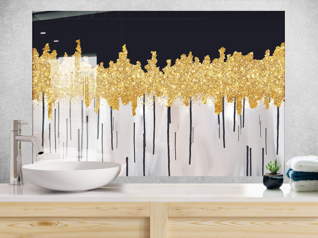 Make a bold statement with the Gold Drip Design - Glass Kitchen Backsplash. Featuring 8K high-quality UV printing, this design combines bold black tones with gold drip details, creating a modern, artistic flair in your kitchen. Made from 10 times reinforced tempered glass (4mm), this backsplash offers outstanding durability, heat resistance, and a smooth, easy-to-clean surface, blending style and practicality perfectly.