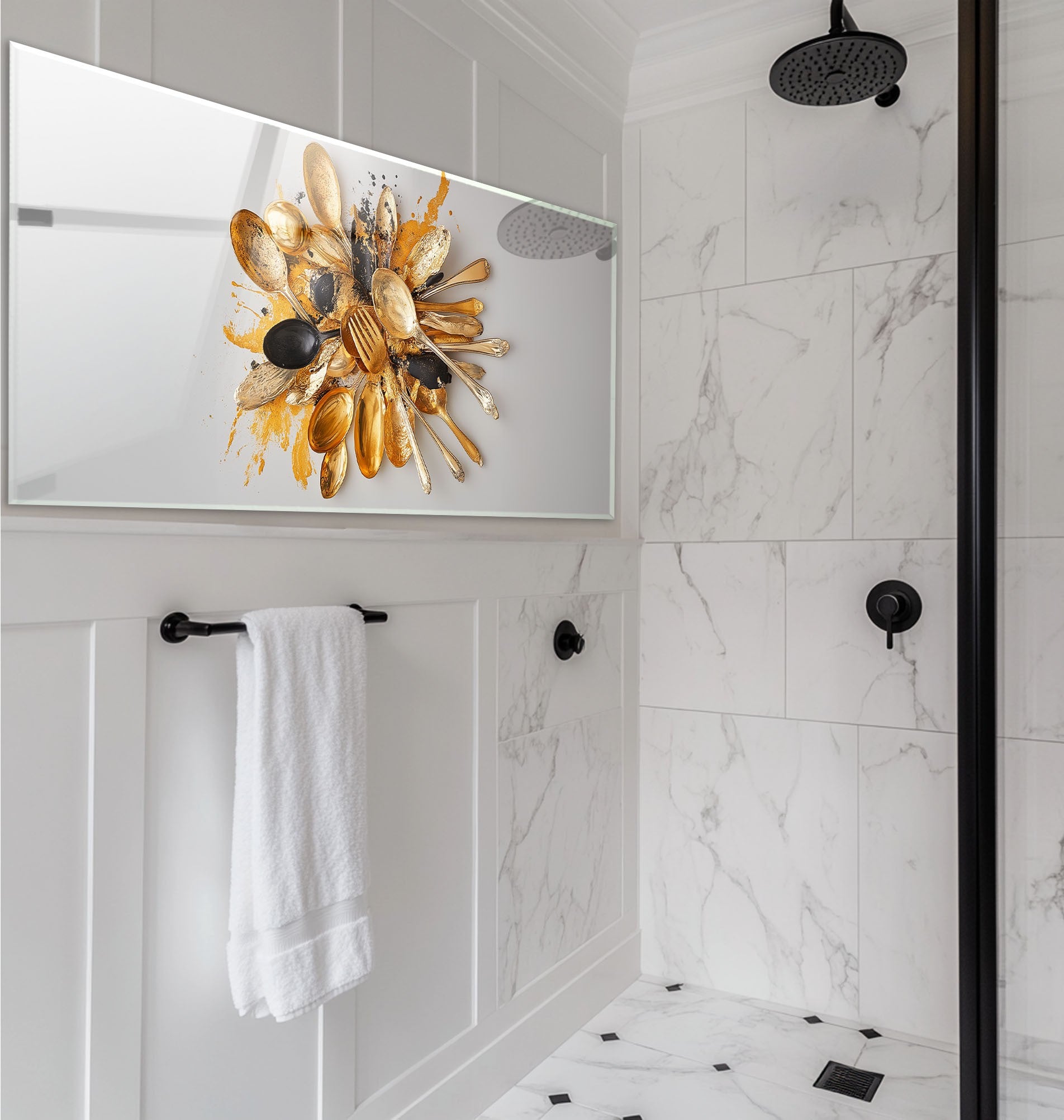 Make a bold culinary statement with the Golden Chaos – Abstract Cutlery Art Glass Kitchen Backsplash. Featuring a swirling explosion of vintage silver and gold-toned spoons, this design captures movement and drama with artistic splashes of black and ochre paint. It’s a stunning fusion of kitchen heritage and modern art – ideal for eclectic, industrial, or luxury kitchens looking for a standout centerpiece.