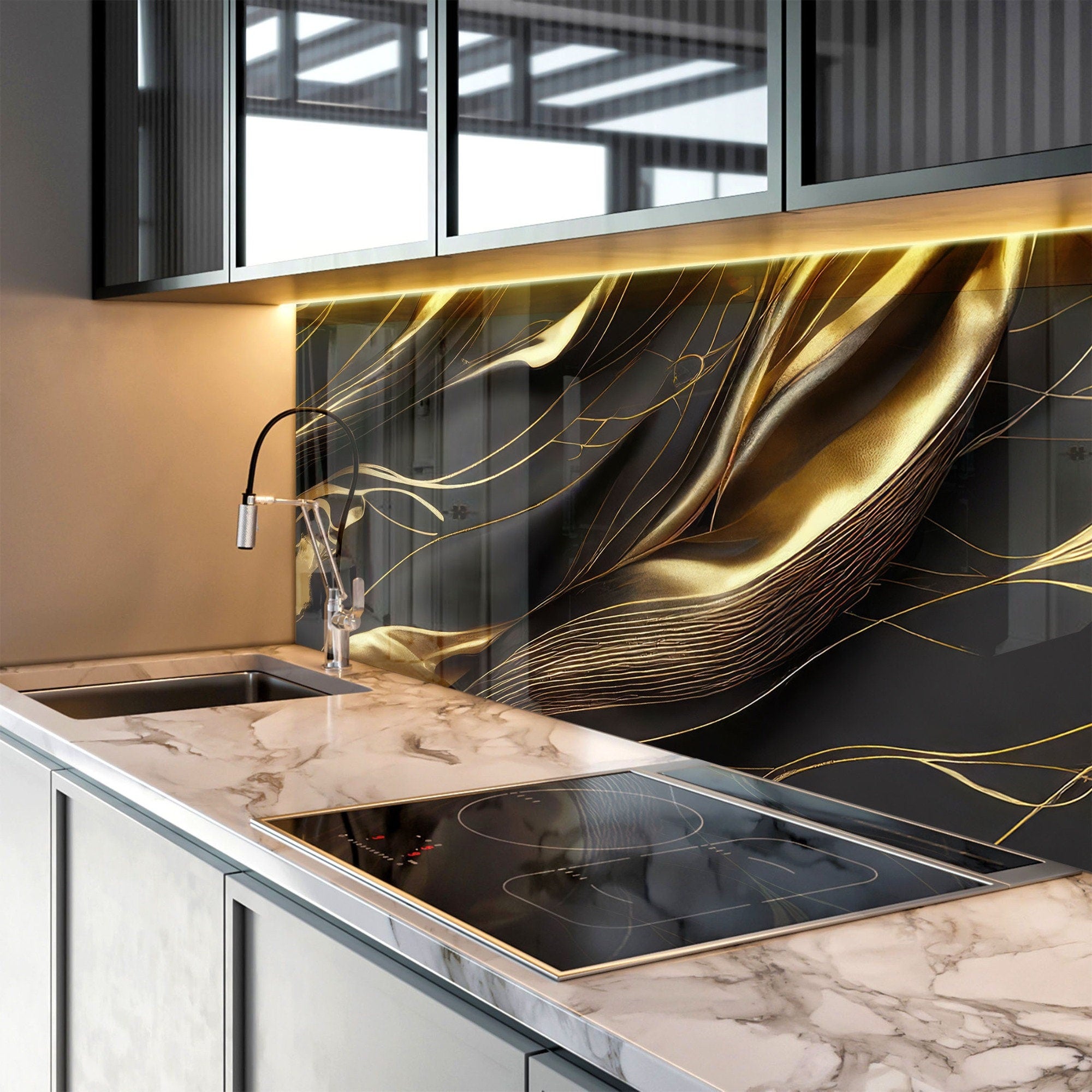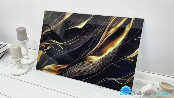 Add a luxurious touch to your kitchen with the Golden Silk Flow Glass Kitchen Backsplash. Featuring 8K high-quality UV printing, this design showcases soft golden silk textures flowing over a sleek black background, creating a sophisticated and timeless aesthetic. Made from 10 times reinforced tempered glass (4mm), this backsplash ensures excellent durability, heat resistance, and a sleek, high-gloss surface.