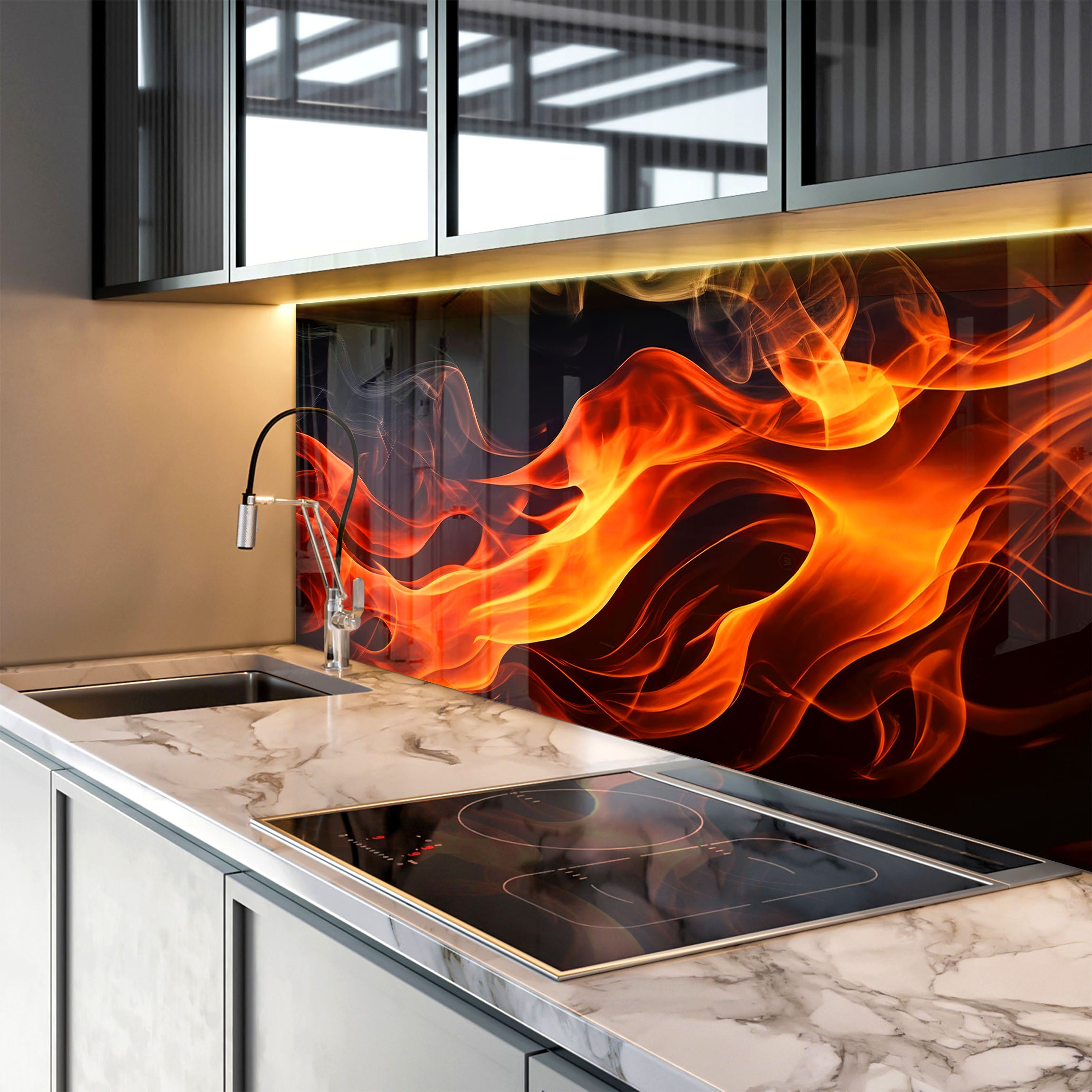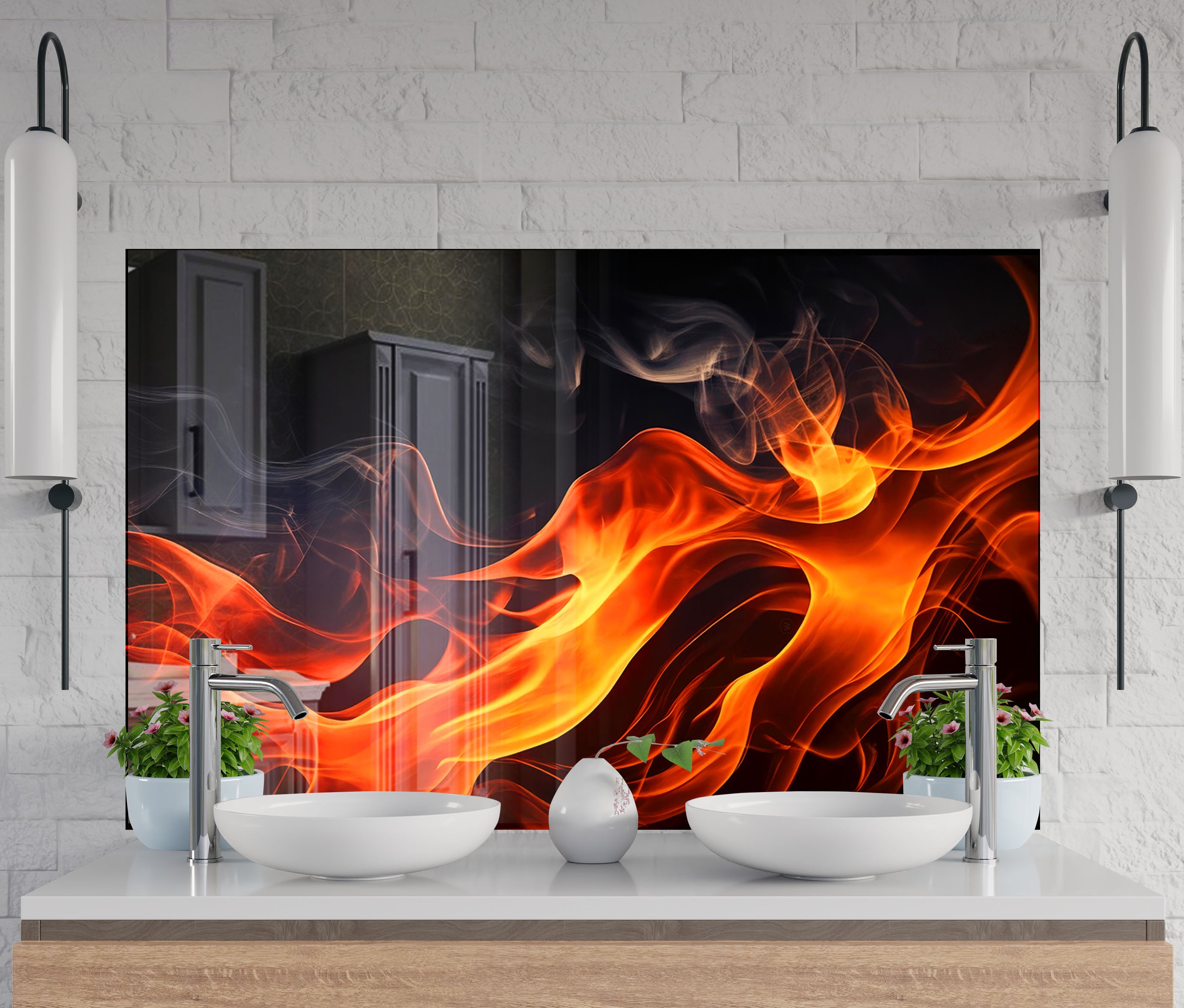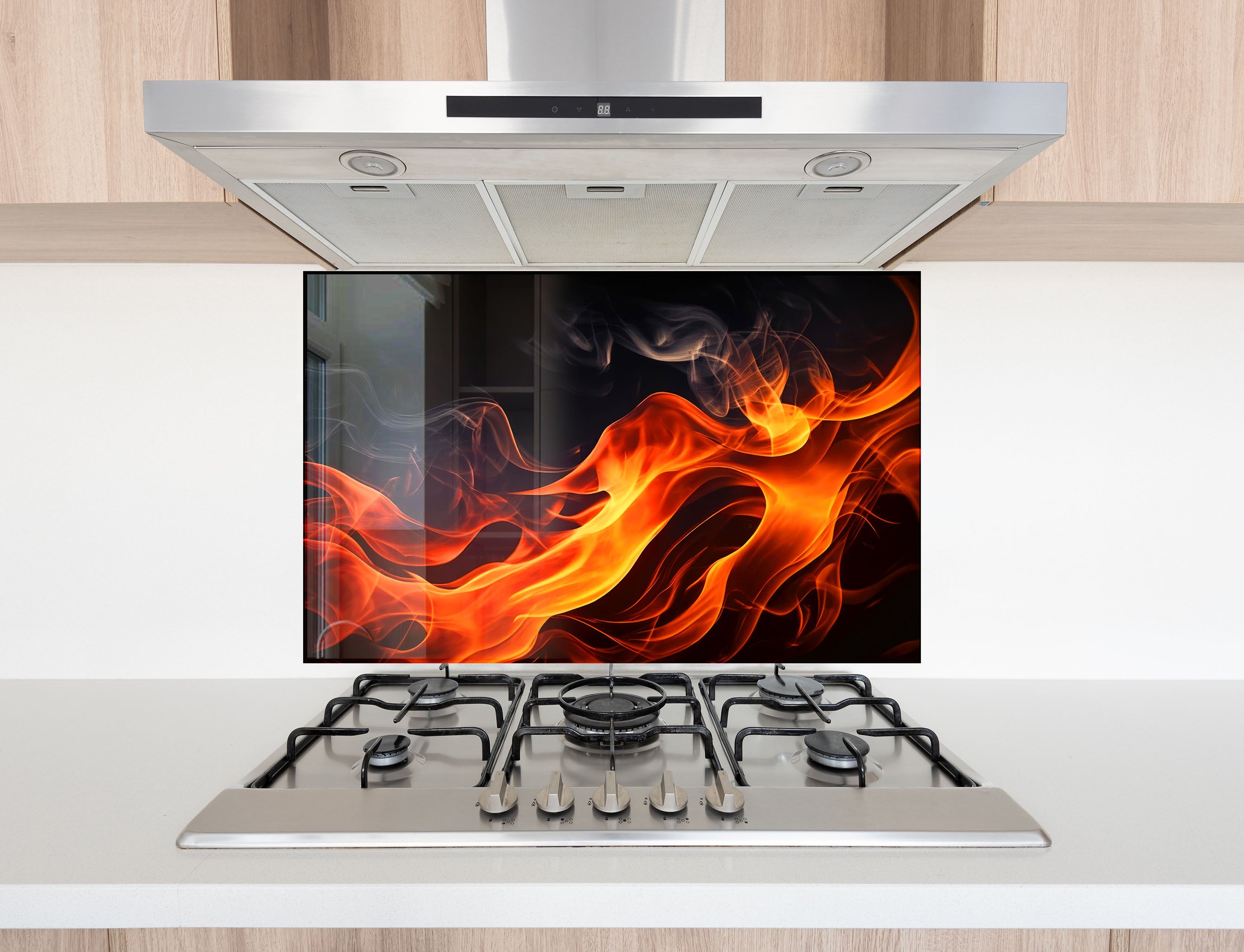 Transform your kitchen into a bold statement of power and sophistication with the Inferno Blaze Glass Kitchen Backsplash. This mesmerizing design features vivid flames of molten orange and deep ember tones, igniting your space with a sense of passion and energy. The striking contrast against a sleek black background creates a dynamic and captivating masterpiece, bringing a modern and artistic edge to your home.