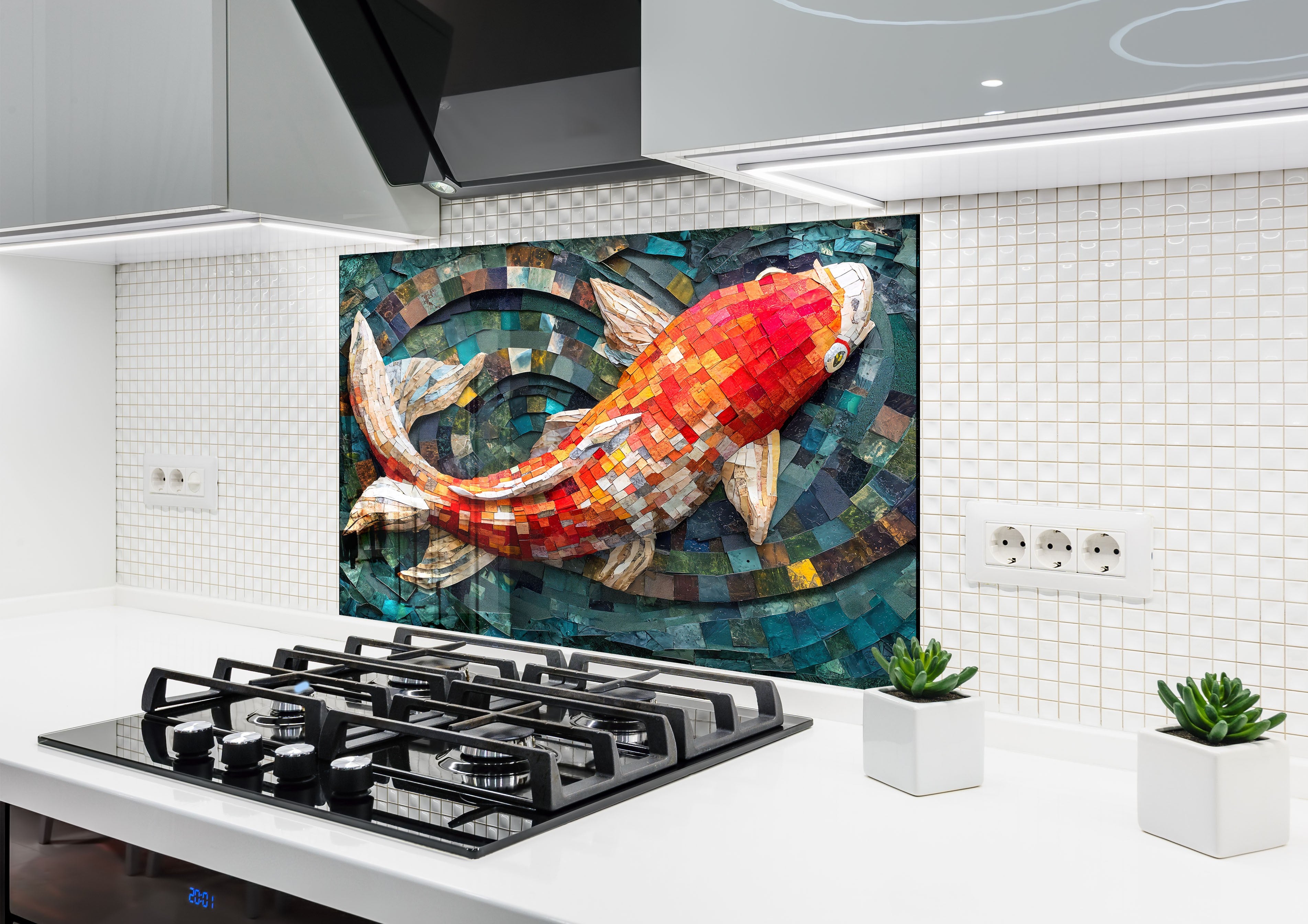Mosaic-Inspired Tempered Glass Kitchen Backsplash with Koi Fish Design