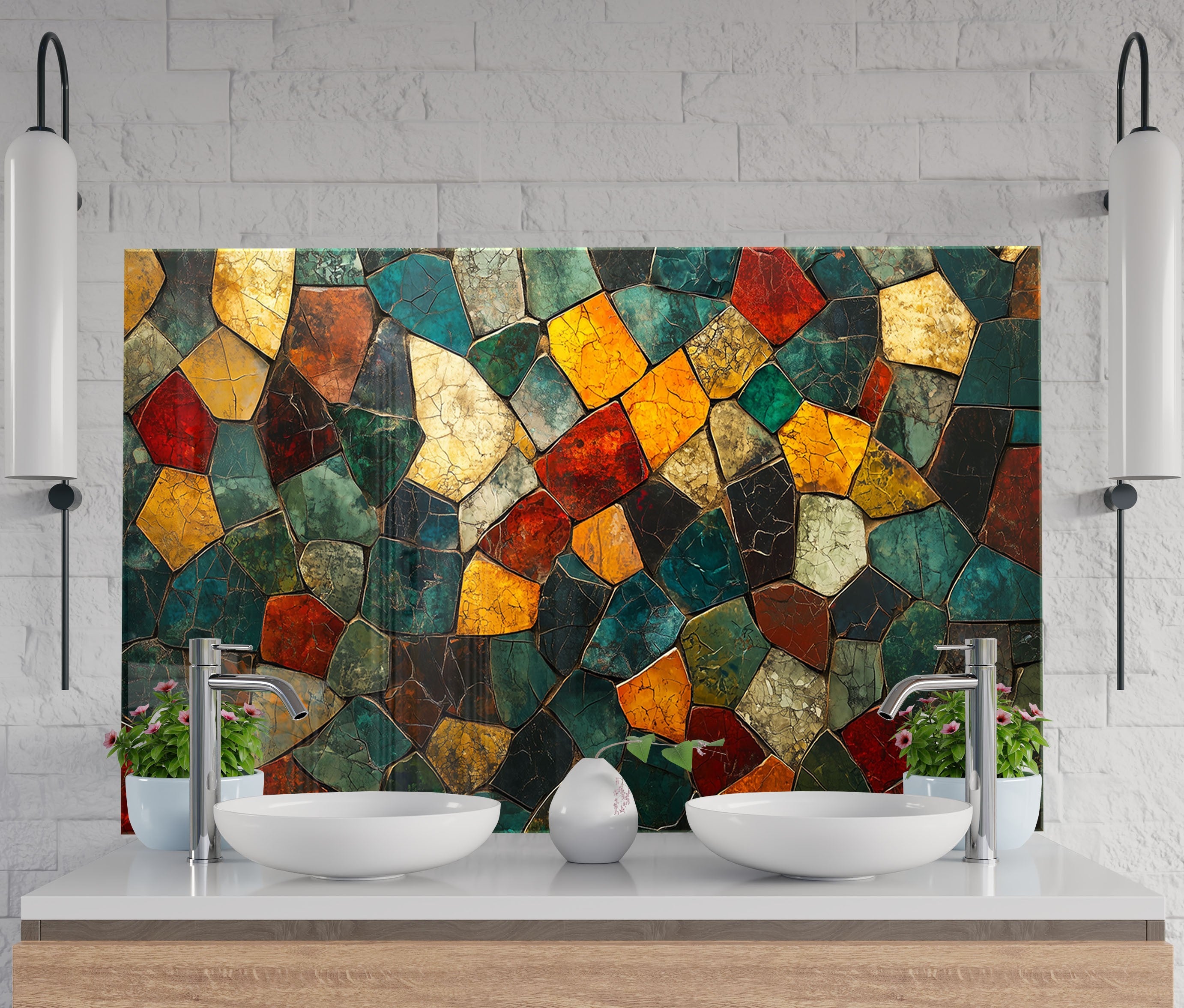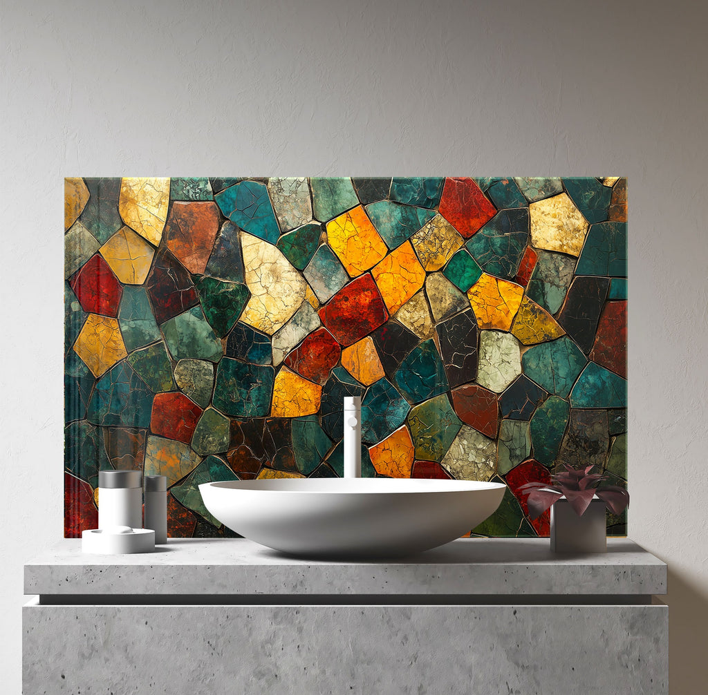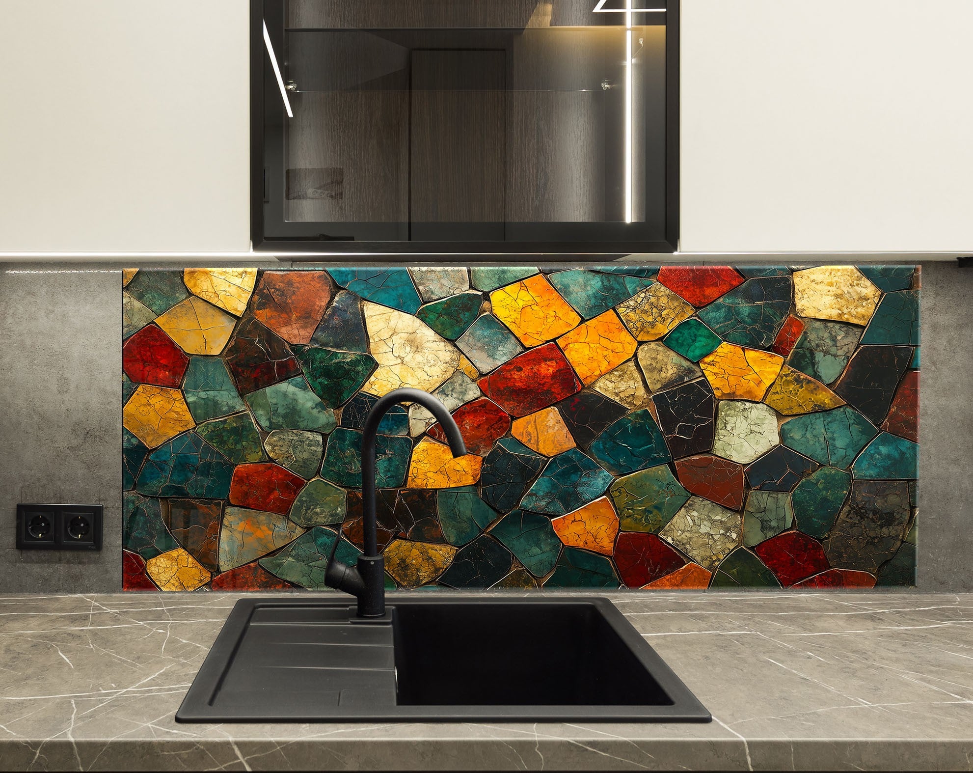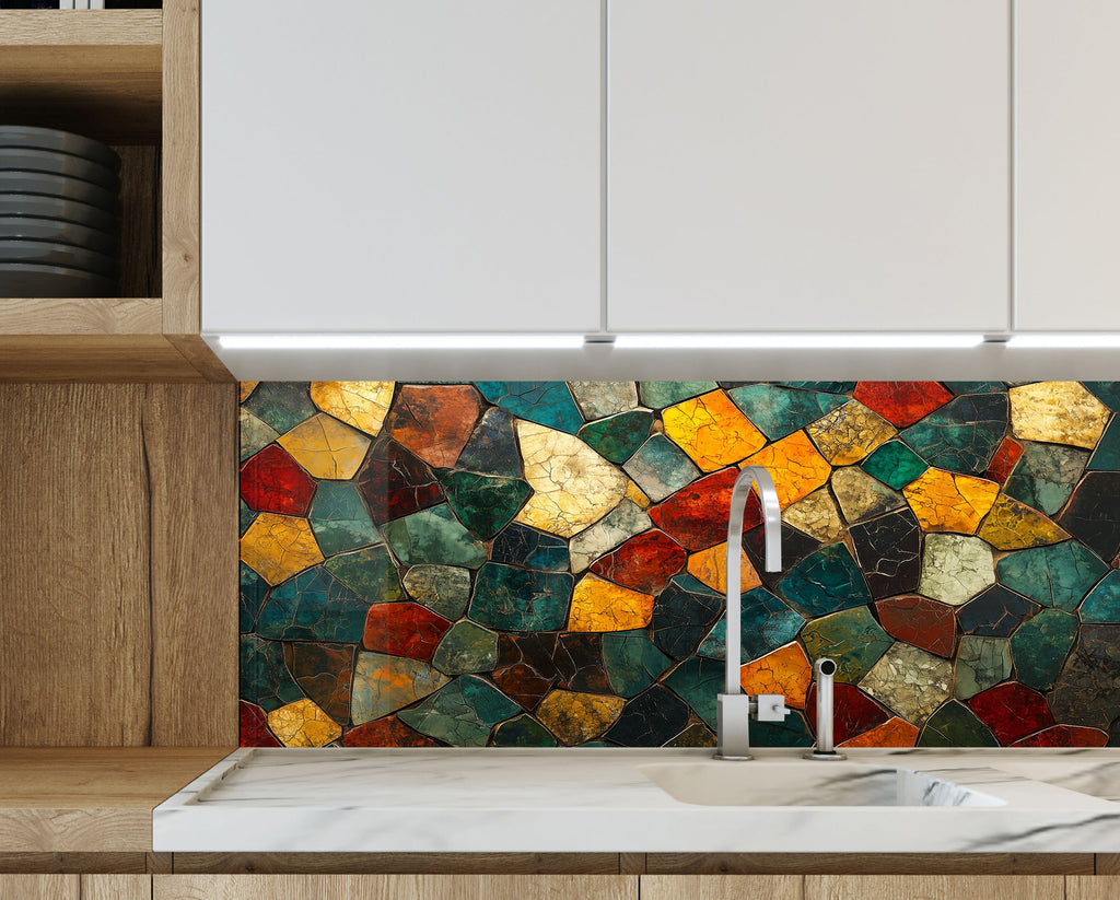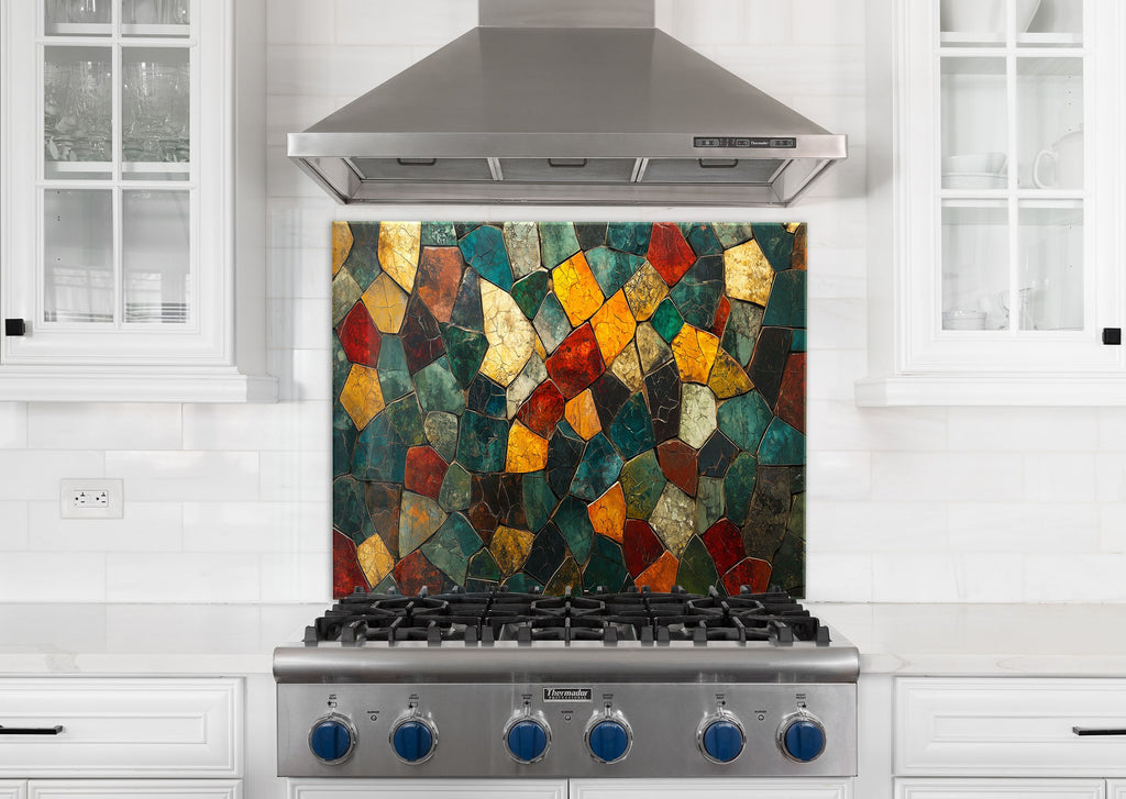 Transform your kitchen into a vibrant haven with the Mosaic Radiance – Rustic Multicolor Glass Kitchen Backsplash. A celebration of color and texture, this piece evokes the charm of antique mosaic tiles blended with modern vibrance. Deep emeralds, burnt oranges, rustic yellows, and rich reds create a lively rhythm across the surface, making your kitchen a bold and artistic focal point.