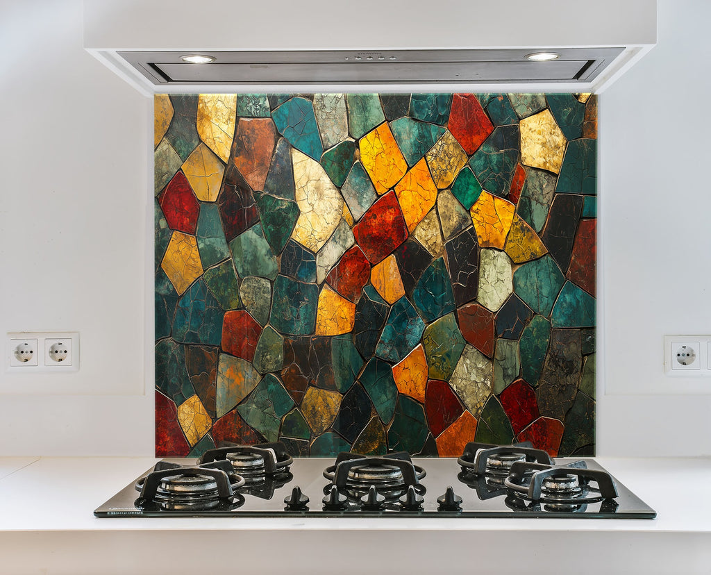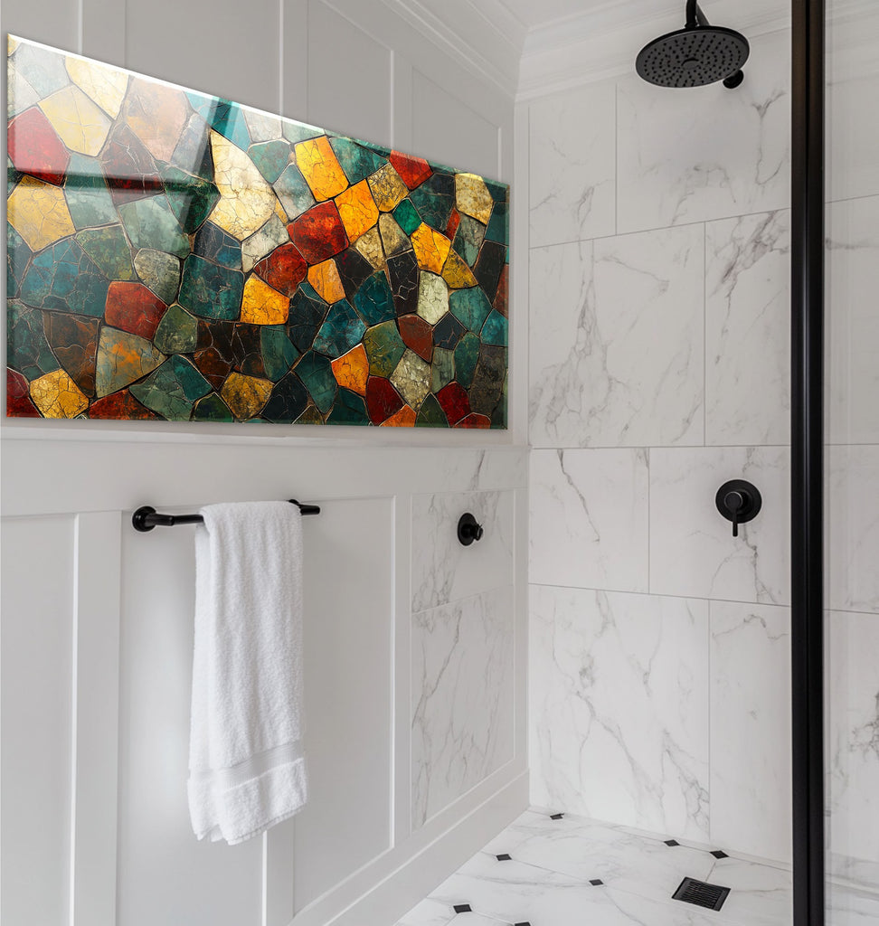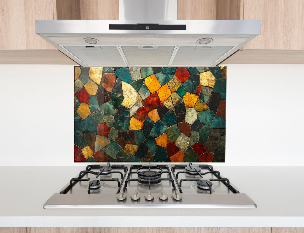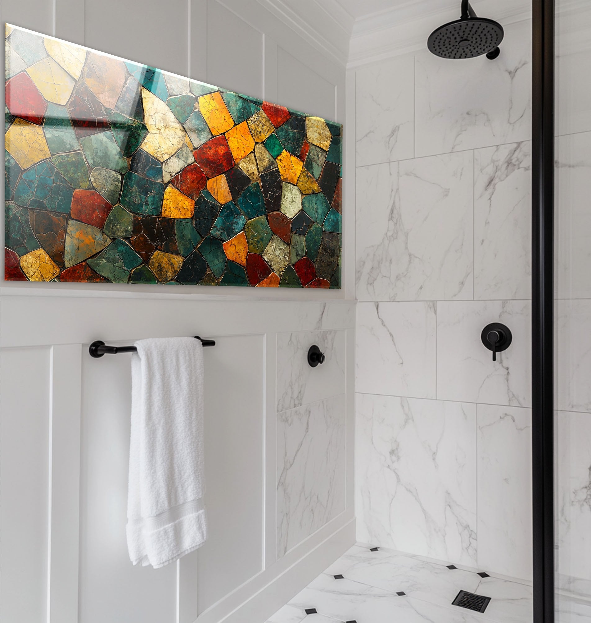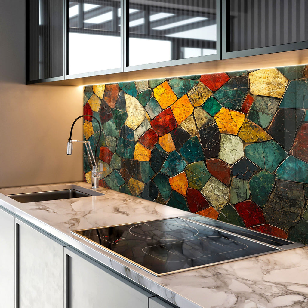 Transform your kitchen into a vibrant haven with the Mosaic Radiance – Rustic Multicolor Glass Kitchen Backsplash. A celebration of color and texture, this piece evokes the charm of antique mosaic tiles blended with modern vibrance. Deep emeralds, burnt oranges, rustic yellows, and rich reds create a lively rhythm across the surface, making your kitchen a bold and artistic focal point.