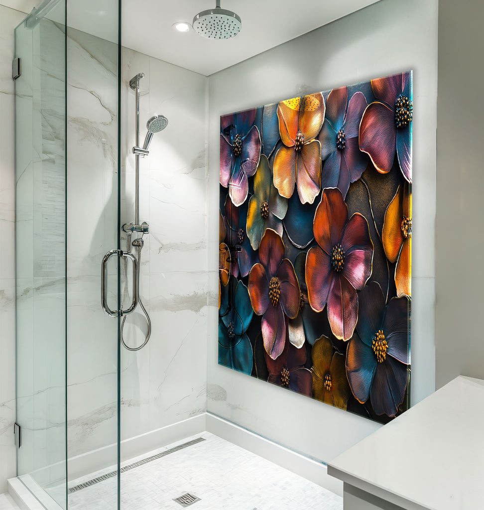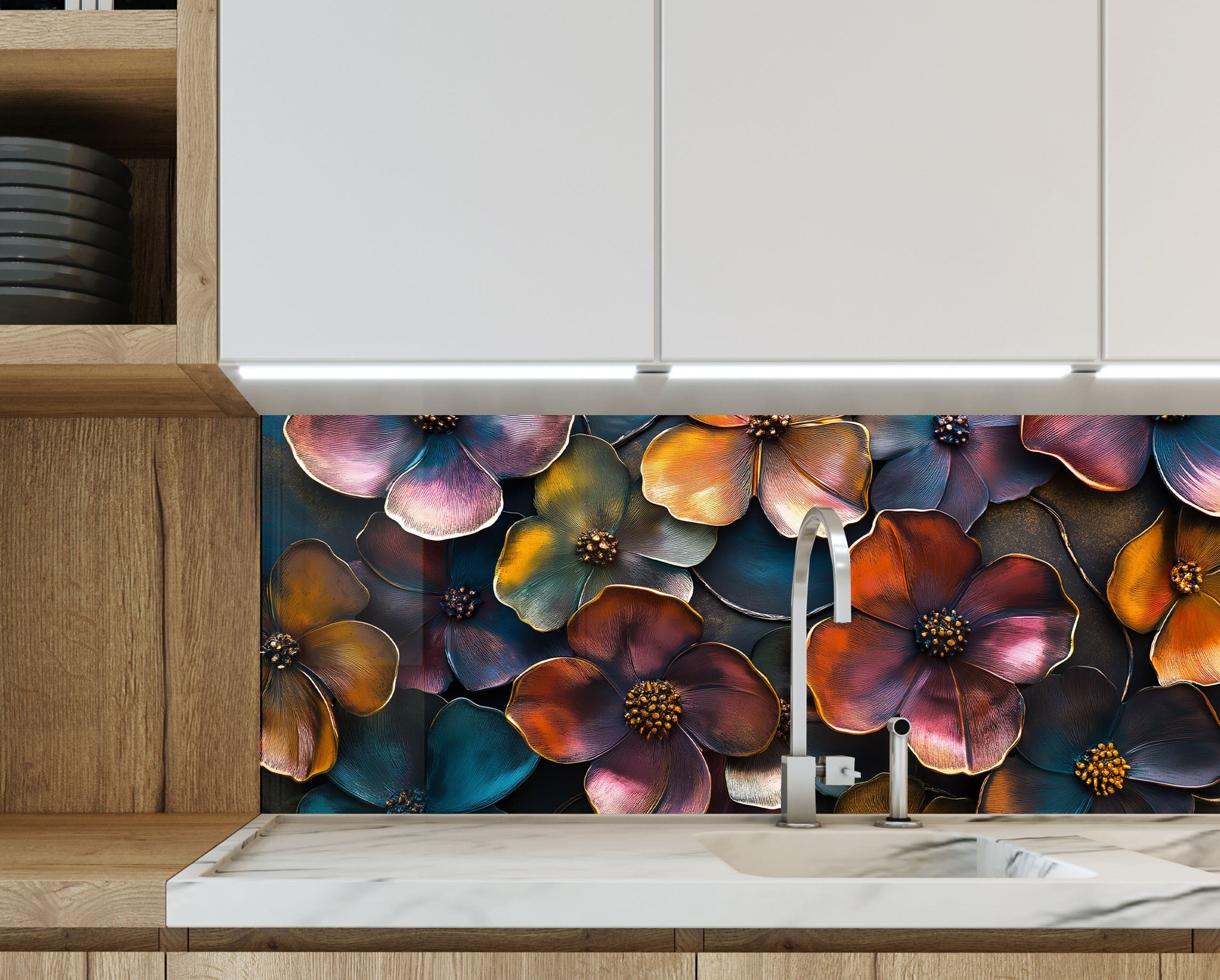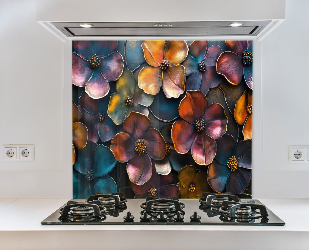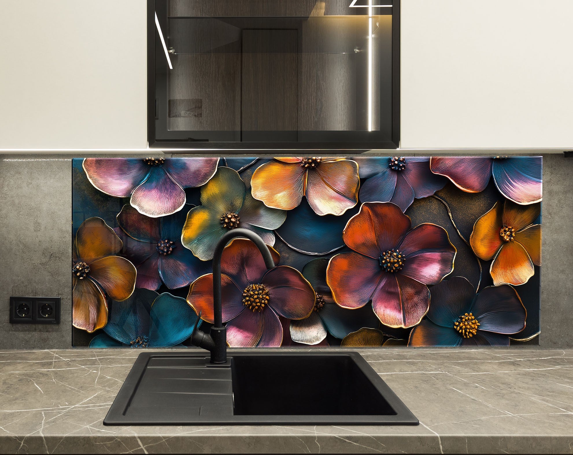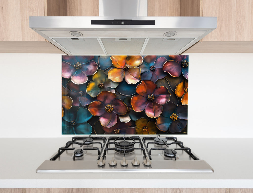 Transform your kitchen into a gallery of blooming sophistication with the Twilight Petals – Multicolor Floral Elegance Glass Kitchen Backsplash. A vivid composition of rich copper, violet, teal, and gold-toned flowers layered across a deep charcoal background brings drama, depth, and luxurious charm to your cooking space. This statement piece exudes artistic flair, making your backsplash a true focal point of design.