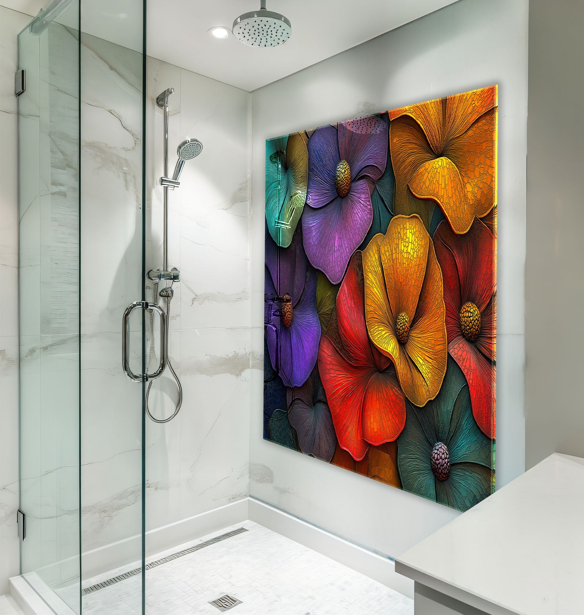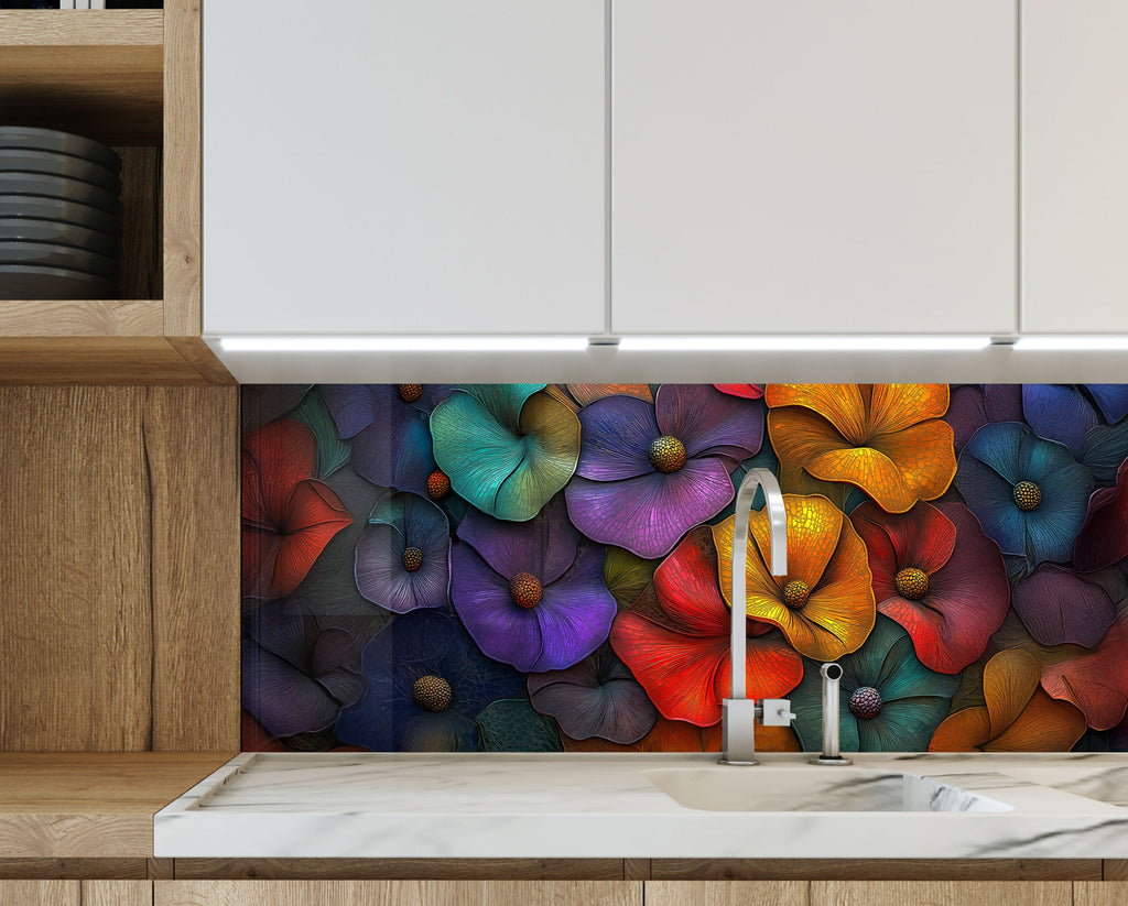 Transform your kitchen into a vibrant oasis with Radiant Bloom, a glass kitchen backsplash bursting with rich, kaleidoscopic floral forms. Bold shades of crimson, violet, tangerine, and teal swirl together in a mesmerizing tapestry of texture and depth. Each petal is detailed with a cracked-glass mosaic effect, adding dimension and drama.