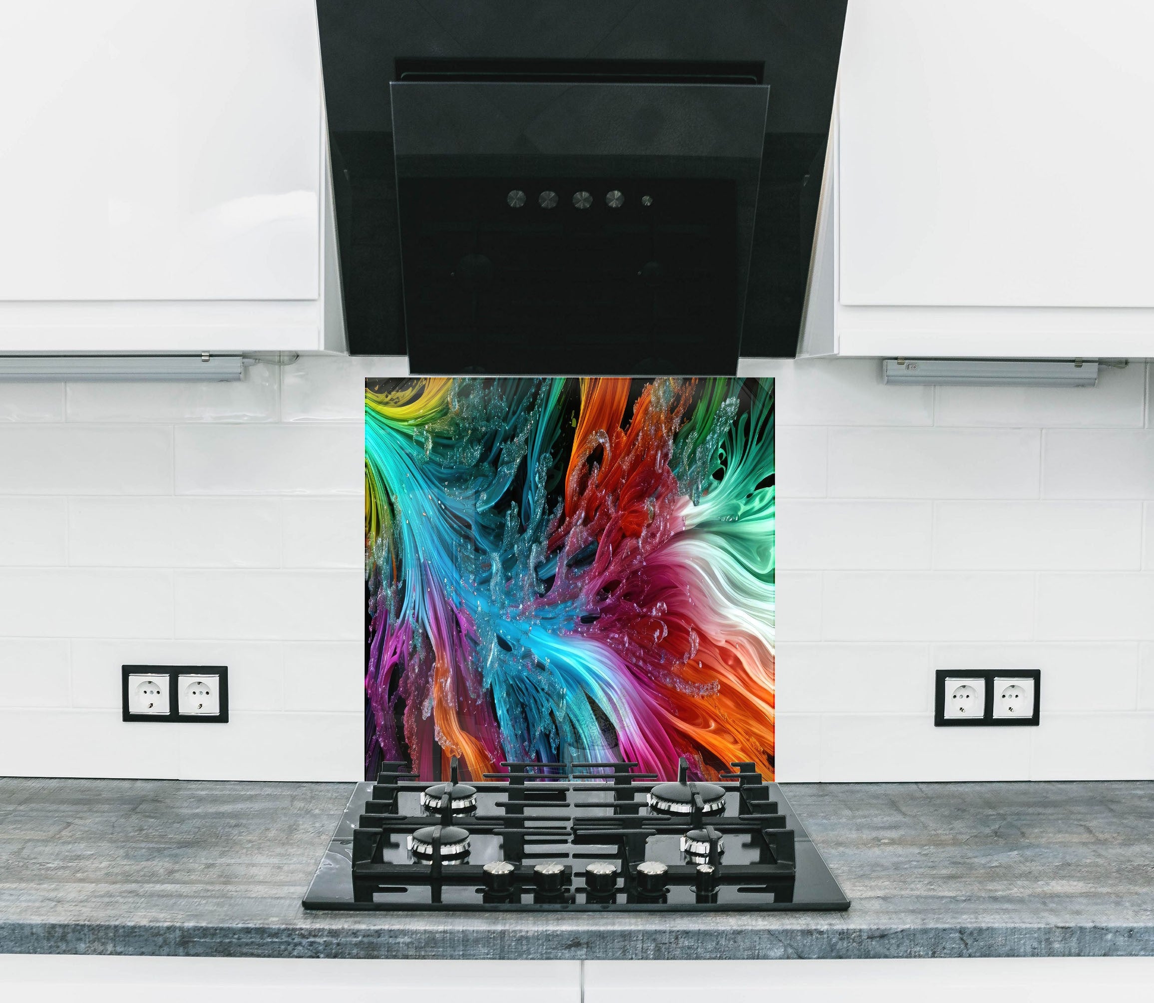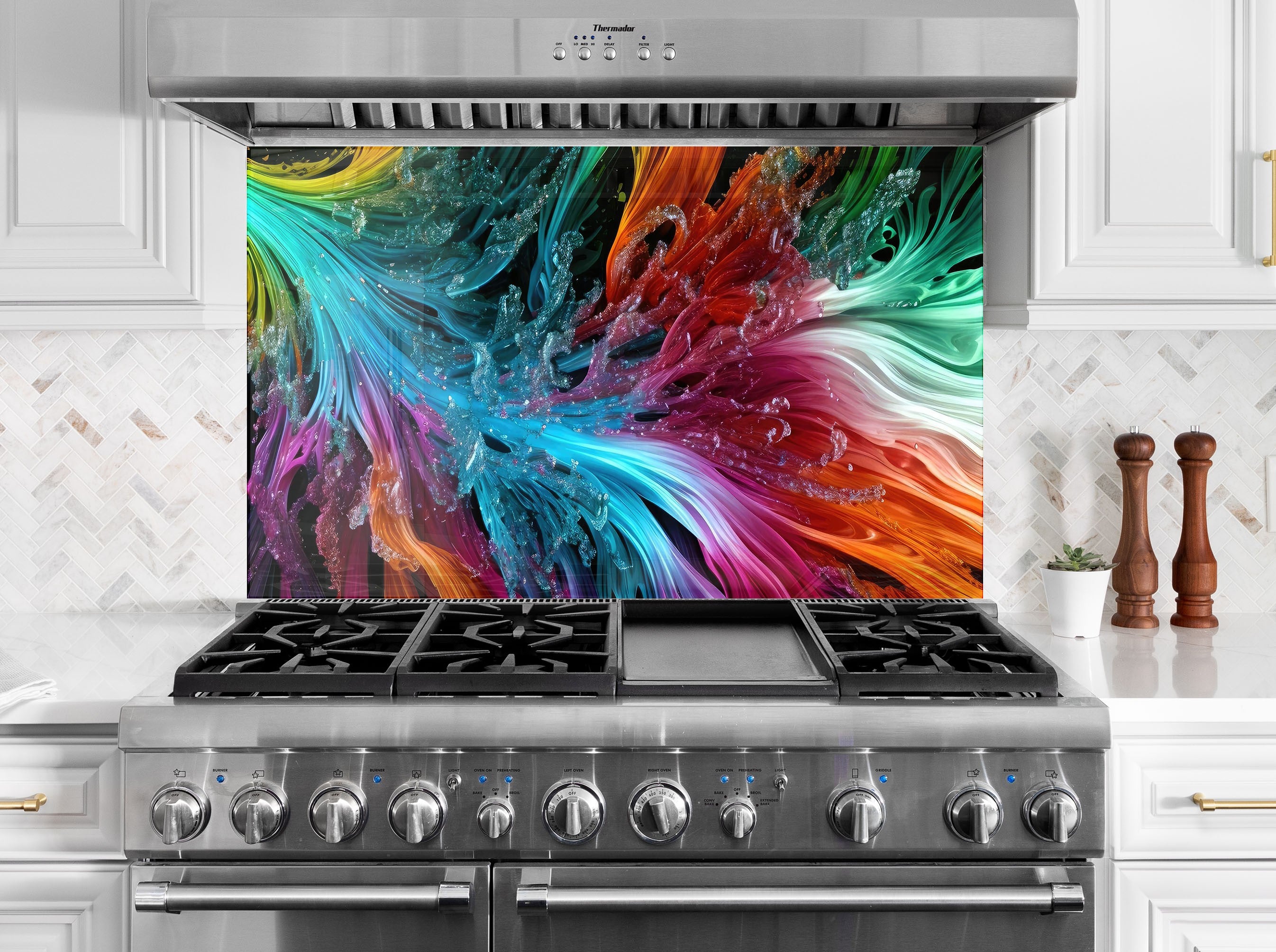 Transform your kitchen with a burst of vibrant color and energy! This Glass Kitchen Backsplash features an explosive swirl of colors – from electric blues and greens to fiery reds and yellows. The playful and dynamic design will bring artistic flair to any space, creating a striking visual focal point.