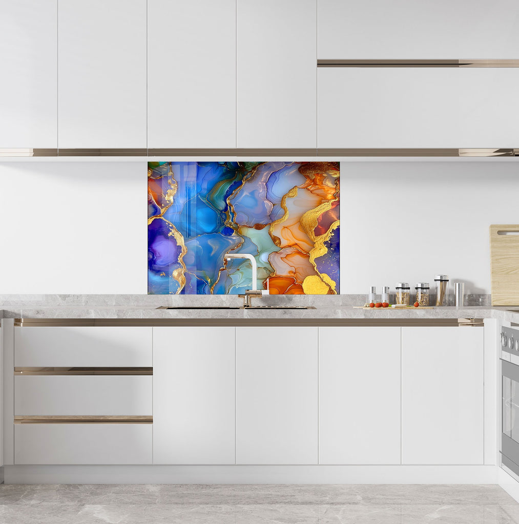 Transform your kitchen with the Vibrant Agate Gold Vein Glass Kitchen Backsplash, a true masterpiece of color and elegance. Featuring 8K high-quality UV printing, this design showcases mesmerizing blue, orange, and violet agate tones, accentuated with gold veining for a luxurious touch. Crafted from 10 times reinforced tempered glass (4mm), this backsplash is heat-resistant, ultra-durable, and finished with a sleek, high-gloss surface.