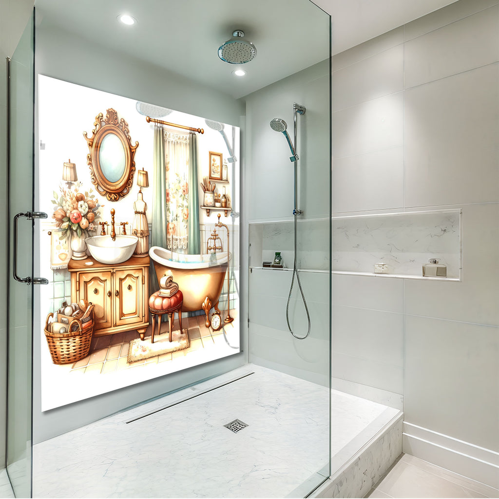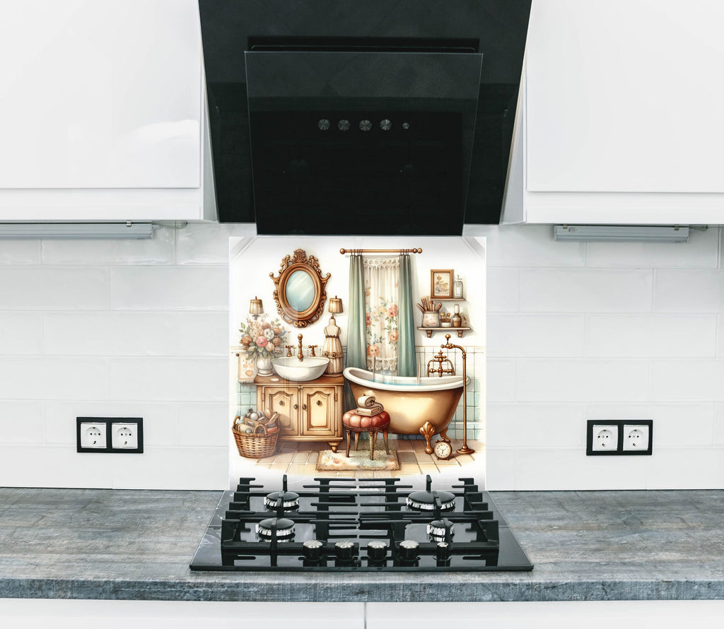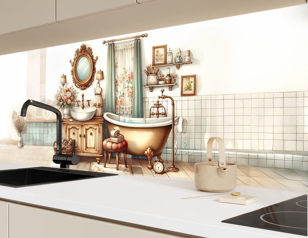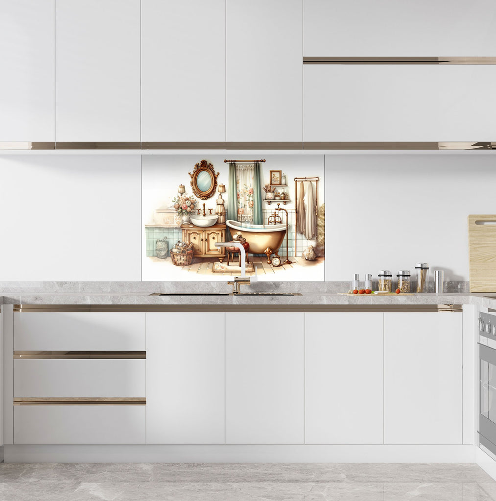 Step into a world of warmth and charm with this Vintage Bathroom Scene Glass Kitchen Backsplash. Featuring soft pastel tones, a clawfoot tub, ornate mirror, and antique furnishings, this design brings countryside serenity into your kitchen. Ideal for creating a nostalgic, homey vibe while adding unique artistic character.
