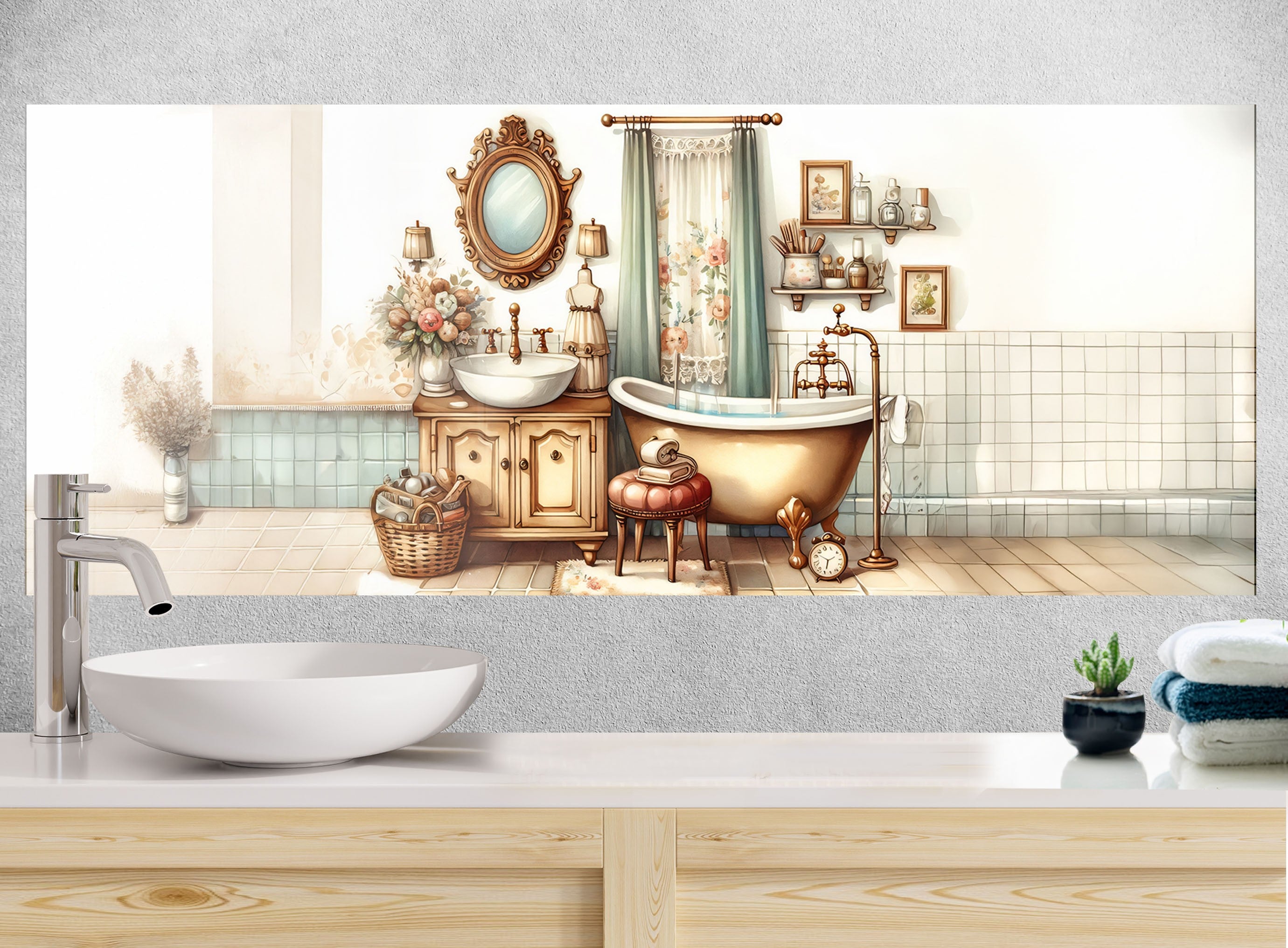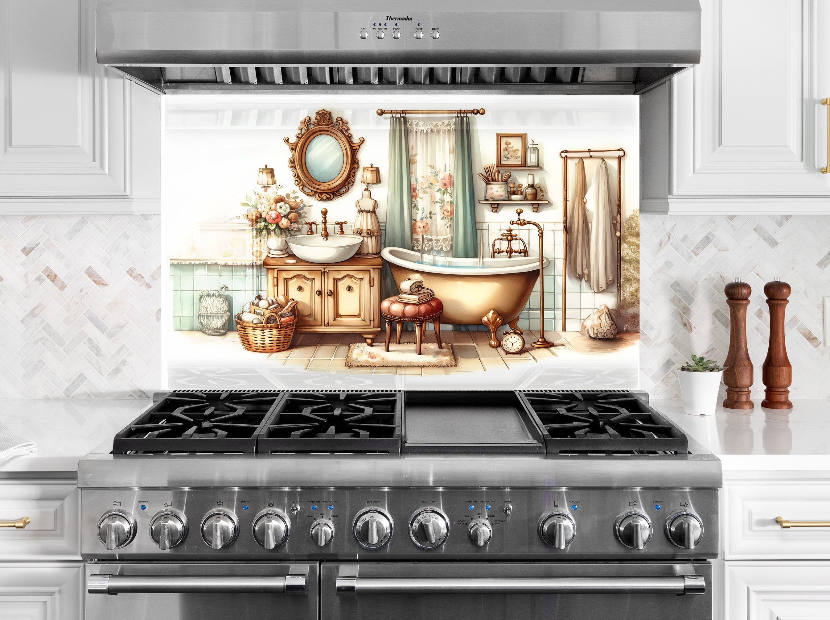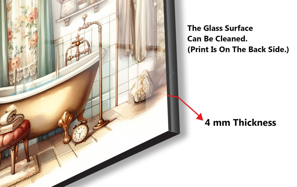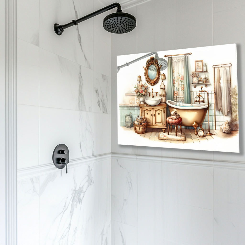 Step into a world of warmth and charm with this Vintage Bathroom Scene Glass Kitchen Backsplash. Featuring soft pastel tones, a clawfoot tub, ornate mirror, and antique furnishings, this design brings countryside serenity into your kitchen. Ideal for creating a nostalgic, homey vibe while adding unique artistic character.
