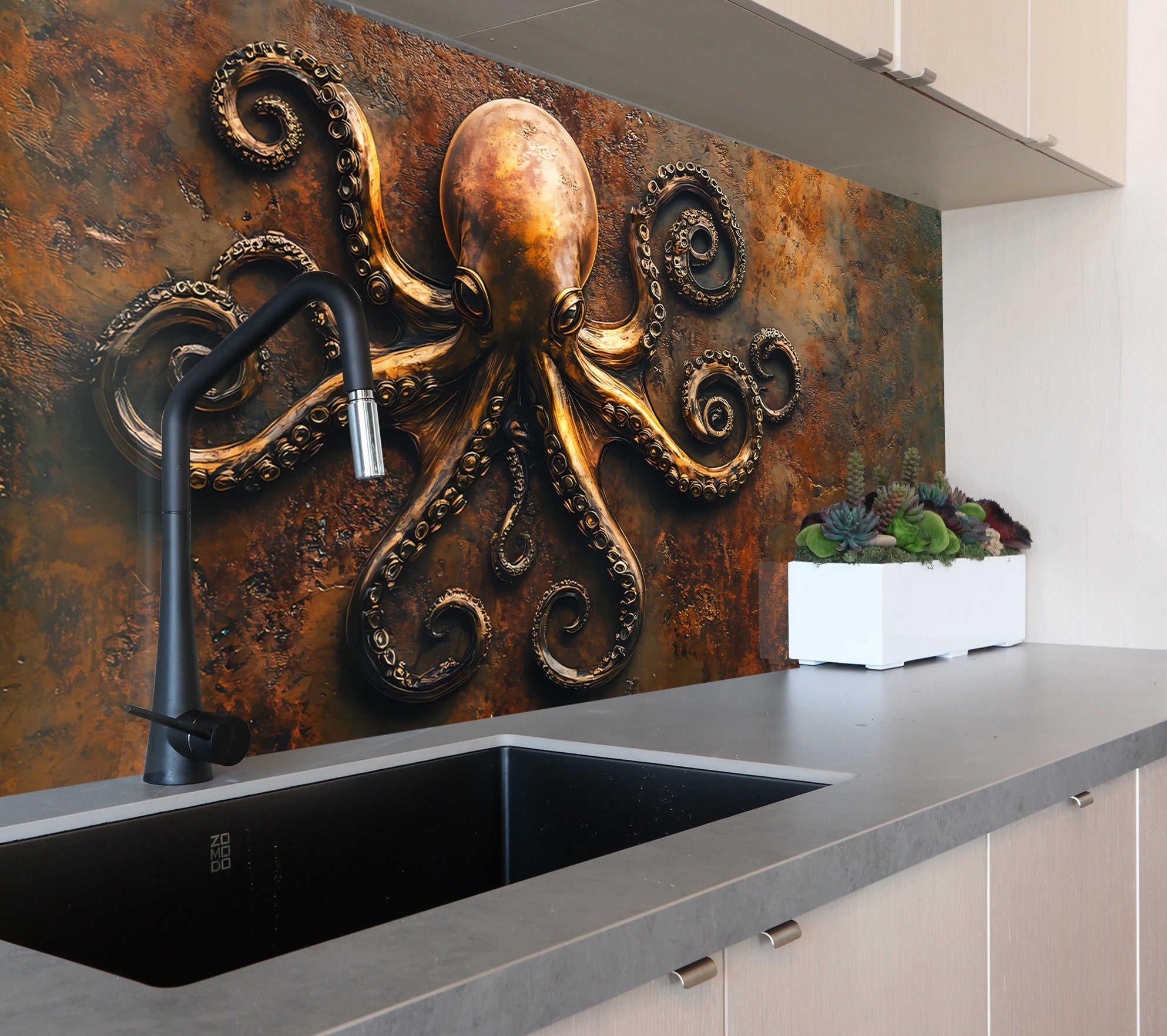 Enhance your kitchen with the Vintage Octopus Glass Backsplash, a bold and dramatic statement piece that blends marine elegance with industrial charm. Featuring an intricately detailed golden octopus, set against a textured, aged metal-inspired background, this backsplash is perfect for ocean lovers, seafood enthusiasts, and nautical-themed interiors. The rustic bronze and copper tones add warmth and depth, making it a luxurious addition to any modern or industrial-style kitchen.