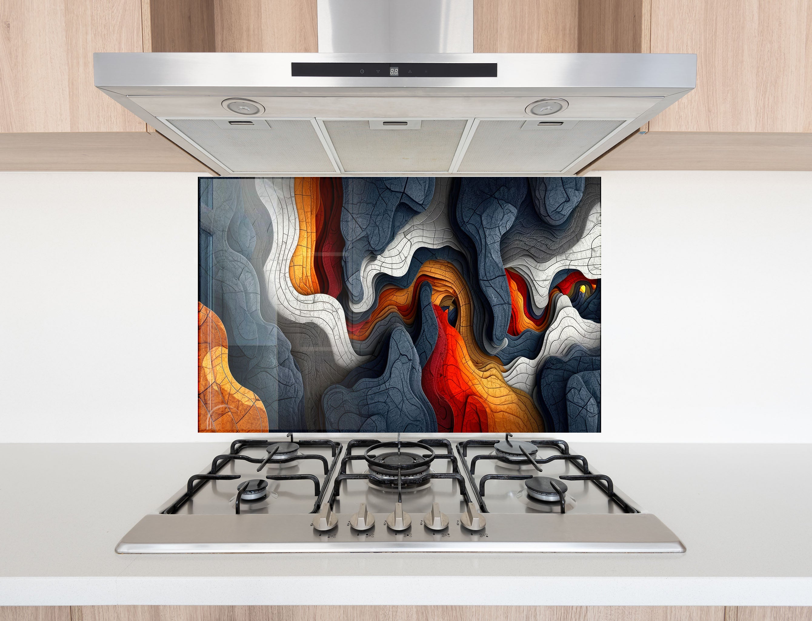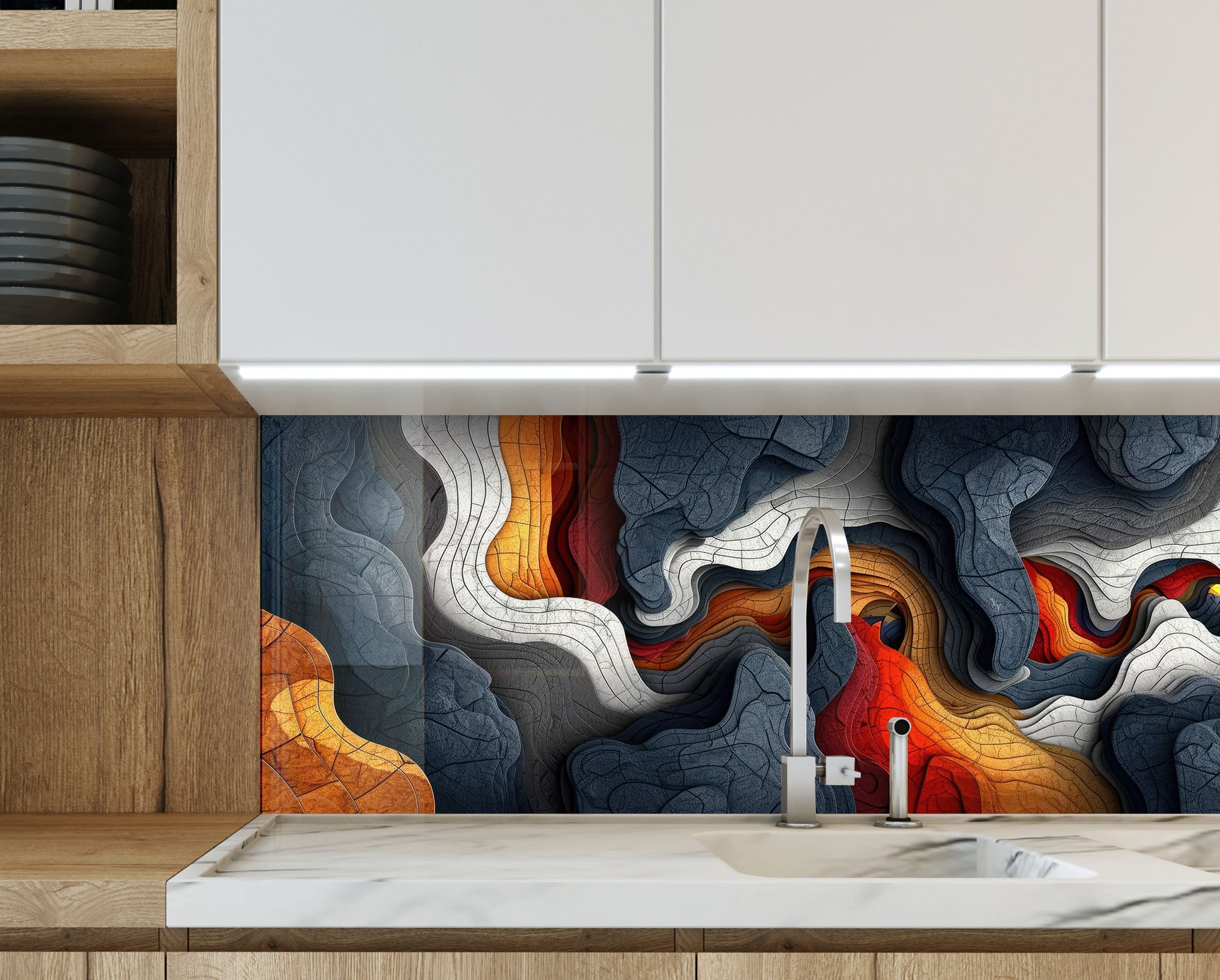 Transform your kitchen into a masterpiece of raw energy and geological beauty with the Volcanic Depths Glass Kitchen Backsplash. This mesmerizing design features intricate, layered textures of molten lava, deep graphite stone, and striking veins of fiery red, orange, and white, creating an intense and captivating atmosphere. The dramatic contrast between smoldering heat and cool rock formations brings a bold and artistic elegance to your space.